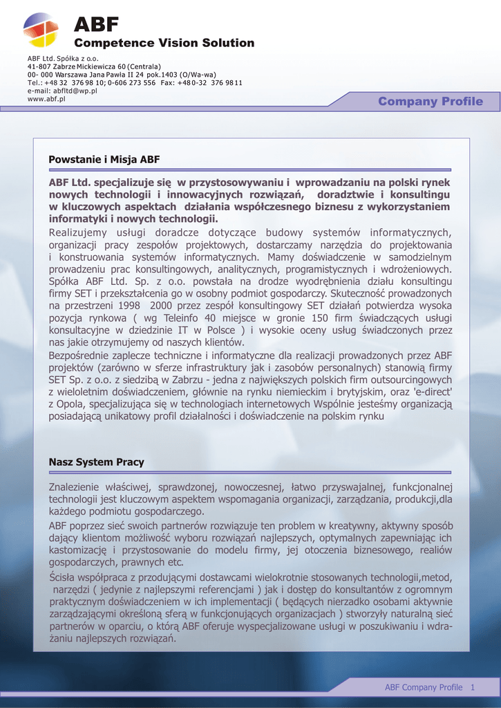 ABF Competence Vision Solution ABF Ltd. Spó³ka z o.o. 41-807 Zabrze Mickiewicza 60 (Centrala) 00- 000 Warszawa Jana Paw ³ a II 24 pok.1403 (O/Wa-wa) Tel.: +48 32 376 98 10; 0-606 273 556 Fax: +48 0-32 376 98 11 e-mail: [email protected] www.abf.pl Company Profile Powstanie i Misja ABF ABF Ltd. specjalizuje siê w przystosowywaniu i wprowadzaniu na polski rynek nowych technologii i innowacyjnych rozwi¹zañ, doradztwie i konsultingu w kluczowych aspektach dzia³ania wspó³czesnego biznesu z wykorzystaniem informatyki i nowych technologii. Realizujemy us³ugi doradcze dotycz¹ce budowy systemów informatycznych, organizacji pracy zespo³ów projektowych, dostarczamy narzêdzia do projektowania i konstruowania systemów informatycznych. Mamy doœwiadczenie w samodzielnym prowadzeniu prac konsultingowych, analitycznych, programistycznych i wdro¿eniowych. Spó³ka ABF Ltd. Sp. z o.o. powsta³a na drodze wyodrêbnienia dzia³u konsultingu firmy SET i przekszta³cenia go w osobny podmiot gospodarczy. Skutecznoœæ prowadzonych na przestrzeni 1998 2000 przez zespó³ konsultingowy SET dzia³añ potwierdza wysoka pozycja rynkowa ( wg Teleinfo 40 miejsce w gronie 150 firm œwiadcz¹cych us³ugi konsultacyjne w dziedzinie IT w Polsce ) i wysokie oceny us³ug œwiadczonych przez nas jakie otrzymujemy od naszych klientów. Bezpoœrednie zaplecze techniczne i informatyczne dla realizacji prowadzonych przez ABF projektów (zarówno w sferze infrastruktury jak i zasobów personalnych) stanowi¹ firmy SET Sp. z o.o. z siedzib¹ w Zabrzu - jedna z najwiêkszych polskich firm outsourcingowych z wieloletnim doœwiadczeniem, g³ównie na rynku niemieckim i brytyjskim, oraz 'e-direct' z Opola, specjalizuj¹ca siê w technologiach internetowych Wspólnie jesteœmy organizacj¹ posiadaj¹c¹ unikatowy profil dzia³alnoœci i doœwiadczenie na polskim rynku Nasz System Pracy Znalezienie w³aœciwej, sprawdzonej, nowoczesnej, ³atwo przyswajalnej, funkcjonalnej technologii jest kluczowym aspektem wspomagania organizacji, zarz¹dzania, produkcji,dla ka¿dego podmiotu gospodarczego. ABF poprzez sieæ swoich partnerów rozwi¹zuje ten problem w kreatywny, aktywny sposób daj¹cy klientom mo¿liwoœæ wyboru rozwi¹zañ najlepszych, optymalnych zapewniaj¹c ich kastomizacjê i przystosowanie do modelu firmy, jej otoczenia biznesowego, realiów gospodarczych, prawnych etc. Œcis³a wspó³praca z przoduj¹cymi dostawcami wielokrotnie stosowanych technologii,metod, narzêdzi ( jedynie z najlepszymi referencjami ) jak i dostêp do konsultantów z ogromnym praktycznym doœwiadczeniem w ich implementacji ( bêd¹cych nierzadko osobami aktywnie zarz¹dzaj¹cymi okreœlon¹ sfer¹ w funkcjonuj¹cych organizacjach ) stworzy³y naturaln¹ sieæ partnerów w oparciu, o któr¹ ABF oferuje wyspecjalizowane us³ugi w poszukiwaniu i wdra¿aniu najlepszych rozwi¹zañ. ABF Company Profile 1 Nasze Kompetencje dodawanie wartoœci innowacje technologiczne na styku biznes / IT analiza i prognozowanie trendów technologicznych i informatycznych opracowywanie strategii i kompleksowych rozwi¹zañ informatycznych koordynacja rozwoju informatyki ze strategi¹ korporacyjn¹ zarz¹dzanie projektami IT zarz¹dzanie ryzykiem w sferze IT audyt i weryfikacja projektów i systemów IT organizacja i informatyczne wspomaganie zarz¹dzania zasobami sta³ymi przedsiêbiorstwa Facilities i Real Estate Management systemy komputerowego wspomagania zarz¹dzania zasobami (CAFM) projektowanie i wdra¿anie systemów informacji zarz¹dczej integracja systemów technologie i strategie e-biznesu / e-commerce / e-procurement strategie internetowe / projektowanie rozwi¹zañ wdra¿anie internetowych rozwi¹zañ informatycznych brainstorming Dodawanie Wartoœci - Fundamentalna Zasada Dzia³ania ABF Koniecznoœæ intensywnych inwestycji wymuszana przez rosn¹c¹ konkurencjê i przenoszeniena rynek polski œwiatowych trendów i innowacji mo¿e spowodowaæ niekontrolowan¹ spiralê wydatków, przeinwestowanie i w efekcie znaczne pogorszenie sytuacji ekonomicznej firmy. Jak¹ zatem zastosowaæ strategiê aby utrzymaæ siê na rynku i rozwijaæ siê ponosz¹c rozs¹dne koszty tego rozwoju ? Jedn¹ ze skutecznych odpowiedzi i co niezmiernie wa¿ne, mieszcz¹c¹ siê w granicach mo¿liwoœci inwestycyjnych, jest opracowanie pomys³u optymalnego wykorzystania istniej¹cych zasobów firmy w po³¹czeniu z niezbêdnymi inwestycjami technologicznymi. Uzupe³nianie i Optymalizacja Wykorzystania Zasobów Nastêpuje Poprzez Procesy Nazwane Dodawaniem Wartoœci. Podstaw¹ procesów jest ³¹czenie dotychczasowego dorobku przedsiêbiorstw, ich wyposa¿enia technicznego, doœwiadczenia, pozycji na rynku z nowymi rozwi¹zaniami technologicznymi i informatycznymi. Obecnie posiadane zasoby nawet, jeœli nie s¹ najnowoczeœniejsze mog¹ nadal nieŸle spe³niaæ swoj¹ rolê, jeœli zostan¹ uzupe³nione o nowsze rozwi¹zania a ich rola ponownie zdefiniowana i ulokowana w szczegó³owo opracowanej strukturze organizacyjno technicznej. Dodawanie Wartoœci jest rozbudowanym procesem ujêtym w ramy metodologiczne (w wypadku ABF Ltd jest to Ardes RM firmy DDI, USA) maj¹cym na celu uœwiadomienie firmie jej mo¿liwoœci przede wszystkim poprzez analizê stanu posiadania i wiedzy wewnêtrznej oraz propozycjê uzupe³nieñ i dzia³añ rozwojowych w sferze organizacyjnej i technologicznej. ABF Company Profile 2 Wynikiem prawid³owo przeprowadzonego procesu jest: redefinicja pozycji rynkowej firmy, optymalna kosztowo modernizacja w oparciu o kompleksow¹ strategiê i wizjê na przysz³oœæ, nowe spojrzenie na przedsiêbiorstwo, mechanizmy jego dzia³ania, znalezienie obszarów oszczêdnoœci, potencjalnych pól rozwoju oraz Ÿróde³ pozyskania przewagi konkurencyjnej. Ka¿da firma ma swój sztab fachowców od organizacji i zarz¹dzania pocz¹wszy, poprzez finanse na technologii i informatyce koñcz¹c. Nikt lepiej od nich nie zna specyfiki organizacji, któr¹ kieruj¹ a ich wiedza i
