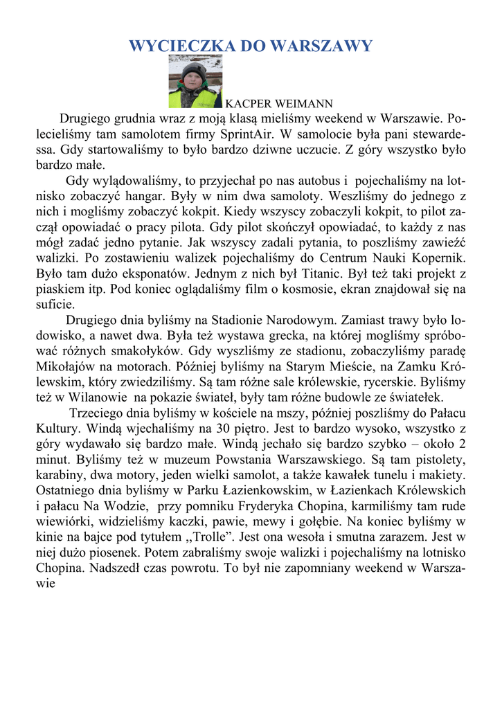 WYCIECZKA DO WARSZAWY KACPER WEIMANN Drugiego grudnia wraz z moją klasą mieliśmy weekend w Warszawie. Polecieliśmy tam samolotem firmy SprintAir. W samolocie była pani stewardessa. Gdy startowaliśmy to było bardzo dziwne uczucie. Z góry wszystko było bardzo małe. Gdy wylądowaliśmy, to przyjechał po nas autobus i pojechaliśmy na lotnisko zobaczyć hangar. Były w nim dwa samoloty. Weszliśmy do jednego z nich i mogliśmy zobaczyć kokpit. Kiedy wszyscy zobaczyli kokpit, to pilot zaczął opowiadać o pracy pilota. Gdy pilot skończył opowiadać, to każdy z nas mógł zadać jedno pytanie. Jak wszyscy zadali pytania, to poszliśmy zawieźć walizki. Po zostawieniu walizek pojechaliśmy do Centrum Nauki Kopernik. Było tam dużo eksponatów. Jednym z nich był Titanic. Był też taki projekt z piaskiem itp. Pod koniec oglądaliśmy film o kosmosie, ekran znajdował się na suficie. Drugiego dnia byliśmy na Stadionie Narodowym. Zamiast trawy było lodowisko, a nawet dwa. Była też wystawa grecka, na której mogliśmy spróbować różnych smakołyków. Gdy wyszliśmy ze stadionu, zobaczyliśmy paradę Mikołajów na motorach. Później byliśmy na Starym Mieście, na Zamku Królewskim, który zwiedziliśmy. Są tam różne sale królewskie, rycerskie. Byliśmy też w Wilanowie na pokazie świateł, były tam różne budowle ze światełek. Trzeciego dnia byliśmy w kościele na mszy, później poszliśmy do Pałacu Kultury. Windą wjechaliśmy na 30 piętro. Jest to bardzo wysoko, wszystko z góry wydawało się bardzo małe. Windą jechało się bardzo szybko – około 2 minut. Byliśmy też w muzeum Powstania Warszawskiego. Są tam pistolety, karabiny, dwa motory, jeden wielki samolot, a także kawałek tunelu i makiety. Ostatniego dnia byliśmy w Parku Łazienkowskim, w Łazienkach Królewskich i pałacu Na Wodzie, przy pomniku Fryderyka Chopina, karmiliśmy tam rude wiewiórki, widzieliśmy kaczki, pawie, mewy i gołębie. Na koniec byliśmy w kinie na bajce pod tytułem ,,Trolle”. Jest ona wesoła i smutna zarazem. Jest w niej dużo piosenek. Potem zabraliśmy swoje walizki i pojechaliśmy na lotnisko Chopina. Nadszedł czas powrotu. To był nie zapomniany weekend w Warszawie
