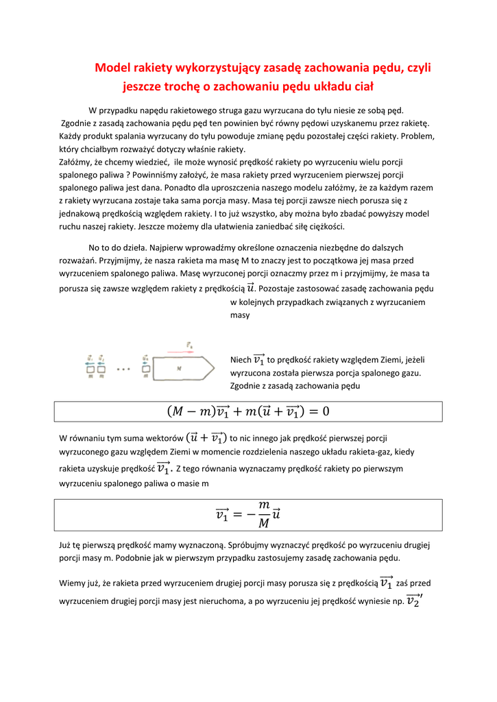 Model rakiety wykorzystujący zasadę zachowania pędu, czyli jeszcze trochę o zachowaniu pędu układu ciał W przypadku napędu rakietowego struga gazu wyrzucana do tyłu niesie ze sobą pęd. Zgodnie z zasadą zachowania pędu pęd ten powinien byd równy pędowi uzyskanemu przez rakietę. Każdy produkt spalania wyrzucany do tyłu powoduje zmianę pędu pozostałej części rakiety. Problem, który chciałbym rozważyd dotyczy właśnie rakiety. Załóżmy, że chcemy wiedzied, ile może wynosid prędkośd rakiety po wyrzuceniu wielu porcji spalonego paliwa ? Powinniśmy założyd, że masa rakiety przed wyrzuceniem pierwszej porcji spalonego paliwa jest dana. Ponadto dla uproszczenia naszego modelu załóżmy, że za każdym razem z rakiety wyrzucana zostaje taka sama porcja masy. Masa tej porcji zawsze niech porusza się z jednakową prędkością względem rakiety. I to już wszystko, aby można było zbadad powyższy model ruchu naszej rakiety. Jeszcze możemy dla ułatwienia zaniedbad siłę ciężkości. No to do dzieła. Najpierw wprowadźmy określone oznaczenia niezbędne do dalszych rozważao. Przyjmijmy, że nasza rakieta ma masę M to znaczy jest to początkowa jej masa przed wyrzuceniem spalonego paliwa. Masę wyrzuconej porcji oznaczmy przez m i przyjmijmy, że masa ta porusza się zawsze względem rakiety z prędkością ⃗ . Pozostaje zastosowad zasadę zachowania pędu w kolejnych przypadkach związanych z wyrzucaniem masy Niech ⃗⃗⃗⃗ to prędkośd rakiety względem Ziemi, jeżeli wyrzucona została pierwsza porcja spalonego gazu. Zgodnie z zasadą zachowania pędu ( )⃗⃗⃗⃗ (⃗ ⃗⃗⃗⃗ ) W równaniu tym suma wektorów ( ⃗ ⃗⃗⃗⃗ ) to nic innego jak prędkośd pierwszej porcji wyrzuconego gazu względem Ziemi w momencie rozdzielenia naszego układu rakieta-gaz, kiedy rakieta uzyskuje prędkośd ⃗⃗⃗⃗ . Z tego równania wyznaczamy prędkośd rakiety po pierwszym wyrzuceniu spalonego paliwa o masie m ⃗⃗⃗⃗ ⃗ Już tę pierwszą prędkośd mamy wyznaczoną. Spróbujmy wyznaczyd prędkośd po wyrzuceniu drugiej porcji masy m. Podobnie jak w pierwszym przypadku zastosujemy zasadę zachowania pędu. Wiemy już, że rakieta przed wyrzuceniem drugiej porcji masy porusza się z prędkością ⃗⃗⃗⃗ zaś przed wyrzuceniem drugiej porcji masy jest nieruchoma, a po wyrzuceniu jej prędkośd wyniesie np. ⃗⃗⃗⃗ Korzystając z wcześniej wyprowadzonego wzoru wystarczy zauważyd, że możemy zamienid masę duże M przez M-m, a ⃗⃗⃗⃗ na ⃗⃗⃗⃗ dostajemy ⃗⃗⃗⃗ ⃗ Dlatego prędkośd rakiety po wyrzuceniu drugiej porcji masy względem Ziemi będzie powiększona o prędkośd tej wyrzuconej porcji masy. Uzyskamy następujące wyrażenia dla rakiety po wyrzuceniu dopiero drugiej części masy m ⃗⃗⃗⃗ ⃗⃗⃗⃗ ⃗⃗⃗⃗ ⃗ ( ) Uzyskaliśmy wzór, który w naszym modelu rakiety wystarcza na obliczenie prędkości, jaką uzyskuje lecąca rakieta względem Ziemi po zaledwie drugim wyrzuceniu określonej porcji masy spalonego paliwa. Co zrobid, aby uzyskad odpowiedź na pytanie. Jaka będzie prędkośd tej rakiety po wyrzuceniu wielu takich porcji ? Jak widad wzór ten powinniśmy zmienid w taki sposób, aby spełniał nasze wymagania i uwzględniał wyrzucenie wielu porcji o jednakowej masie. Załóżmy, że tych porcji jest skooczona ilośd i oznaczmy ilośd tych porcji przez n. Wówczas dostajemy po n wyrzuconych masach następujące wyrażenie na prędkośd jaką uzyska rakieta względem Ziemi ⃗⃗⃗⃗⃗⃗ ⃗⃗⃗ ( ( ) ) Równanie to ma charakter wektorowy, ale to nie szkodzi, bo w łatwy sposób uzyskamy wartośd prędkości dla naszej rakiety po ostatnim wyrzuceniu masy. W tym celu przyjmujemy kierunek ruchu rakiety w prawo jako dodatni (patrz rysunek) i wtedy dostajemy wzór ∑ Gdzie k jest wskaźnikiem sumy związanym z kolejnymi wyrzucanymi masami Suma we wzorze jest związana z powiększaniem wartości prędkości naszej rakiety po wyrzucaniu kolejnych porcji spalonego gazu. Model nasz można rozszerzyd na przypadek rakiety już lecącej wcześniej ze stałą prędkością V. Wówczas prędkośd naszej rakiety będzie oczywiście wynosiła ∑ ( ( ) ) Pozostaje jeszcze rozważyd przypadek, w którym wyrzucona zostaje cała masa spalonego paliwa za pierwszym razem z taką samą prędkością ⃗ jak każda z wcześniejszych wyrzucanych mas. Nie będziemy zajmowad się postacią wektorową, ale znajdziemy wartośd prędkości po wyrzuceniu tej masy całkowitej za pierwszym razem. Wykorzystamy fakt, że rakieta poruszała się wcześniej ze stałą prędkością V względem Ziemi. Korzystamy w tym celu z zapisania zasady zachowania pędu dla układu ciał ( A stąd znajdujemy szukaną prędkośd Łatwo jest zauważyd, że ) ( ) - prędkośd rakiety po wyrzuceniu masy całkowitej . Ten wynik związany jest z założeniem, że prędkośd wyrzutu spalonych gazów z rakiety względem nieruchomego układu odniesienia(Ziemi) jest równa V-u. W rzeczywistości prędkośd wyrzutu paliwa ulega zmniejszeniu(stała prędkośd wyrzutu paliwa względem rakiety). Bardziej realnie opisuje ruch rakiety wyrażenie na prędkośd