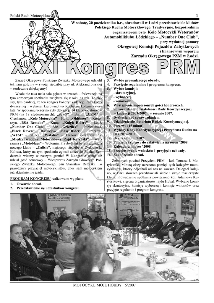 Polski Ruch Motocyklowy 3 W sobotę, 20 października b.r., obradowali w Łodzi przedstawiciele klubów Polskiego Ruchu Motocyklowego. Tradycyjnie, bezpośrednim organizatorem było Koło Motocykli Weteranów Automobilklubu Łódzkiego – „Number One Club”, przy wydatnej pomocy Okręgowej Komisji Pojazdów Zabytkowych i finansowym wsparciu Zarządu Okręgowego PZM w Łodzi. Zarząd Okręgowy Polskiego Związku Motorowego udzielił też nam gościny w swojej siedzibie przy ul. Aleksandrowskiej – serdecznie dziękujemy! Wcale nie taka mała sala pękała w szwach – frekwencja na tym corocznym spotkaniu zwiększa się z roku na rok. To cieszy, tym bardziej, że ten kongres kończył kadencję Rady koordynacyjnej i wybierał kierownictwo Ruchu na kolejne cztery lata. W spotkaniu uczestniczyły delegacje 14 klubów-członków PRM (na 18 sfederowanych): „Sokół” – Bralin, „CKM” – Ciechanów, „Koło Motocykla” – Koło, „Oldtimer” – Krotoszyn, „BSA Remake” – Kutno, „Knigh Riders” – Łódź, „Number One Club” – Łódź, „Grizzlies” – Pobiedziska, „Black Raven” – Radziejów, „Easy Rider” – Ozorków, „WFM” – Słupca, „Wataha” – Tarnów, stowarzyszenie „Międzynarodowy Motocyklowy Rajd Katyński” – Warszawa i „Motoblues” – Wołomin. Przybyła także reprezentacja nowego klubu – „Calisia”, mającego siedzibę w Żydowie k. Kalisza, który na tym spotkaniu zgłosił akces do Ruchu. Serdecznie witamy w naszym gronie! W Kongresie wziął też udział gość honorowy – Wiceprezes Zarządu Głównego Polskiego Związku Motorowego, pan Stanisław Reterski. To prawdziwy przyjaciel motocyklistów, choć sam motocyklem już aktualnie nie jeździ. PROGRAM KONGRESU realizowano wg planu: 1. Otwarcie obrad. 2. Przedstawienie się uczestników kongresu. 3. 4. 5. 6. 7. 8. 9. 10. 11. 12. 13. 14. 15. 16. Wybór prowadzącego obrady. Przyjęcie regulaminu i programu kongresu. Wybór komisji: - skrutacyjnej, - wyborczej, - wniosków. Wystąpienie zaproszonych gości honorowych. Sprawozdanie z działalności Rady Koordynacyjnej w kadencji 2003-2007 i w sezonie 2007. Dyskusja nad sprawozdaniem. Udzielenie absolutorium Radzie Koordynacyjnej. Przerwa (15 minut). Wybory Rady Koordynacyjnej i Prezydenta Ruchu na lata 2007-2011. Ocena sezonu ’2007 Potrzeby i sprawy do załatwienia na sezon ’2008. Kalendarz imprez ’2008. Przegłosowanie wniosków i przyjęcie uchwały. Zakończenie obrad. Zebranych powitał Prezydent PRM – kol. Tomasz J. Motylewski. Minutą ciszy uczczono pamięć tych kolegów motocyklistów, którzy odjechali od nas na zawsze. Delegaci kolejno, w kilku słowach przedstawiali siebie i swoje macierzyste kluby. Prowadzenie spotkania powierzono kol. Adamowi Kustosikowi, z grona organizatorów rajdu Hubal. Wybrano komisję skrutacyjną, komisję wyborczą i komisję wniosków oraz przyjęto regulamin i program kongresu. MOTOCYKL MOJE HOBBY 6/2007 4 Polski Ruch Motocyklowy Na wstępie poproszono o zabranie głosu gościa z ZG PZM, pana Stanisława Reterskiego. Podziękował on za zaproszenie na spotkanie i powiedział, że, jako opiekuna turystyki i zabytków w PZM, interesuje go stały kontakt i współpraca z Polskim Ruchem Motocyklowym w szerokim zakresie tego słowa. PZM nadal będzie wspierał nasz biuletyn i chętnie by współpracował także przy organizacji większej ilości imprez np. przy Rozpoczęciu Sezonu Motocyklowego na Jasnej Górze, czy Rajdzie Katyńskim. Zasugerował, aby jeszcze bardziej zacieśnić współpracę PRM – PZM, np. przez podpisanie stosownych porozumień. Prezes powiedział, że widzi możliwości współpracy z Ruchem nie tylko na niwie zabytków, ale też m.in., w BRD. Polecał nawiązanie współpracy z p. Robertem Werle – prezesem Automobilklubu Wielkopolskiego i np. wykorzystanie w naszych imprezach Toru Poznań. Także Tor Kielce mógłby byś wykorzystany do ewentualnej przyszłej dużej, wspólnej imprezy PZM-PRM. Prezes obiecał też wkrótce przekazać szersze informacje o Zlocie FIM Rally i zachęcał kluby z PRM-u do wzięcia w nim udziału. Trzeba wyraźnie powiedzieć, że w zeszłym roku, właśnie dzięki poparciu p. Reterskiego, część naszych postulatów do Głównej Komisji Pojazdów Zabytkowych została załatwiona pozytywnie. Teraz kolej na pozostałe. Sprawozdanie Rady Koordynacyjnej PRM rozpoczął Prezydent Ruchu, kol. Józef Tomasz Motylewski. Stwierdził, że ta kadencja była bardzo owocna – umocniła pozycję PRM w środowisku motocyklistów. Po słynnym spotkaniu na zimowym bazarze w Łodzi w 2003 r., z klubami „MC” utrzymujemy poprawne kontakty, oparte na wzajemnym poszanowaniu i pokojowym współistnieniu. Także władze, inne instytucje i organizacje społeczne widzą nas i szanują. Nasze kluby robią znakomite imprezy których ocena raczej nigdy nie spada poniżej 4,0 w pięciopunktowej skali. Następnie głos zabrał Sekretarz Rady Koordynacyjnej – kol. Piotr „Besa” Czech, który przedstawił oficjalne sprawozdanie z pracy Rady Koordynacyjnej w kadencji 2003-2007. W okresie 26.X.2003 – 20.X.2007 Rada Koordynacyjna PRM pracowała w składzie: MOTOCYKL MOJE HOBBY 6/2007 Polski Ruch Motocyklowy 5 - Józef Tomasz Motylewski – Prezydent Ruchu, - Bogdan Skonieczka – V-Prezydent ds. motocykli ciężkich, - Sławomir Wnuk – V-Prezydent ds. motocykli zab., - Piotr Czech – sekretarz Rady Koordynacyjnej. Przedmiotem pracy Rady w tej kadencji były: - Koordynacja terminów imprez zgłaszanych do kalendarza. - Dbanie o dobre imię i propagowanie Polskiego Ruchu Motocyklowego. - Założenie i prowadzenie strony internetowej. - Prowadzenie punktu konsultacyjnego na Bazarach i w Sekretariacie RK - Współpraca z Polskim Związkiem Motorowym. - Wydawanie biuletynu Motocykl Moje Hobby”. - Współpraca z innymi redakcjami. - Wprowadzenie legitymacji dla członków klubów PRM, upoważniających do ulgowego wpisowego na imprezac