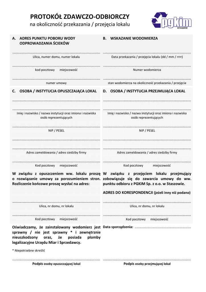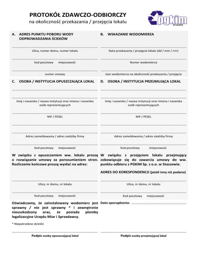 PROTOKÓŁ ZDAWCZO-ODBIORCZY na okoliczność przekazania / przejęcia lokalu A. ADRES PUNKTU POBORU WODY ODPROWADZANIA ŚCIEKÓW B. WSKAZANIE WODOMIERZA ............................................................................................ ............................................................................................ Ulica, numer domu, numer lokalu Data przekazania / przejęcia lokalu (dd / mm / rrrr) ............................................................................................ ............................................................................................ kod pocztowy miejscowość Numer wodomierza ............................................................................................ ............................................................................................ numer umowy C. OSOBA / INSTYTUCJA OPUSZCZAJĄCA LOKAL stan wodomierza na okoliczność przekazania / przejęcia D. OSOBA / INSTYTUCJA PRZEJMUJĄCA LOKAL ............................................................................................ ............................................................................................ ............................................................................................ ............................................................................................ Imię i nazwisko / nazwa instytucji oraz imiona i nazwiska osób reprezentujących Imię i nazwisko / nazwa instytucji oraz imiona i nazwiska osób reprezentujących ............................................................................................ ............................................................................................ NIP / PESEL NIP / PESEL ............................................................................................ ............................................................................................ ............................................................................................ ............................................................................................ Adres zameldowania / adres siedziby firmy Adres zameldowania / adres siedziby firmy ............................................................................................ ............................................................................................ Kod pocztowy miejscowość Kod pocztowy miejscowość W związku z opuszczeniem ww. lokalu proszę W związku z przejęciem lokalu przejmujący o rozwiązanie umowy za porozumieniem stron. zobowiązuje się do zawarcia umowy do ww. Rozliczenie końcowe proszę wysłać na adres: punktu odbioru z PGKiM Sp. z o.o. w Staszowie. ADRES DO KORESPONDENCJI (jeżeli inny niż podano) ............................................................................................ ............................................................................................ Ulica, nr domu, nr lokalu Ulica, nr domu, nr lokalu ............................................................................................ ............................................................................................ Kod pocztowy miejscowość Kod pocztowy miejscowość Oświadczamy, że zainstalowany wodomierz jest Data sporządzenia: ........................................................... sprawny / nie jest sprawny * i zewnętrznie nieuszkodzony oraz, że posiada plomby legalizacyjne Urzędu Miar i Sprzedawcy. * Niepotrzebne skreślić ............................................................................................ ............................................................................................ Podpis osoby przejmującej lokal Podpis osoby opuszczającej lokal