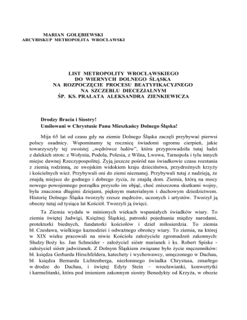 MARIAN GOŁĘBIEWSKI ARCYBISKUP METROPOLITA WROCŁAWSKI LIST METROPOLITY WROCŁAWSKIEGO DO WIERNYCH DOLNEGO ŚLĄSKA NA ROZPOCZĘCIE PROCESU BEATYFIKACYJNEGO NA SZCZEBLU DIECEZJALNYM ŚP. KS. PRAŁATA ALEKSANDRA ZIENKIEWICZA Drodzy Bracia i Siostry! Umiłowani w Chrystusie Panu Mieszkańcy Dolnego Śląska! Mija 65 lat od czasu gdy na ziemie Dolnego Śląska zaczęli przybywać pierwsi polscy osadnicy. Wspominamy tę rocznicę świadomi ogromu cierpień, jakie towarzyszyły tej swoistej „wędrówce ludów”, która przyprowadziła tutaj ludzi z dalekich stron: z Wołynia, Podola, Polesia, z Wilna, Lwowa, Tarnopola i tylu innych miejsc dawnej Rzeczypospolitej. Żyją jeszcze pośród nas świadkowie czasu rozstania z ziemią rodzinną, ze swojskim widokiem kraju dzieciństwa, przydrożnych krzyży i kościelnych wież. Przybywali oni do ziemi nieznanej. Przybywali tutaj z nadzieją, że znajdą miejsce do godnego i dobrego życia, że znajdą dom. Ziemia, którą na mocy nowego powojennego porządku przyszło im objąć, choć zniszczona skutkami wojny, była znaczona długimi dziejami, pięknym materialnym i duchowym dziedzictwem. Historię Dolnego Śląska tworzyły rzesze mędrców, uczonych i artystów. Tworzył ją obecny tutaj od tysiąca lat Kościół. Tworzyli ją święci. Ta Ziemia wydała w minionych wiekach wspaniałych świadków wiary. To ziemia świętej Jadwigi, Księżnej Śląskiej, patronki pojednania między narodami, protektorki biednych, fundatorki kościołów i dzieł miłosierdzia. To ziemia bł. Czesława, wielkiego kaznodziei i odważnego obrońcy wiary. To ziemia, na której w XIX wieku pracowali na niwie Kościoła założyciele zgromadzeń zakonnych: Słudzy Boży ks. Jan Schneider - założyciel sióstr marianek i ks. Robert Spiske założyciel sióstr jadwiżanek. Z Dolnym Śląskiem związane było życie męczenników: bł. księdza Gerharda Hirschfeldera, katechety i wychowawcy, umęczonego w Dachau, bł. księdza Bernarda Lichtenberga, niezłomnego świadka Chrystusa, zmarłego w drodze do Dachau, i świętej Edyty Stein – wrocławianki, konwertytki i karmelitanki, która pod imieniem zakonnym siostry Benedykty od Krzyża, w obozie 2 Auschwitz dopełniła życia, które od głębi poznania filozoficznego zaprowadziło ją do Chrystusa. Drodzy w Chrystusie Panu Siostry i Bracia! Na horyzoncie dolnośląskiej ziemi, tak jak na dalekich Kresach, w blasku wschodzącego słońca, wzrok człowieka zatrzymywał się na widoku strzelistych kościelnych wież, licznych sanktuariów i świątyń. Ci, którzy przybyli na Dolny Śląsk w 1945 roku w naturalny sposób przejęli to wielkie dziedzictwo kultury i wiary zapisane wiekami historii ludu, który tutaj żył. Oni dobrze rozumieli, że pomyślność i harmonijny rozwój narodu bardziej niż od materialnego zaplecza, zależy od kształtu sumień ludzkich. Wyruszali w nieznane z modlitwą na ustach, ze świętym obrazem z kościoła parafialnego, z kapłanem, który był towarzyszem podróży i znakiem nadziei na normalne życie. Mijający czas pozwala lepiej jeszcze zobaczyć jak wielką rolę w utwierdzaniu tożsamości w nowych okolicznościach czasu i miejsca odegrał Kościół. Wielu nosi w pamięci obrazy kapłanów, którzy - w trudnych czasach powojennej tułaczki i komunistycznego terroru - potrafili dotrzeć do ludzkich serc, niosąc otuchę i nadzieję. To wspaniali duszpasterze, którzy zaczynali swą pracę na dalekich Kresach, ale okoliczności sprawiły, iż służbę swą przyszło im pełnić w innym zupełnie miejscu. Ich imionami nazwano ulice i place dolnośląskich miast. Są pośród nich kandydaci na ołtarze. Do pocztu świętych Kościół na Dolnym Śląsku wciąż dopisuje nowe imiona. Ze szczególną radością pragnę poinformować, iż po dopełnieniu wymaganych prawem kościelnym wstępnych badań, po uzyskaniu pozytywnej opinii Konferencji Episkopatu Polski i „Nihil obstat” Kongregacji Spraw Kanonizacyjnych, Archidiecezja Wrocławska rozpoczyna etap diecezjalny procesu beatyfikacyjnego Sługi Bożego Księdza Prałata Aleksandra ZIENKIEWICZA. Ks. Aleksander Zienkiewicz urodził się 12 sierpnia 1910 roku we wsi Lembówka na Wileńszczyźnie. Po ukończeniu studiów filozoficzno-teologicznych, w roku 1938 przyjął święcenia kapłańskie w katedrze w Pińsku. W roku 1939 jako młody kapłan został mianowany katechetą Gimnazjum Ogólnokształcącego w Nowogródku. Od razu pokochał pracę z młodzieżą i był wierny tej miłości do końca swego życia. Jednocześnie pełnił posługę kapelana u sióstr nazaretanek. Gdy okazało się, że ze względu na swą gorliwość zwrócił na siebie uwagę władz okupacyjnych i jego życie znalazło się w niebezpieczeństwie, siostry modliły się gorąco o jego ocalenie. Ofiara sióstr została przyjęta a ksiądz ocalał. Dnia 1 sierpnia 1943 roku hitlerowcy rozstrzelali 11 sióstr nazaretanek. 5 marca 2000 roku Jan Paweł II w Rzymie beatyfikował „siostry męczenniczki z Nowogródka”. Ks. Aleksander Zienkiewicz nigdy nie zapomniał tej ofiary oddając swe życie Panu Bogu. W 1946 roku młody kapłan z sercem pełnym wiary i miłości przybył na Dolny Śląsk. W pamięci mieszkańców Wrocławia, gdzie ks. Zienkiewicz przeżył ponad połowę swego życia, ale też w Gorzowie, Sycowie i w Żaganiu, gdzie pracował jako 3 katecheta, kaznodzieja i spowiednik, żyje obraz człowieka świętego, zjednoczonego na modlitwie z Bogiem. Tak jak w Legnicy, Świdnicy, Kłodzku czy Wałbrzychu, gdzie głosił rekolekcje i konferencje duchowne. Księża dolnośląscy pamiętają go jako rektora i profesora Wrocławskiego Wyższego Seminarium Duchownego. W latach pięćdziesiątych ubiegłego wieku znany historyk Kościoła ks. prof. Tadeusz Silnicki, oczarowany głębokim życiem duchowym ks. Rektora, jego prostolinijnością, dobrocią, rozwagą w działaniu i wielkim szacunkiem dla człowieka, miał powiedzieć: Gdyby to ode m