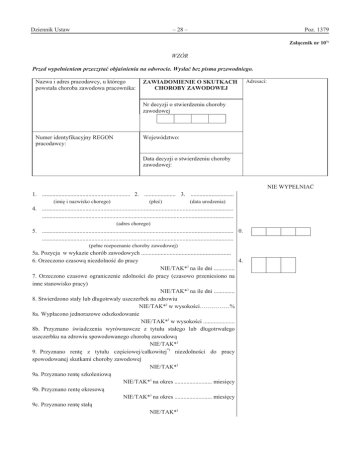']LHQQLN8VWDZ ±± Poz. 1379 =DáąF]QLNQU WZÓR 3U]HGZ\SHáQLHQLHPSU]HF]\WDüREMDĞQLHQLDQDRGZURFLH:\VáDüEH]SLVPDSU]HZRGQLHJR 1D]ZDLDGUHVSUDFRGDZF\XNWyUHJR =$:,$'20,(1,(26.87.$&+ $GUHVDFL SRZVWDáDFKRURED]DZRGRZDSUDFRZQLND &+252%<=$:2'2:(- 1UGHF\]MLRVWZLHUG]HQLXFKRURE\ ]DZRGRZHM 1XPHULGHQW\ILNDF\MQ\5(*21 SUDFRGDZF\ :RMHZyG]WZR 'DWDGHF\]MLRVWZLHUG]HQLXFKRURE\ ]DZRGRZHM 1,(:<3(à1,$ƚ LPLĊLQD]ZLVNRFKRUHJR SáHü GDWDXURG]HQLD DGUHVFKRUHJR SHáQHUR]SR]QDQLHFKRURE\]DZRGRZHM D3R]\FMDZZ\ND]LHFKRUyE]DZRGRZ\FK 2U]HF]RQRF]DVRZąQLH]GROQRĞüGRSUDF\ 1,(7$.QDLOHGQL 2U]HF]RQR F]DVRZH RJUDQLF]HQLH ]GROQRĞFL GR SUDF\ F]DVRZR SU]HQLHVLRQR QD LQQHVWDQRZLVNRSUDF\ 1,(7$.QDLOHGQL 6WZLHUG]RQRVWDá\OXEGáXJRWUZDá\XV]F]HUEHNQD]GURZLX 1,(7$.ZZ\VRNRĞFL««««« D:\SáDFRQRMHGQRUD]RZHRGV]NRGRZDQLH 1,(7$.ZZ\VRNRĞFL E 3U]\]QDQR ĞZLDGF]HQLD Z\UyZQDZF]H ] W\WXáX VWDáHJR OXE GáXJRWUZDáHJR XV]F]HUENXQD]GURZLXVSRZRGRZDQHJRFKRUREą]DZRGRZą 1,(7$. 3U]\]QDQR UHQWĊ ] W\WXáX F]ĊĞFLRZHMFDáNRZLWHM QLH]GROQRĞFL GR SUDF\ VSRZRGRZDQHMVNXWNDPLFKRURE\]DZRGRZHM 1,(7$. D3U]\]QDQRUHQWĊV]NROHQLRZą 1,(7$.QDRNUHVPLHVLĊF\ E3U]\]QDQRUHQWĊRNUHVRZą 1,(7$.QDRNUHVPLHVLĊF\ F3U]\]QDQRUHQWĊVWDáą 1,(7$. ']LHQQLN8VWDZ ±± Poz. 1379 6WZLHUG]HQLHFKRURE\]DZRGRZHMGRW\F]\HPHU\WD 1,(7$. GDWDSRGSLVSUDFRGDZF\OXERVRE\ XSRZDĪQLRQHMSU]H]SUDFRGDZFĊ 1LHSRWU]HEQHVNUHĞOLü 2%-$ĝ1,(1,$ GRZ\SHáQLDQLD]DZLDGRPLHQLDRVNXWNDFKFKRURE\]DZRGRZHM 8ZDJLRJyOQH =DZLDGRPLHQLHZ\SHáQLDSUDFRGDZFD]DWUXGQLDMąF\SUDFRZQLNDXNWyUHJRVWZLHUG]RQRFKRUREĊ]DZRGRZąSRMHJR SU]\VWąSLHQLXGRSUDF\OXESRSU]\]QDQLXUHQW\]W\WXáXQLH]GROQRĞFLGRSUDF\ )RUPXODU]]DZLDGRPLHQLDQDOHĪ\Z\SHáQLüSLVPHPNRPSXWHURZ\P : SROX R]QDF]RQ\P Ä$GUHVDFL´ QDOHĪ\ ZSLVDü ,QVW\WXW 0HG\F\Q\ 3UDF\ LP SURI GU PHG -HU]HJR 1RIHUD ZàRG]LXOĞZ7HUHV\àyGĨRUD]QD]ZĊLDGUHVRGSRZLHGQLRSDĔVWZRZHJRSRZLDWRZHJRLQVSHNWRUD VDQLWDUQHJR SDĔVWZRZHJR JUDQLF]QHJR LQVSHNWRUD VDQLWDUQHJR SDĔVWZRZHJR ZRMHZyG]NLHJR LQVSHNWRUD VDQLWDUQHJRSDĔVWZRZHJRLQVSHNWRUDVDQLWDUQHJRRNWyU\PPRZDZSU]HSLVDFKZ\GDQ\FKQDSRGVWDZLHDUW XVWXVWDZ\]GQLDPDUFDUR3DĔVWZRZHM ,QVSHNFML6DQLWDUQHM']8]U1USR] ]USR]LRUD]]USR]NRPHQGDQWDZRMVNRZHJRRĞURGNDPHG\F\Q\SUHZHQF\MQHMDOER LQVSHNWRUD ZRMVNRZHJR RĞURGND PHG\F\Q\ SUHZHQF\MQHM NWyU\ Z\GDá GHF\]MĊ R VWZLHUG]HQLX FKRURE\ ]DZRGRZHMZ,LQVWDQFML 3UDFRGDZFDQLHZ\SHáQLDSUDZHJRPDUJLQHVX]DZLDGRPLHQLDMHVWWRPLHMVFHQDNRGLZ]ZLą]NX]W\PQLHQDOHĪ\ GRNRQ\ZDüQDPDUJLQHVLHĪDGQ\FK]DSLVyZ : SROX R]QDF]RQ\P Ä1XPHU LGHQW\ILNDF\MQ\ 5(*21 SUDFRGDZF\´ QDOHĪ\ ZSLVDü G]LHZLĊFLRF\IURZ\ QXPHU LGHQW\ILNDF\MQ\5(*21SUDFRGDZF\ : SROX R]QDF]RQ\P Ä1U GHF\]ML R VWZLHUG]HQLX FKRURE\ ]DZRGRZHM´ QDOHĪ\ ZSLVDü NROHMQ\ QXPHU GHF\]ML RVWZLHUG]HQLXFKRURE\]DZRGRZHMZGDQ\PURNXNDOHQGDU]RZ\P : SROX R]QDF]RQ\P Ä:RMHZyG]WZR´ QDOHĪ\ ZSLVDü QD]ZĊ ZRMHZyG]WZD QD NWyUHJR WHUHQLH SRZVWDáD FKRURED ]DZRGRZD : SROX R]QDF]RQ\P Ä'DWD GHF\]ML R VWZLHUG]HQLX FKRURE\ ]DZRGRZHM´ QDOHĪ\ ZSLVDü GDWĊ Z\GDQLD GHF\]ML RVWZLHUG]HQLXFKRURE\]DZRGRZHM 8ZDJLV]F]HJyáRZH SNW :SLVDüNRG±0PĊĪF]\]QDOXE.NRELHWD SNW SNW :SLVDüSHáQHUR]SR]QDQLHFKRURE\]DZRGRZHM]JRGQLH]EU]PLHQLHPSRGDQ\PZGHF\]MLRVWZLHUG]HQLX FKRURE\]DZRGRZHM :SLVDüSURFHQWXV]F]HUENXQD]GURZLXRU]HF]RQ\SU]H]OHNDU]DRU]HF]QLND=86