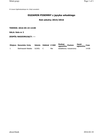 Skład grupy Page 1 of 1 IV Liceum Ogólnokształcące im. Orląt Lwowskich EGZAMIN PISEMNY z języka włoskiego Rok szkolny 2015/2016 TERMIN: 2016-05-23 14:00 SALA: Sala nr 2 ZESPÓŁ NADZORUJĄCY: --- Miejsce Nazwisko Imię 1 Stelmaszek Natalia about:blank Szkoła ILOiOL Oddział Z OKE C Nie Rodzaj Poziom egzaminu dodatkowy rozszerzony Język Czas egzaminu 14:00 2016-02-10