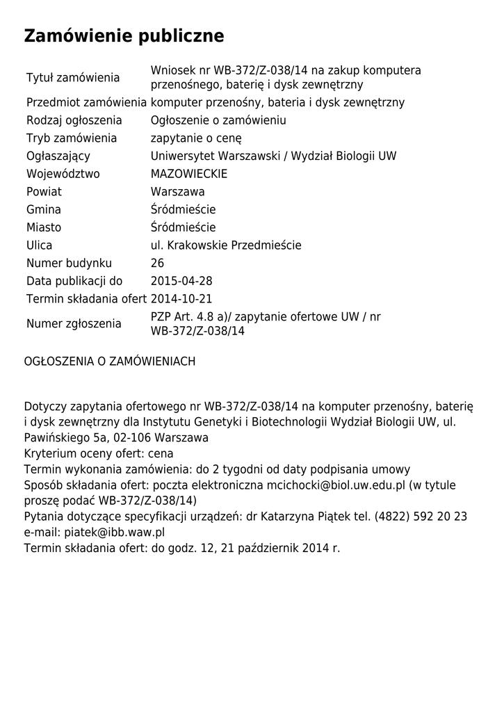 Zamówienie publiczne Tytuł zamówienia Wniosek nr WB-372/Z-038/14 na zakup komputera przenośnego, baterię i dysk zewnętrzny Przedmiot zamówienia komputer przenośny, bateria i dysk zewnętrzny Rodzaj ogłoszenia Ogłoszenie o zamówieniu Tryb zamówienia zapytanie o cenę Ogłaszający Uniwersytet Warszawski / Wydział Biologii UW Województwo MAZOWIECKIE Powiat Warszawa Gmina Śródmieście Miasto Śródmieście Ulica ul. Krakowskie Przedmieście Numer budynku 26 Data publikacji do 2015-04-28 Termin składania ofert 2014-10-21 Numer zgłoszenia PZP Art. 4.8 a)/ zapytanie ofertowe UW / nr WB-372/Z-038/14 OGŁOSZENIA O ZAMÓWIENIACH Dotyczy zapytania ofertowego nr WB-372/Z-038/14 na komputer przenośny, baterię i dysk zewnętrzny dla Instytutu Genetyki i Biotechnologii Wydział Biologii UW, ul. Pawińskiego 5a, 02-106 Warszawa Kryterium oceny ofert: cena Termin wykonania zamówienia: do 2 tygodni od daty podpisania umowy Sposób składania ofert: poczta elektroniczna [email protected] (w tytule proszę podać WB-372/Z-038/14) Pytania dotyczące specyfikacji urządzeń: dr Katarzyna Piątek tel. (4822) 592 20 23 e-mail: [email protected] Termin składania ofert: do godz. 12, 21 październik 2014 r.