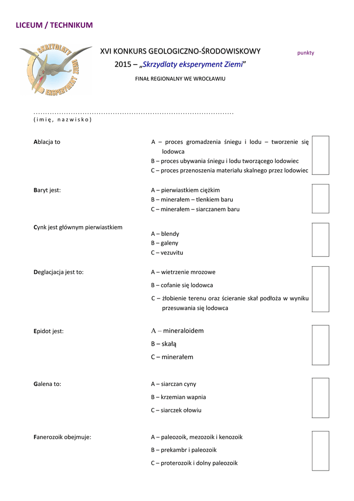 LICEUM / TECHNIKUM XVI KONKURS GEOLOGICZNO-ŚRODOWISKOWY punkty 2015 – „Skrzydlaty eksperyment Ziemi” FINAŁ REGIONALNY WE WROCŁAWIU ...................................................................................... (imię, nazwisko) Ablacja to A – proces gromadzenia śniegu i lodu – tworzenie się lodowca B – proces ubywania śniegu i lodu tworzącego lodowiec C – proces przenoszenia materiału skalnego przez lodowiec Baryt jest: A – pierwiastkiem ciężkim B – minerałem – tlenkiem baru C – minerałem – siarczanem baru Cynk jest głównym pierwiastkiem A – blendy B – galeny C – vezuvitu Deglacjacja jest to: A – wietrzenie mrozowe B – cofanie się lodowca C – żłobienie terenu oraz ścieranie skał podłoża w wyniku przesuwania się lodowca Epidot jest: A – mineraloidem B – skałą C – minerałem Galena to: A – siarczan cyny B – krzemian wapnia C – siarczek ołowiu Fanerozoik obejmuje: A – paleozoik, mezozoik i kenozoik B – prekambr i paleozoik C – proterozoik i dolny paleozoik Gagat jest A – odmianą węgla stosowaną w jubilerstwie B – jest skałą metamorficzną C – minerałem glinu Hydrologia bada A – wody podziemne B – wody powierzchniowe C – zjawiska krasowe Ichtiozaur - jego nazwa oznacza: A –jaszczur wodny B - rybi jaszczur C –rybi potwór Tylko spokojnie... nie pójdziemy do końca alfabetu Wszystko zaczęło się 154 lata temu... Wtedy właśnie, podczas eksploatacji pewnych skał pracownicy jednego z kamieniołomów w Solnhofen znaleźli dziwną skamieniałość... Świat ujrzał archeopteryksa - kręgowca łączącego w swojej budowie zarówno cechy gadów (np. uzębienie, pazury), jak i ptaków (pióra). 1. • Zaznacz w jakim kraju znajduje się omawiany wyżej kamieniołom • Jakiego wieku są skały, w których znaleziono „praptaka”? Podaj nazwę skał tych skał • w Austrii, w Niemczech, w Szwajcarii, we Francji, ........................................................ ....................................................... 2. Ewolucyjne powstanie zdolności aktywnego lotu niektórych zwierząt nie przyszło łatwo... Przede wszystkim wymagało czasu i przeprowadzenia istotnych zmian w budowie ciała, a w szczególności wytworzenia skrzydeł! To właśnie one umożliwiły podbój przestworzy. Które z przedstawionych poniżej skrzydeł () należało do pterozaura? Oznacz je znakiem X . 3. Pytanie na tzw. „nosa geologicznego”. Osoba ta ma na swoim koncie wiele ważnych odkryć paleontologicznych. Jednym z nich był szkielet pterozaura – Pterodactylus macronyx (nazwany później Dimorphodon macronyx) – pierwsze tego typu znalezisko poza Niemcami, a do tego pierwsze kompletne! O kim mowa? Podkreśl prawidłową odpowiedź. Liceum / Technikum 2015 Georges Cuvier Elizabeth Philpot Mary Anning Richard Owen 2 4. Pytanie trudne. Litografia – technika graficzna zaliczana do druku płaskiego, gdzie rysunek przeznaczony do powielania wykonuje się na kamieniu. To nic nowego! Przyroda wpadła na ten pomysł wiele milionów lat wcześniej! Poniżej przykłady „geologicznych obrazów”, na których zobaczyć możemy pierwszych „lotników” w historii Ziemi! Podaj ich spolszczone nazwy: A– B– C- A - .......................................................... B - ........................................................... C - ........................................................... 5. Który z wypisanych poniżej okresów geologicznych jest najstarszy? Podkreśl prawidłową odpowiedź:? paleogen, dewon, neogen, trias, karbon, sylur, kredar 6. Do podanych nazw miejscowości dopisz kopalinę, kruszec lub surowiec skalny, który był lub jest w nich wydobywany: Strzegom - ........................................................................................................... Jasło, Krosno, Gorlice - ....................................................................................... Kłodawa - ............................................................................................................ Konin - ................................................................................................................ Głogów - ............................................................................................................ Wałbrzych - ........................................................................................................ 7. Na którym z zamieszczonych poniżej rysunków zobaczyć możemy diapir? (zaznacz rysunek) Liceum / Technikum 2015 3 8. Wymienione poniżej określenia (nazwy) dopasuj do odpowiednich zdjęć: A - meander, B - starorzecze, C - ued / wadi(s), D - estuarium. 9. Łuk Mużakowa ze względu na wielkość, kształt i stan zachowania, stanowi w skali Europy Środkowej unikalny obiekt geologiczny (oznaczony czerwoną strzałką na rysunku). Odpowiedz na dwa pytania: (1) Jak nazywa się ta struktura? (2) Jaki proces doprowadził do jej powstania? (1) Nazwa struktury: ................................................................. . (2) Proces: ................................................................................ . 10. Gdzieś coś ‘skrzypi’ ;) ?... „Skrzypłocze to niezwykłe zwierzęta żyjące i dziś. Są przedmiotem badań naukowych ze względu na swoje unikatowe właściwości(...) powiedział PAP dr A. Błażejowski z Instytut Paleobiologii PAN w ub. roku. ( http://archeowiesci.pl ) Jakie właściwości skrzypłoczy (należących do staroraków, a nazywanych też mieczogonami) miał na myśli ten naukowiec? Odpowiedz maks. w 2 krótkich zdaniach: ............................................................................................................................... ............................................................................................................................... 11. Czym żywią się europejskie nietoperze? A - są owadożerne B - są wszystkożerne C - są roślinożerne 1