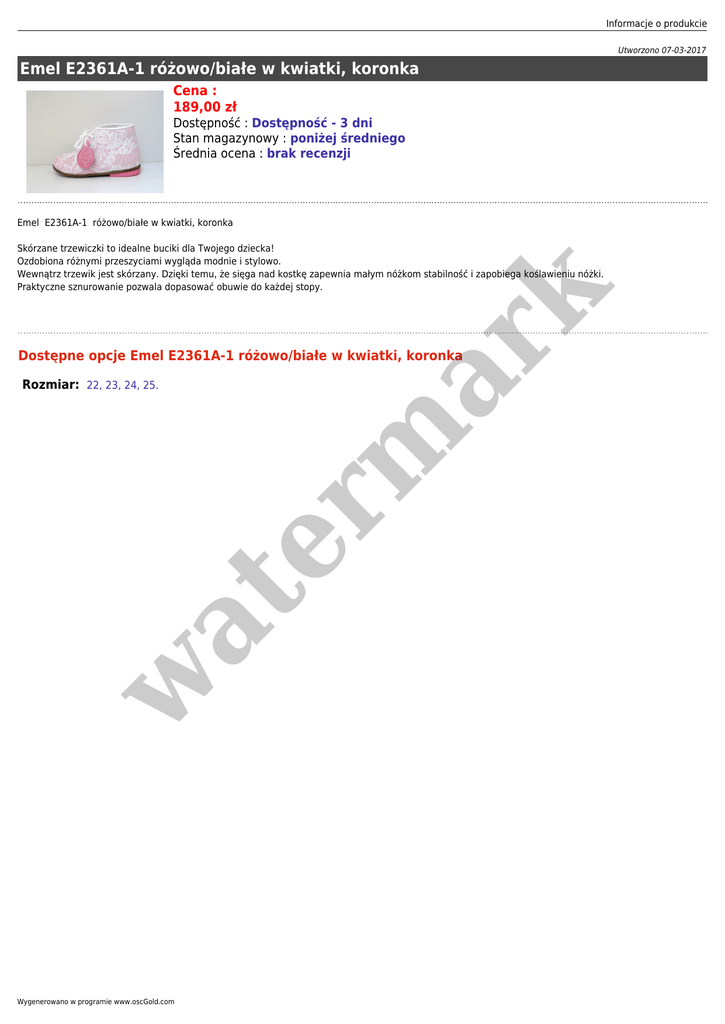 Informacje o produkcie Utworzono 07-03-2017 Emel E2361A-1 różowo/białe w kwiatki, koronka Cena : 189,00 zł Dostępność : Dostępność - 3 dni Stan magazynowy : poniżej średniego Średnia ocena : brak recenzji Emel E2361A-1 różowo/białe w kwiatki, koronka er m ar k Skórzane trzewiczki to idealne buciki dla Twojego dziecka! Ozdobiona różnymi przeszyciami wygląda modnie i stylowo. Wewnątrz trzewik jest skórzany. Dzięki temu, że sięga nad kostkę zapewnia małym nóżkom stabilność i zapobiega koślawieniu nóżki. Praktyczne sznurowanie pozwala dopasować obuwie do każdej stopy. Dostępne opcje Emel E2361A-1 różowo/białe w kwiatki, koronka w at Rozmiar: 22, 23, 24, 25. Wygenerowano w programie www.oscGold.com