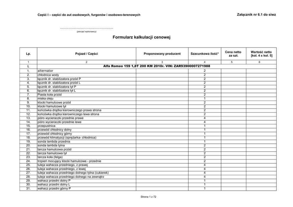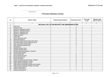 Załącznik nr 6.1 do siwz Część I – części do aut osobowych, furgonów i osobowo-terenowych ……………………………………….. (pieczęć wykonawcy) Formularz kalkulacji cenowej Lp. Pojazd / Części 1 2 I. 1. 2. 3. 4. 5. 6. 7. 8. 9. 10. 11. 12. 13. 14. 15. 16. 17. 18. 19. 20. 21. 22. 23. 24. 25. 26. 27. 28. 29. 30. 31. Proponowany producent Szacunkowa ilość* 3 4 Alfa Romeo 159 1,8T 200 KM 2010r. VIN: ZAR93900007271988 alternator chłodnica wody łącznik dr. stabilizatora przód P łącznik dr. stabilizatora przód L łącznik dr. stabilizatora tył P łącznik dr. stabilizatora tył L Piasta koła przód miska oleju klocki hamulcowe przód klocki hamulcowe tył końcówka drążka kierowniczego prawa strona końcówka drążka kierowniczego lewa strona pióro wycieraczki przednie prawe pióro wycieraczki przednie lewe przepustnica przewód chłodnicy dolny przewód chłodnicy górny przewód klimatyzcji (sprężarka- chłodnica) sonda lambda przednia sonda lambda tylna tarcza hamulcowa przód tarcza hamulcowa tył tarcza koła (felga) trzpień mocujący klocki hamulcowe - przednie tuleja wahacza przedniego, z prawej tuleja wahacza przedniego, z lewej tuleja wahacza przedniego dolnego tylna (cukierek) tuleja wahacza przedniego dolnego na zewnątrz wahacz przedni dolny P wahacz przedni dolny L wahacz przedni górny P 2 2 2 2 2 2 2 1 2 2 2 2 4 4 1 1 1 1 1 2 2 2 2 2 4 4 4 4 1 1 1 Strona 1 z 72 Cena netto za szt. 5 Wartość netto [kol. 4 x kol. 5] 6 32. 33. II. 1. 2. 3. 4. 5. 6. 7. 8. 9. 10. 11. III. 1. 2. 3. 4. 5. 6. 7. 8. 9. 10. 11. 12. 13. 14. 15. IV. 1. 2. 3. 4. 5. 6. 7. 8. 9. 10. 11. wahacz przedni górny L złącze elastyczne układu wydechowego (plecionka) klocki hamulcowe przód klocki hamulcowe tył końcówka dr. kier. P strona końcówka dr. kier. L strona łącznik stabilizatora przód P strona łącznik stabilizatora przód L strona pióra wycieraczki przód kpl. tarcza hamulcowa przód tarcza hamulcowa tył wahacz dolny P wahacz dolny L 1 2 Chevrolet Cruze 1.6 124KM 2012r. VIN: KL1JF68E9DK049910 1 1 1 1 1 1 1 2 2 1 1 szczęki hamulcowe wahacz dolny P wahacz dolny L tarcza hamulcowa przód Citroen Berlingo 1.6D 90KM 2007r. VIN: VF7GC9HXC94385139 2 1 1 1 1 1 1 1 1 1 xx 1 1 1 2 klocki hamulcowe przód klocki hamulcowe tył końcówka dr. kier. P strona końcówka dr. kier. L strona linka hamulca ręcznego kpl łącznik stabilizatora P strona łącznik stabilizatora L strona pasek wielorowkowy alternatora pióra wycieraczki przód kpl. pompa wody prowadnica linki hamulca ręcznego kpl Citroen C5 2.0 (noPb) 136 KM 2001r. VIN: VF7DCRFNC76060308 1 1 1 1 1 1 1 1 1 1 1 bęben hamulcowy klocki hamulcowe przód końcówka dr. kier. P strona końcówka dr. kier. L strona łącznik stabilizatora przód P strona łącznik stabilizatora przód L strona łożysko koła przód łożysko koła tył pasek wielorowkowy alternatora pióra wycieraczki przód kpl. Strona 2 z 72 suma netto suma netto xx suma netto 12. 13. 14. 15. 16. rozrząd kpl. sworzeń wahacza dolnego P strona sworzeń wahacza dolnego L strona tarcza hamulcowa przód tarcza hamulcowa tył 1 1 1 2 2 Citroen C5 2.2 Hdi 170 KM 2007r. VIN: VF7RC4HTH76820101 2 1 1 1 1 1 1 1 1 1 1 8 2 2 2 2 V. 1. 2. 3. 4. 5. 6. 7. 8. 9. 10. 11. 12. 13. 14. 15. 16. guma stabilizatora przód klocki hamulcowe przód klocki hamulcowe tył końcówka dr. kier. P strona końcówka dr. kier. L strona łącznik stabilizatora przód P strona łącznik stabilizatora przód L strona pasek wielorowkowy alternatora pióra wycieraczki przód kpl. sworzeń dolny wahacza P strona sworzeń dolny wahacza L strona śruba koła zamachowego tarcza hamulcowa przód tarcza hamulcowa tył tuleja wahacza przód, z przodu tuleja wahacza przód, z tyłu VI. 1. 2. 3. 4. 5. 6. 7. 8. 9. 10. 11. 12. 13. 14. 15. Citroen C5 3.0 (noPb) 200 KM 2004r. VIN: VF7DCXFXC76501589 klocki hamulcowe przód 1 klocki hamulcowe tył 1 końcówka dr. kier. P strona 1 końcówka dr. kier. L strona 1 łącznik stabilizatora przód P strona 1 łącznik stabilizatora przód L strona 1 pasek wielorowkowy alternatora 1 pióra wycieraczki przód kpl. 1 sworzeń wahacza dolnego P strona 1 sworzeń wahacza dolnego L strona 1 tarcza hamulcowa przód 2 tarcza hamulcowa tył 2 tuleja wahacza przód, z przodu 2 tuleja wahacza przód, z tyłu 2 złącze elastyczne układu wydechowego (plecionka) 1 VII. 1. 2. 3. bęben hamulcowy klocki hamulcowe przód końcówka dr. kier. P strona Citroen Jumper 2.0 D 84KM 2003r. VIN: VF7ZBAMFB17320814 2 1 1 Strona 3 z 72 suma netto suma netto suma netto 4. 5. 6. 7. 8. 9. 10. 11. 12. 13. 14. 15. 16. 17. VIII. 1. 2. 3. 4. 5. 6. IX. 1. 2. 3. 4. 5. 6. 7. 8. 9. 10. 11. 12. 13. 14. 15. 16. 17. 18. 19. 20. 21. końcówka dr. kier. L strona łącznik stabilizatora przód P strona łącznik stabilizatora przód L strona łożysko koła przód łożysko koła tył pasek wielorowkowy alternatora pióra wycieraczki przód kpl. rolka napinająca paska wielorowkowego rolka prowadząca paska wielorowkowego sworzeń dolny wahacza P strona sworzeń dolny wahacza L strona szczęki hamulcowe świeca żarowa tarcza hamulcowa przód klocki hamulcowe przód klocki hamulcowe tył tarcza hamulcowa przód tarcza hamulcowa tył pasek wielorowkowy alternatora pióra wycieraczki przód kpl. amortyzator tył bęben hamulcowy cewka zapłonowa cylinderek hamulca tył klocki hamulcowe przód koło pasowe alternatora końcówka dr. kier. P strona końcówka dr. kier. L strona linka hamulca ręcznego łącznik stabilizatora przód P strona łącznik stabilizatora przód L strona łożysko koła przód łożysko koła tył napinacz paska alternatora osłona przegubu zewnętrznego pasek alternatora pióra wycieraczki przód kpl. pompa wody przewody zapłonowe - komplet sworzeń wahacza P strona sworzeń wahacza L strona 1 1 1 1 1 1 1 1 1 1 1 1 4 2 Citroen Jumper 2.2 D 88KW 2008r. VIN VF7YBBMFB11411366 2 2 2 2 1 1 Dacia Logan 1.6 87KM (noPb) 2006r. VIN: UU1LSDAFH36869582 2 2 1 4 1 1 1 1 1 1 1