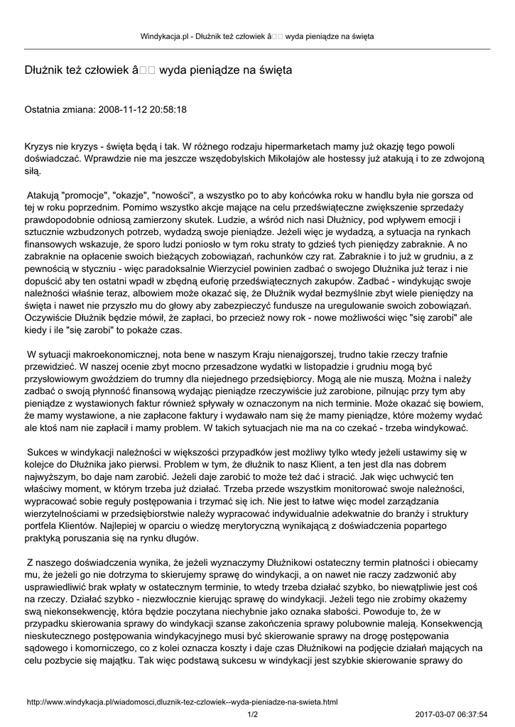 Windykacja.pl - Dłużnik też człowiek â Dłużnik też człowiek â wyda pieniądze na święta wyda pieniądze na święta Ostatnia zmiana: 2008-11-12 20:58:18 Kryzys nie kryzys - święta będą i tak. W różnego rodzaju hipermarketach mamy już okazję tego powoli doświadczać. Wprawdzie nie ma jeszcze wszędobylskich Mikołajów ale hostessy już atakują i to ze zdwojoną siłą. Atakują "promocje", "okazje", "nowości", a wszystko po to aby końcówka roku w handlu była nie gorsza od tej w roku poprzednim. Pomimo wszystko akcje mające na celu przedświąteczne zwiększenie sprzedaży prawdopodobnie odniosą zamierzony skutek. Ludzie, a wśród nich nasi Dłużnicy, pod wpływem emocji i sztucznie wzbudzonych potrzeb, wydadzą swoje pieniądze. Jeżeli więc je wydadzą, a sytuacja na rynkach finansowych wskazuje, że sporo ludzi poniosło w tym roku straty to gdzieś tych pieniędzy zabraknie. A no zabraknie na opłacenie swoich bieżących zobowiązań, rachunków czy rat. Zabraknie i to już w grudniu, a z pewnością w styczniu - więc paradoksalnie Wierzyciel powinien zadbać o swojego Dłużnika już teraz i nie dopuścić aby ten ostatni wpadł w zbędną euforię przedświątecznych zakupów. Zadbać - windykując swoje należności właśnie teraz, albowiem może okazać się, że Dłużnik wydał bezmyślnie zbyt wiele pieniędzy na święta i nawet nie przyszło mu do głowy aby zabezpieczyć fundusze na uregulowanie swoich zobowiązań. Oczywiście Dłużnik będzie mówił, że zapłaci, bo przecież nowy rok - nowe możliwości więc "się zarobi" ale kiedy i ile "się zarobi" to pokaże czas. W sytuacji makroekonomicznej, nota bene w naszym Kraju nienajgorszej, trudno takie rzeczy trafnie przewidzieć. W naszej ocenie zbyt mocno przesadzone wydatki w listopadzie i grudniu mogą być przysłowiowym gwoździem do trumny dla niejednego przedsiębiorcy. Mogą ale nie muszą. Można i należy zadbać o swoją płynność finansową wydając pieniądze rzeczywiście już zarobione, pilnując przy tym aby pieniądze z wystawionych faktur również spływały w oznaczonym na nich terminie. Może okazać się bowiem, że mamy wystawione, a nie zapłacone faktury i wydawało nam się że mamy pieniądze, które możemy wydać ale ktoś nam nie zapłacił i mamy problem. W takich sytuacjach nie ma na co czekać - trzeba windykować. Sukces w windykacji należności w większości przypadków jest możliwy tylko wtedy jeżeli ustawimy się w kolejce do Dłużnika jako pierwsi. Problem w tym, że dłużnik to nasz Klient, a ten jest dla nas dobrem najwyższym, bo daje nam zarobić. Jeżeli daje zarobić to może też dać i stracić. Jak więc uchwycić ten właściwy moment, w którym trzeba już działać. Trzeba przede wszystkim monitorować swoje należności, wypracować sobie reguły postępowania i trzymać się ich. Nie jest to łatwe więc model zarządzania wierzytelnościami w przedsiębiorstwie należy wypracować indywidualnie adekwatnie do branży i struktury portfela Klientów. Najlepiej w oparciu o wiedzę merytoryczną wynikającą z doświadczenia popartego praktyką poruszania się na rynku długów. Z naszego doświadczenia wynika, że jeżeli wyznaczymy Dłużnikowi ostateczny termin płatności i obiecamy mu, że jeżeli go nie dotrzyma to skierujemy sprawę do windykacji, a on nawet nie raczy zadzwonić aby usprawiedliwić brak wpłaty w ostatecznym terminie, to wtedy trzeba działać szybko, bo niewątpliwie jest coś na rzeczy. Działać szybko - niezwłocznie kierując sprawę do windykacji. Jeżeli tego nie zrobimy okażemy swą niekonsekwencję, która będzie poczytana niechybnie jako oznaka słabości. Powoduje to, że w przypadku skierowania sprawy do windykacji szanse zakończenia sprawy polubownie maleją. Konsekwencją nieskutecznego postępowania windykacyjnego musi być skierowanie sprawy na drogę postępowania sądowego i komorniczego, co z kolei oznacza koszty i daje czas Dłużnikowi na podjęcie działań mających na celu pozbycie się majątku. Tak więc podstawą sukcesu w windykacji jest szybkie skierowanie sprawy do http://www.windykacja.pl/wiadomosci,dluznik-tez-czlowiek--wyda-pieniadze-na-swieta.html 1/2 2017-03-07 06:37:54 Windykacja.pl - Dłużnik też człowiek â wyda pieniądze na święta specjalisty, bo tylko w ten sposób odzyskamy pieniądze, po które w każdej chwili mogą ustawić się inni !!! Autor: Krzysztof Laba V-ce Prezes Zarządu Kancelaria STATIMA www.statima.pl Sp. z o.o. http://www.windykacja.pl/wiadomosci,dluznik-tez-czlowiek--wyda-pieniadze-na-swieta.html 2/2 2017-03-07 06:37:54