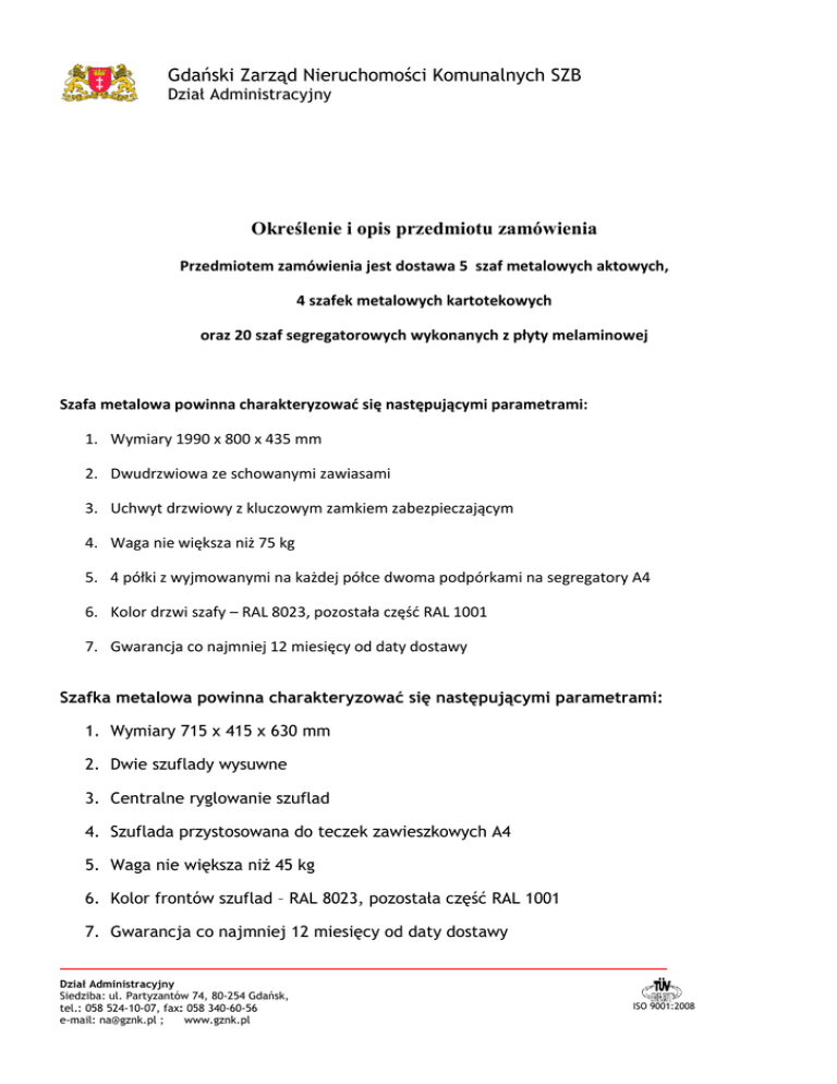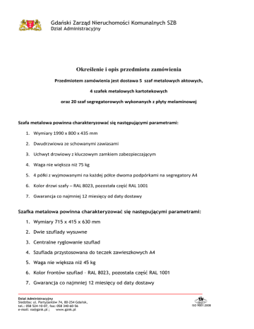 Gdański Zarząd Nieruchomości Komunalnych SZB Dział Administracyjny Określenie i opis przedmiotu zamówienia Przedmiotem zamówienia jest dostawa 5 szaf metalowych aktowych, 4 szafek metalowych kartotekowych oraz 20 szaf segregatorowych wykonanych z płyty melaminowej Szafa metalowa powinna charakteryzować się następującymi parametrami: 1. Wymiary 1990 x 800 x 435 mm 2. Dwudrzwiowa ze schowanymi zawiasami 3. Uchwyt drzwiowy z kluczowym zamkiem zabezpieczającym 4. Waga nie większa niż 75 kg 5. 4 półki z wyjmowanymi na każdej półce dwoma podpórkami na segregatory A4 6. Kolor drzwi szafy – RAL 8023, pozostała częśd RAL 1001 7. Gwarancja co najmniej 12 miesięcy od daty dostawy Szafka metalowa powinna charakteryzować się następującymi parametrami: 1. Wymiary 715 x 415 x 630 mm 2. Dwie szuflady wysuwne 3. Centralne ryglowanie szuflad 4. Szuflada przystosowana do teczek zawieszkowych A4 5. Waga nie większa niż 45 kg 6. Kolor frontów szuflad – RAL 8023, pozostała część RAL 1001 7. Gwarancja co najmniej 12 miesięcy od daty dostawy Dział Administracyjny Siedziba: ul. Partyzantów 74, 80-254 Gdańsk, tel.: 058 524-10-07, fax: 058 340-60-56 e-mail: [email protected] ; www.gznk.pl ISO 9001:2008 Szafa segregatorowa powinna charakteryzować się następującymi parametrami: 1. Wymiary (1800 do 1840) x 800 x 350 mm 2. Dwudrzwiowa z zamkiem zabezpieczającym 3. Wykonana z płyty melaminowej o gr. co najmniej 18 mm 4. 5 rzędów na segregatory A4 5. Kolor szafy calvados 6. Regulowane nóżki 7. Gwarancja co najmniej 12 miesięcy od daty dostawy Termin wykonania zamówienia i miejsce dostawy: Dostawa szaf do 30 dni od daty otrzymania zlecenia Miejsce dostawy: GZNK SZB ul. Partyzantów 74, 80-254 Gdańsk Dostawca zobowiązany jest do wniesienia szafy do pomieszczenia wskazanego przez Zamawiającego. Szafy metalowe będą usytuowane na parterze budynku Forma płatności: Przelew 30 dni od daty wpływu faktury do kancelarii GZNK SZB Kryteria oceny ofert: Spełnienie wszystkich parametrów wymienionych w opisie, Dołączenie do oferty dokumentacji opisowej i zdjęciowej Najniższa cena Termin składania ofert 14.11.2014 r. godz. 12.00 Miejsce: siedziba Zamawiającego, 80-254 Gdańsk, ul. Partyzantów 74, pok. Nr 8 (kancelaria), na kopertach proszę napisać „NA-meble” lub drogą elektroniczną na adres [email protected]