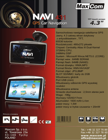 Samochodowa nawigacja satelitarna GPS Jasny, 4.3 calowy ekran dotykowy z antyodblaskiem , TFT, 65536 kolorów Rozdzielczoœæ: 480x272 piksele Chipset: Centrality Atlas III Dual Kernel 372MHz CPU, 248MHz DSP System : Microsoft Wince.NET5.0. (CORE) Pamiêæ wew. :64MB SDRAM Pamiêæ flash: 64MB (NAND) Format dŸwiêku: WMA,MP3 Format filmów: WMV/AVI/ASF Format zdjêæ: JPG,BMP SLOT SD/MMC: karty do 2GB Wbudowany g³oœnik Port USB (mini) Wbudowany odbiornik GPS wysokiej czu³oœci Wbudowana antena Gniazdo s³uchawkowe : 2,5mm stereo jack Waga: .196g Wymiary:120/83/17mm Akumulator: 1600 mAh Li-Ion pobór mocy: 1,5W pobór mocy w trybie czuwania < 20mW Akcesoria w komplecie Maxcom Sp. z o.o. ul. Towarowa 23a 4 3 - 1 0 0 Ty c h y POLAND Tel.: +48 32 327 70 89 Fax:+48 32 327 78 60 www.maxcom.pl [email protected] MapaMap Easy Mapa POLSKI zawiera • 1,7 miliona punktów adresowych • 1260 szczegó³owych planów miast i miejscowoœci • 305 386 kilometrów dróg ogó³em • 118 815 obiektów u¿ytecznoœci publicznej (POI) MapaMap Easy to perfekcyjna nawigacja „od drzwi do drzwi”. - interface u¿ytkownika, zaprojektowany w technologii Finger Friendly, umo¿liwia prost¹ obs³ugê urz¹dzenia nawigacyjnego jednym palcem. Profesjonalne komunikaty g³osowe w jêzyku polskim, niemiecki,angielskim oraz rosyjskim Wybrane Funkcje nawigacyjne - Nawigacja do dowolnego punktu z mapy - Nawigacja do dok³adnego adresu - Nawigacja do ulicy lub miejscowoœci - Nawigacja do miejsc ulubionych - Nawigacja do obiektów POI - Trójwymiarowy widok mapy 3D - Tradycyjny widok mapy - 2D - Automatyczny ZOOM -Informacja graficzna o zbli¿aj¹cych siê manewrach - Automatyczny wybór trybu pracy mapy: dzienny / nocny Komputer pok³adowy podaj¹cy nastêpuj¹ce dane: - odleg³oœæ na najbli¿szego manewru - szacunkowy czas dotarcia do celu - prêdkoœæ, z jak¹ siê poruszamy - wspó³rzêdne geograficzne - odleg³oœæ do celu - kierunek jazdy Akcesoria w komplecie AKTUALIZACJA: Bezp³atna aktualizacja aplikacji nawigacyjnej Ka¿dy u¿ytkownik oprogramowania MapaMap Easy ma równie¿ mo¿liwoœæ zaktualizowaæ mapê Polski poprzez zakupienie rozszerzenia do produktu MapaMap TOP w serwisie www.mojemapy.imagis.pl 5 908235 971438 Maxcom Sp. z o.o. ul. Towarowa 23a 4 3 - 1 0 0 Ty c h y POLAND Tel.: +48 32 327 70 89 Fax:+48 32 327 78 60 www.maxcom.pl [email protected] Zupe³nie nowa intuicyjna obs³uga Najszybsze i najbardziej zaawansowane mo¿liwoœci wyszukiwania Foto nawigacja (nawigacja do zdjêæ Geopix TM posiadaj¹cych informacjê o wspó³rzêdnych geograficznych) Mo¿liwoœæ przesuwania mapy przez dotkniêcie ekranu i przesuwanie po nim palcem P³ynne ustawianie tryby 2D/ 3D Automatyczne wykrywanie odbiornika GPS Automatyczne wytyczanie nowej trasy po zjechaniu z trasy wyznaczonej Nawigacja g³osowa Obliczanie d³ugoœci trasy i czasu przejazdu Funkcja informowania o przekroczonej prêdkoœci Mo¿liwoœæ planowania trasy w domu Mo¿liwoœæ obejrzenia symulacji zaplanowanej trasy Wizualizacja i uwzglêdnianie przy wyznaczaniu trasy kierunkowoœci ulic Wytyczanie najkrótszej trasy Wytyczanie najszybszej trasy„mo¿liwoœæ przegl¹dania historii tras i odwiedzanych miejsc Mo¿liwoœæ nagrywania, zapisywania i odtwarzania trasy, Mo¿liwoœæ wgrania bazy fotoradarów Akcesoria w komplecie Szczegó³owe Mapy Pañstw Andora, Austria, Belgia, Bu³garia, Chorwacja, Czechy, Dania, Estonia, Finlandia, Francja, Grecja, Hiszpania, Holandia, Irlandia, Lichtenstein, Litwa, Luksemburg, £otwa, Malta, Monako, Niemcy, Norwegia, Polska, Portugalia, San Marino, S³owacja, S³owenia, Szwajcaria, Szwecja, Turcja, Watykan, Wêgry, Wielka Brytania, W³ochy. 5 908235 971391 Maxcom Sp. z o.o. ul. Towarowa 23a 4 3 - 1 0 0 Ty c h y POLAND Tel.: +48 32 327 70 89 Fax:+48 32 327 78 60 www.maxcom.pl [email protected]