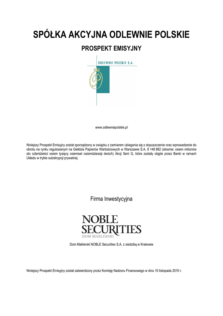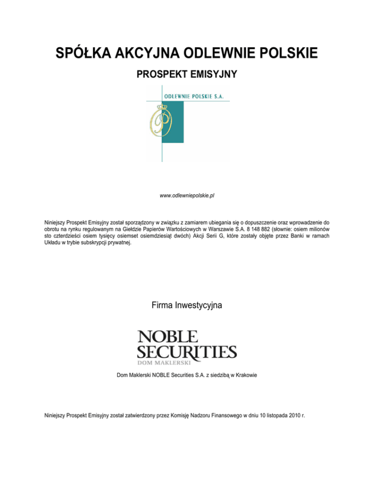 SPÓŁKA AKCYJNA ODLEWNIE POLSKIE PROSPEKT EMISYJNY www.odlewniepolskie.pl Niniejszy Prospekt Emisyjny został sporządzony w związku z zamiarem ubiegania się o dopuszczenie oraz wprowadzenie do obrotu na rynku regulowanym na Giełdzie Papierów Wartościowych w Warszawie S.A. 8 148 882 (słownie: osiem milionów sto czterdzieści osiem tysięcy osiemset osiemdziesiąt dwóch) Akcji Serii G, które zostały objęte przez Banki w ramach Układu w trybie subskrypcji prywatnej. Firma Inwestycyjna Dom Maklerski NOBLE Securities S.A. z siedzibą w Krakowie Niniejszy Prospekt Emisyjny został zatwierdzony przez Komisję Nadzoru Finansowego w dniu 10 listopada 2010 r. Spis treści CZĘŚĆ I - PODSUMOWANIE ................................................................................................................................................... 7 1 Informacje o osobach zarządzających, nadzorujących, osobach zarządzających wyŜszego szczebla oraz doradcach i biegłych rewidentach...................................................................................................................... 7 1.1 Emitent ................................................................................................................................................................... 7 1.2 Firma Inwestycyjna................................................................................................................................................. 8 1.3 Doradca Finansowy................................................................................................................................................ 8 1.4 Doradca Prawny ..................................................................................................................................................... 8 1.5 Biegły Rewident...................................................................................................................................................... 8 2 Szczegóły dopuszczenia do obrotu.................................................................................................................... 8 3 Kluczowe informacje dotyczące wybranych danych finansowych; kapitalizacja i zadłuŜenie; przyczyny oferty i wykorzystanie wpływów pienięŜnych; czynniki ryzyka ....................................................................... 8 3.1 Wybrane dane finansowe ....................................................................................................................................... 8 3.2 Kapitalizacja i zadłuŜenie ....................................................................................................................................... 9 3.3 Przyczyny oferty i wykorzystanie wpływów pienięŜnych....................................................................................... 10 3.4 Czynniki ryzyka..................................................................................................................................................... 10 4 Informacje dotyczące emitenta ......................................................................................................................... 11 4.1 Historia i ogólny zarys działalności Emitenta........................................................................................................ 11 CZĘŚĆ II – CZYNNIKI RYZYKA ............................................................................................................................................. 14 1 Czynniki ryzyka związane z działalnością Emitenta........................................................................................ 14 1.1 Ryzyko awarii przemysłowej, odpowiedzialności za produkty i nieodpowiedniego oszacowania ryzyk objętych ubezpieczeniem.................................................................................................................................................... 14 1.2 Ryzyko wahań kursów walutowych ...................................................................................................................... 14 1.3 Ryzyko wzrostu cen surowców............................................................................................................................. 15 1.4 Ryzyko uzaleŜnienia od głównych dostawców ..................................................................................................... 15 1.5 Ryzyko związane z sytuacją klientów Emitenta.................................................................................................... 15 1.6 Ryzyko związane z niewykorzystaniem mocy produkcyjnych .............................................................................. 15 1.7 Ryzyko naruszenia wymogów ochrony środowiska.............................................................................................. 15 1.8 Ryzyko wystąpienia sporu zbiorowego i strajków................................................................................................. 16 1.9 Ryzyko niewywiązania się przez Emitenta z zawartego Układu........................................................................... 16 1.10 Ryzyko związane z zadłuŜeniem bankowym........................................................................................................ 16 1.11 Ryzyko związane z realizacją zabezpieczeń........................................................................................................ 17 1.12 Ryzyko związane z wpływem Postępowania Upadłościowego na pozyskiwanie nowych kontraktów ................. 17 1.13 Ryzyko utraty kadry zarządzającej i kadry kierowniczej....................................................................................... 18 1.14 Ryzyko związane z realizacją projektów dofinansowanych z funduszy Unii Europejskiej.................................... 18 1.15 Ryzyko związane z bhp ......................................................................................