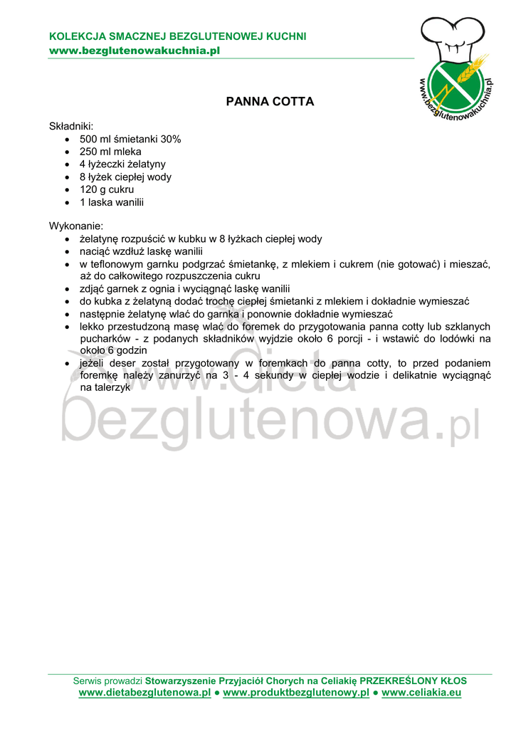 KOLEKCJA SMACZNEJ BEZGLUTENOWEJ KUCHNI www.bezglutenowakuchnia.pl PANNA COTTA Składniki: 500 ml śmietanki 30% 250 ml mleka 4 łyżeczki żelatyny 8 łyżek ciepłej wody 120 g cukru 1 laska wanilii Wykonanie: żelatynę rozpuścić w kubku w 8 łyżkach ciepłej wody naciąć wzdłuż laskę wanilii w teflonowym garnku podgrzać śmietankę, z mlekiem i cukrem (nie gotować) i mieszać, aż do całkowitego rozpuszczenia cukru zdjąć garnek z ognia i wyciągnąć laskę wanilii do kubka z żelatyną dodać trochę ciepłej śmietanki z mlekiem i dokładnie wymieszać następnie żelatynę wlać do garnka i ponownie dokładnie wymieszać lekko przestudzoną masę wlać do foremek do przygotowania panna cotty lub szklanych pucharków - z podanych składników wyjdzie około 6 porcji - i wstawić do lodówki na około 6 godzin jeżeli deser został przygotowany w foremkach do panna cotty, to przed podaniem foremkę należy zanurzyć na 3 - 4 sekundy w ciepłej wodzie i delikatnie wyciągnąć na talerzyk Serwis prowadzi Stowarzyszenie Przyjaciół Chorych na Celiakię PRZEKREŚLONY KŁOS www.dietabezglutenowa.pl ● www.produktbezglutenowy.pl ● www.celiakia.eu