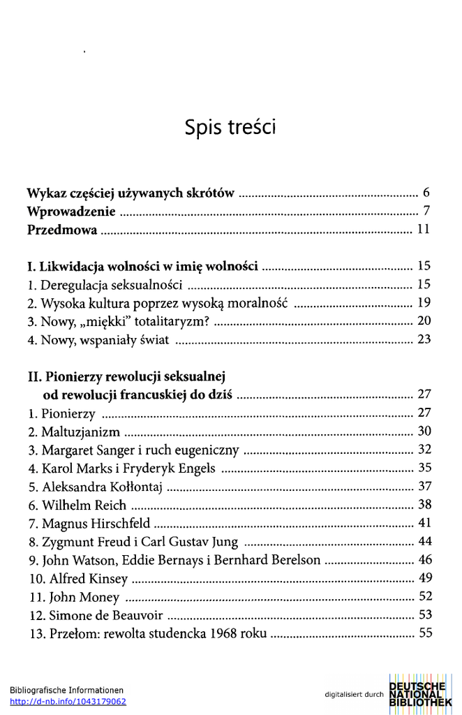 Spis treści Wykaz częściej używanych skrótów Wprowadzenie Przedmowa 6 7 11 I. Likwidacja wolności w imię wolności 1. Deregulacja seksualności 2. Wysoka kultura poprzez wysoką moralność 3. Nowy, „miękki" totalitaryzm? 4. Nowy, wspaniały świat 15 15 19 20 23 II. Pionierzy rewolucji seksualnej od rewolucji francuskiej do dziś 1. Pionierzy 2. Maltuzjanizm 3. Margaret Sanger i ruch eugeniczny 4. Karol Marks i Fryderyk Engels 5. Aleksandra Kołłontaj 6. Wilhelm Reich 7. Magnus Hirschfeld 8. Zygmunt Freud i Carl Gustav Jung 9. John Watson, Eddie Bernays i Bernhard Berelson 10. Alfred Kinsey 11. John Money 12. Simone de Beauvoir 13. Przełom: rewolta studencka 1968 roku 27 27 30 32 35 37 38 41 44 46 49 52 53 55 http://d-nb.info/1043179062 434 | sPis treści 14. Prawna deregulacja seksualności Ekskurs: Sprzeciw Kościoła katolickiego 62 64 III. Od feminizmu do ideologii genderowej 1. Walka o równouprawnienie 2. Zwrot ku radykalnemu feminizmowi 3. Dekonstrukcja odrębności płci 4. „Wywrotowa" teoria gender Judith Butler 69 69 71 71 72 IV. Globalizacja rewolucji seksualnej przez ONZ 1. Powszechna Deklaracja Praw Człowieka 2. Zmiana paradygmatu po 1989 roku 3. Kontrola urodzeń 4. Światowa Konferencja Kobiet w Pekinie w 1995 roku 5. Aborcja jako prawo człowieka? 6. Konferencja w Glen Cove 79 79 82 86 91 93 94 V. Totalitarny chwyt: Zasady z Yogyakarty 1. Cele Zasad z Yogyakarty a) Promocja zachowań nieheteroseksualnych (LGBTI) b) Zniesienie dwubiegunowej tożsamości płciowej c) „Małżeństwo" homoseksualne z prawem adopcji d) Przywileje dla osób LGBTI 2. Metody zafałszowywania a) Fałszywa legitymizacja b) Manipulacja pojęciami c) Pozory zgodności z prawem międzynarodowym 3. Metody działania a) Podważanie suwerenności narodowej b) Finansowanie organizacji LGBTI przez ONZ i UE c) Spektakularne procesy w imię praw człowieka d) Zmiana zasadniczych przekonań społecznych e) Społeczne i prawne represje wobec opornych 99 101 103 104 106 108 109 110 110 111 112 112 113 114 114 117 Spis treści | 435 4. Narzędzia aktywistów LGBTI 120 VI. Unia Europejska na kursie genderowym 1. Unia Europejska i nowy, „genderowy" człowiek 2. Instrumentalizacja praw człowieka 3. Działalność niektórych dyrekcji generalnych (departamentów) Komisji Europejskiej 4. Agencja Praw Podstawowych i Europejski Instytut ds. Równości Kobiet i Mężczyzn 5. Parlament Europejski i Rada Europy na kursie LGBTI 6. Najpierw Unia Europejska, potem cały świat 123 123 125 VII. Rewolucja genderowa od podstaw 1. Pakiet genderowy 2. Polityczne wdrażanie ideologii genderowej 3. Manifest genderowy 4. Niemiecka Rada Etyki a „trzecia płeć" 5. Genderyzacja społeczeństwa 6. Ideologizacja nauki 7. Konferencje genderowe 8. Genderyzacja sądownictwa 9. Gender mainstreaming w szkole i przedszkolu 10. Gender mainstreaming i partie polityczne 11. Niespodziewany zwrot 139 139 141 143 145 147 149 153 155 156 160 162 VIII. Polityczny gwałt na języku 1. „Korupcja słowa" 2. Zideologizowane pojęcia kluczowe 3. Feministyczny atak na język poprzez państwo 165 165 169 177 IX. Pornografia czymś całkiem normalnym? 1. Nowa, globalna epidemia 2. Upodlenie sprawców, ofiar i konsumentów 185 185 190 127 130 132 134 436 | 3. Pornografia uzależnia 4. Niebo i piekło 5. Destrukcyjne skutki pornografii 6. Wysiąść z tej karuzeli Ekskurs: Muzyka pop Ekskurs: Wielkie ignorowanie problemu sPis treści 192 197 198 200 201 204 X. Hetero-, homo-, bi-, transseksualizm - wszystko jedno? 209 1. Ruch homoseksualny 209 a) Wytyczenie kierunków działania: decyzja APA z roku 1973 .... 211 b) Odsetek osób uznających się za homoseksualistów 212 2. Interpretacja przyczyn homoseksualizmu 213 3. Zagrożenia wynikające z homoseksualnego stylu życia 216 a) Choroby fizyczne 216 b) Choroby psychiczne 218 c) Promiskuityzm 220 d) Nadużycia seksualne 222 4. Czy można przestać być homoseksualistą? 224 5. „Małżeństwo" homoseksualne 228 a) Małżeństwo i rodzina - niezbywalny wkład w dobro wspólne 229 b) Zawłaszczone prawo do legalizacji związków partnerskich 231 c) „Małżeństwo" homoseksualne prawem człowieka? 232 d) Prawo antydyskryminacyjne 234 e) Taktyka salami: stopniowe zrównywanie związków partnerskich tej samej płci z małżeństwem 235 f) Samowolne uprzywilejowanie 237 g) Europejski Trybunał Praw Człowieka: „małżeństwo" homoseksualne nie jest prawem człowieka 238 6. Adopcja 239 a) Prawo dziecka do rodziców 239 b) Badanie z Bambergu 241 7. Strategia i taktyka 244 Spis treści | 437 8. Walka z „homofobią" 9. Hillary Clinton i „prawa człowieka osób LGBTI" 10. Nowa antropologia 245 249 251 XI. Chrześcijaństwo i homoseksualizm 1. Monoteizm etyczny 2. Biblijny porządek stworzenia 3. Księga Ozeasza 4. Jezus Chrystus 5. Apostołowie 6. Teologia ciała Jana Pawła II 7. Kościoły pod presją globalnej rewolucji seksualnej 8. Sofistyka teologiczna 9. Banalizacja miłości 255 255 257 259 260 262 263 265 278 281 XII. Edukacja seksualna w szkole i przedszkolu 285 1. Seksualizacja młodzieży przez państwo 285 2. Wprowadzenie do szkół obowiązkowej edukacji seksualnej 289 3. Sieć instytucji zajmujących się pedagogiką seksualną 293 a) Federalna Centrala Edukacji Zdrowotnej (BZgA) 293 b) Instytut Pedagogiki Seksualnej (ISP), Towarzystwo Pedagogiki Seksualnej (gsp), Sojusz Pedagogiczno-Seksualny 296 c) Pro Familia 298 d) Międzynarodowa Federacja Planowanego Rodzicielstwa (IPPF) 299 e) Instrumentalizacja władzy politycznej przez radykalne mniejszości 302 4. Niektórzy protagoniści pedagogiki seksualnej 304 a) Helmut Kentler 304 b) Rudiger Lautmann 305 c) Uwe Sielert 305 d) Ina-Maria Phillipps 307 e) Karlheinz Yaltl 308 438 | 5. Treści i metody pedagogiki seksualnej a) „Małe abecadło ciała - leksykon dla dziewcząt (i chłopców)" (BZgA) b) Sex, we can?! c) „Wychowanie do różnorodności", czyli „Gdzie jeszcze można wcisnąć penisa?" d) Przewodnik „Lesbijsk