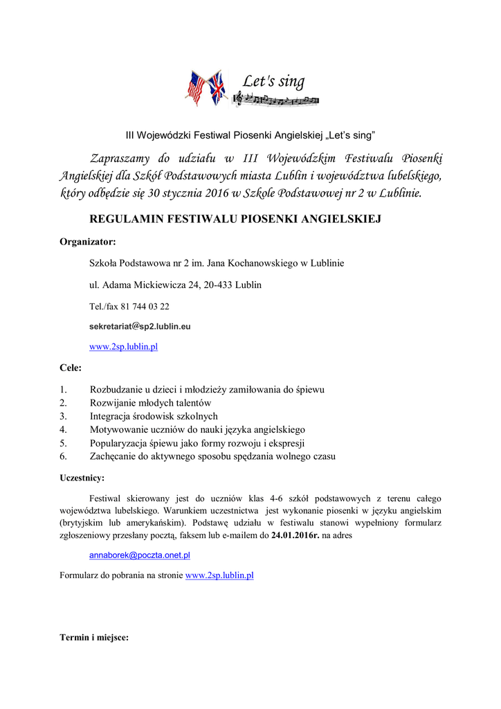 III Wojewódzki Festiwal Piosenki Angielskiej „Let’s sing” Zapraszamy do udziału w III Wojewódzkim Festiwalu Piosenki Angielskiej dla Szkół Podstawowych miasta Lublin i województwa lubelskiego, który odbędzie się 30 stycznia 2016 w Szkole Podstawowej nr 2 w Lublinie. REGULAMIN FESTIWALU PIOSENKI ANGIELSKIEJ Organizator: Szkoła Podstawowa nr 2 im. Jana Kochanowskiego w Lublinie ul. Adama Mickiewicza 24, 20-433 Lublin Tel./fax 81 744 03 22 sekretariat sp2.lublin.eu www.2sp.lublin.pl Cele: 1. 2. 3. 4. 5. 6. Rozbudzanie u dzieci i młodzieży zamiłowania do śpiewu Rozwijanie młodych talentów Integracja środowisk szkolnych Motywowanie uczniów do nauki języka angielskiego Popularyzacja śpiewu jako formy rozwoju i ekspresji Zachęcanie do aktywnego sposobu spędzania wolnego czasu Uczestnicy: Festiwal skierowany jest do uczniów klas 4-6 szkół podstawowych z terenu całego województwa lubelskiego. Warunkiem uczestnictwa jest wykonanie piosenki w języku angielskim (brytyjskim lub amerykańskim). Podstawę udziału w festiwalu stanowi wypełniony formularz zgłoszeniowy przesłany pocztą, faksem lub e-mailem do 24.01.2016r. na adres [email protected] Formularz do pobrania na stronie www.2sp.lublin.pl Termin i miejsce: I Etap – wewnątrzszkolny – do 22 stycznia 2016 r. Etap wojewódzki -30 stycznia 2016r. (sobota) godz. 9.00 Szkoła Podstawowa nr 2 im. Jana Kochanowskiego w Lublinie Zasady uczestnictwa: 1. 6. 7. 8. 1. 2. 3. 4. 5. Organizatorzy konkursu zapraszają solistów, duety, zespoły wokalne i wokalnoinstrumentalne (zespoły maksymalnie do 12 osób). Szkoła może zgłosić maksymalnie dwóch uczestników. Każdy uczestnik przygotowuje do wykonania jeden utwór w języku angielskim. Czas trwania utworu nie może przekraczać 4 minut. Uczestnicy mogą śpiewać przy akompaniamencie własnym, osoby akompaniującej, podkładzie muzycznym z płyty lub a cappella. Utwory podane na karcie zgłoszenia nie podlegają zmianom. Organizatorzy zapewniają sprzęt nagłaśniający i mikrofony. Jury będzie oceniało: Wrażenie artystyczne Poprawność językową Oryginalność i trafność doboru repertuaru Umiejętności wokalne uczestników Interpretację 6. Werdykt Jury jest niepodważalny. 7. Uczestnicy przyjeżdżają na koszt własny. 2. 3. 4. 5. Nagrody: Uczestnicy otrzymają dyplomy pamiątkowe i podziękowania, laureaci - symboliczne nagrody rzeczowe, które zostaną wręczone po ustaleniu werdyktu. Organizatorzy: 1. 2. 3. Anna Borek [email protected] Barbara Jakubiec Małgorzata Martas-Kuśmirek KARTA ZGŁOSZENIA Wojewódzki Festiwal Piosenki Angielskiej „Let’s sing” KARTĘ ZGŁOSZENIA PROSZĘ WYPEŁNIĆ DRUKOWNYMI LITERAMI Nazwa Szkoły: ....................................................................................................................................................... ....................................................................................................................................................... Adres, telefon, fax, e-mail: ....................................................................................................................................................... ....................................................................................................................................................... Imię i nazwisko nauczyciela zgłaszającego udział w festiwalu (tel. kontaktowy, e-mail): ....................................................................................................................................................... ....................................................................................................................................................... Imię i nazwisko ucznia, wiek, klasa (w przypadku zespołu ilość osób występujących): ....................................................................................................................................................... ....................................................................................................................................................... Tytuł utworu: ....................................................................................................................................................... Czas trwania utworu: ....................................................................................................................................................... Potrzeby techniczne (akompaniament własny, CD, a cappella, ilość mikrofonów): ....................................................................................................................................................... ....................................................................................................................................................... Oświadczam, że wyrażam zgodę na przetwarzanie moich danych osobowych przez Organizatorów Festiwalu na zasadach określonych w Ustawie z dnia 29 sierpnia 1997 roku o ochronie danych osobowych (Dz.U.Nr 13, poz.883)