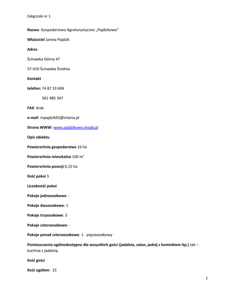 Załącznik nr 1 Nazwa Gospodarstwo Agroturystyczne „Pajdzikowo” Właściciel Janina Pajdzik Adres Ścinawka Górna 47 57-410 Ścinawka Średnia Kontakt telefon: 74 87 33 604 501 985 347 FAX: brak e-mail: [email protected] Strona WWW: www.pajdzikowo.moab.pl Opis obiektu Powierzchnia gospodarstwa 16 ha Powierzchnia mieszkalna 100 m2 Powierzchnia posesji 0,15 ha Ilość pokoi 5 Liczebność pokoi Pokoje jednoosobowe: Pokoje dwuosobowe: 1 Pokoje trzyosobowe: 3 Pokoje czteroosobowe: Pokoje ponad czteroosobowe: 1 - pięcioosobowy Pomieszczenia ogólnodostępne dla wszystkich gości (jadalnia, salon, pokój z kominkiem itp.) tak – kuchnia z jadalnią Ilość gości Ilość ogółem: 15 1 Załącznik nr 1 Łóżka pojedyncze: 5 Łóżka podwójne: 5 Liczba łazienek: 3 Kuchnia dla gości (z wyposażeniem czy bez): tak – z wyposażeniem Wyposażenie pokoi (sprzęt AGD, RTV itp.) – tak, pokoje z wyposażeniem RTV Przystosowanie dla niepełnosprawnych (wyposażenie, komunikacja itp.) – brak Parking dla gości - tak Plac zabaw dla dzieci - tak Miejsce na grilla – tak Miejsce na ognisko - tak Altany, wiaty, tarasy itp. – tak, altana Możliwość przyjazdu ze zwierzętami – brak Miejsce do przechowania rowerów - tak Sposób dojazdu (komunikacja zbiorowa, komunikacja indywidualna) – komunikacja indywidualna, PKS Znajomość języków obcych – brak Okres działalności/sezon –całorocznie Oddzielne wyjście dla gości - tak Możliwość zapewnienia wyżywienia - tak Dostępność produktów lokalnych/regionalnych oraz rękodzieła – tak, sery, jaja, mleko Zwierzęta gospodarskie/możliwość uczestnictwa w pracach gospodarskich – brak możliwości uczestnictwa w pracach gospodarskich Sprzęt turystyczny do dyspozycji gości -brak Możliwość wypożyczenia rowerów (ew. Ich ilość) – brak Materiały promocyjne i pomocnicze do dyspozycji gości – tak Dostęp do internetu – tak Forma płatności – gotówka 2 Załącznik nr 1 Opis własny: Serdecznie zapraszamy Państwa do Gospodarstwa Agroturystycznego "Pajdzikowo", położonego w Ścinawce Górnej. Wieś położona w województwie dolnośląskim, w powiecie kłodzkim, w gminie Radków. Głównym zabytkiem wsi jest renesansowy dwór "Sarny", wzniesiony przy folwarku nad rzeką Ścinawką około 1590 roku. Naszym gościom oferujemy przytulne pokoje 2, 3, 5-cio osobowe, jeden pokój z tarasem, trzy łazienki, w pełni wyposażoną kuchnie, osobne wejście dla gości, altanę z grillem, miejsce na ognisko, parking. W pobliżu gospodarstwa przejście graniczne z Czechami (3km), Góry Stołowe, Błędne Skały, Twierdza Kłodzka, Kopalnia złota, Kaplica czaszek w Czermnej i wiele innych. W najbliższym otoczeniu liczne trasy turystyczne, lasy, góry, rzeka, możliwość wędkowania, grzybobrania, uprawiania turystyki pieszej i rowerowej oraz wspinaczki górskiej. Serdecznie zapraszamy!!! 3