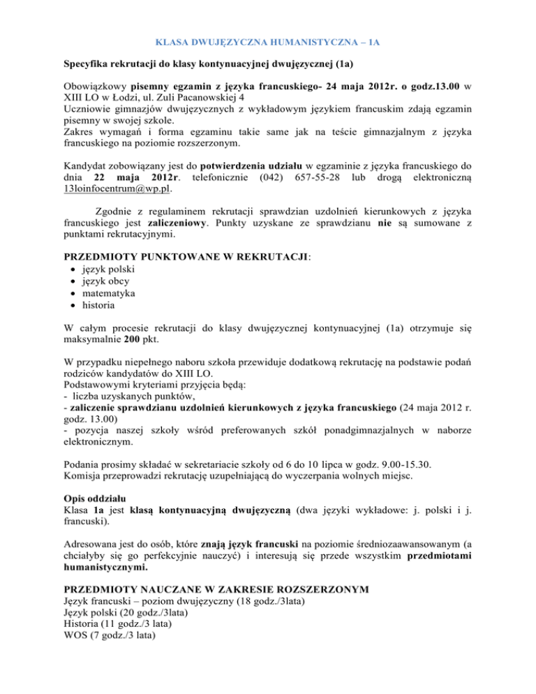 KLASA DWUJĘZYCZNA HUMANISTYCZNA – 1A Specyfika rekrutacji do klasy kontynuacyjnej dwujęzycznej (1a) Obowiązkowy pisemny egzamin z języka francuskiego- 24 maja 2012r. o godz.13.00 w XIII LO w Łodzi, ul. Zuli Pacanowskiej 4 Uczniowie gimnazjów dwujęzycznych z wykładowym językiem francuskim zdają egzamin pisemny w swojej szkole. Zakres wymagań i forma egzaminu takie same jak na teście gimnazjalnym z języka francuskiego na poziomie rozszerzonym. Kandydat zobowiązany jest do potwierdzenia udziału w egzaminie z języka francuskiego do dnia 22 maja 2012r. telefonicznie (042) 657-55-28 lub drogą elektroniczną [email protected]. Zgodnie z regulaminem rekrutacji sprawdzian uzdolnień kierunkowych z języka francuskiego jest zaliczeniowy. Punkty uzyskane ze sprawdzianu nie są sumowane z punktami rekrutacyjnymi. PRZEDMIOTY PUNKTOWANE W REKRUTACJI: język polski język obcy matematyka historia W całym procesie rekrutacji do klasy dwujęzycznej kontynuacyjnej (1a) otrzymuje się maksymalnie 200 pkt. W przypadku niepełnego naboru szkoła przewiduje dodatkową rekrutację na podstawie podań rodziców kandydatów do XIII LO. Podstawowymi kryteriami przyjęcia będą: - liczba uzyskanych punktów, - zaliczenie sprawdzianu uzdolnień kierunkowych z języka francuskiego (24 maja 2012 r. godz. 13.00) - pozycja naszej szkoły wśród preferowanych szkół ponadgimnazjalnych w naborze elektronicznym. Podania prosimy składać w sekretariacie szkoły od 6 do 10 lipca w godz. 9.00-15.30. Komisja przeprowadzi rekrutację uzupełniającą do wyczerpania wolnych miejsc. Opis oddziału Klasa 1a jest klasą kontynuacyjną dwujęzyczną (dwa języki wykładowe: j. polski i j. francuski). Adresowana jest do osób, które znają język francuski na poziomie średniozaawansowanym (a chciałyby się go perfekcyjnie nauczyć) i interesują się przede wszystkim przedmiotami humanistycznymi. PRZEDMIOTY NAUCZANE W ZAKRESIE ROZSZERZONYM Język francuski – poziom dwujęzyczny (18 godz./3lata) Język polski (20 godz./3lata) Historia (11 godz./3 lata) WOS (7 godz./3 lata) PATRONATY Ambasada Francji w Polsce Uniwersytet Łódzki - Wydział Stosunków Międzynarodowych i Politologicznych oraz Instytut Historii Cykl kształcenia obejmuje 3 lata i kończy się maturą dwujęzyczną: - przynajmniej dwa przedmioty wykładane dwujęzycznie (po polsku i francusku), - zajęcia z lektorem francuskim. JĘZYKI OBCE Język francuski – poziom dwujęzyczny Język włoski od podstaw (6 godz./3 lata) DODATKOWE INFORMACJE O KLASIE KONTYNUACYJNEJ DWUJĘZYCZNEJ W trakcie nauki uczniowie mogą przystąpić do egzaminów językowych DELF lub TELC, a na zakończenie nauki po zdaniu matury dwujęzycznej, otrzymują Certyfikat Rządu Francuskiego, który potwierdza znajomość języka francuskiego. Najchętniej wybierane kierunki studiów przez naszych absolwentów to: prawo, lingwistyka stosowana, stosunki międzynarodowe, filologie, archeologia, administracja, dziennikarstwo, filozofia, historia, kulturoznawstwo, nauki polityczne, pedagogika, polityka społeczna, socjologia. Uczniowie klas dwujęzycznych organizują imprezy promujące kulturę francuską (Dni Frankofonii, Festiwal Piosenki Francuskiej, Dyktando Języka Francuskiego i in.), ale nie tylko francuskim żyją: odnoszą sukcesy w różnorodnych olimpiadach i konkursach przedmiotowych. Realizują wiele interdyscyplinarnych projektów edukacyjnych podczas wymian młodzieżowych ze szkołami we Francji i Belgii, ale i ze szkołami w Polsce. Biegła znajomość języka francuskiego Rozszerzenia z przedmiotów humanistycznych Lekcje z native speakerem Przedmioty w dwóch językach: polskim i francuskim Certyfikat Rządu Francuskiego Wymiany młodzieżowe z francuskimi i belgijskimi szkołami Liczne imprezy kulturalne w Łodzi i w Polsce Ludzie z pasją Studia na wymarzonych kierunkach za granicą lub na najlepszych uczelniach w Polsce W celu uzyskania bardziej szczegółowych informacji zapraszamy na stronę internetową szkoły i klas dwujęzycznych : www.13lo.edu.pl www.dw13lo.edu.pl
