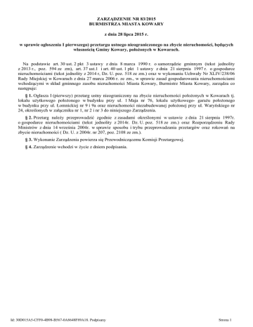 ZARZĄDZENIE NR 83/2015 BURMISTRZA MIASTA KOWARY z dnia 28 lipca 2015 r. w sprawie ogłoszenia I pierwszego) przetargu ustnego nieograniczonego na zbycie nieruchomości, będących własnością Gminy Kowary, położonych w Kowarach. Na podstawie art. 30 ust. 2 pkt 3 ustawy z dnia 8 marca 1990 r. o samorządzie gminnym (tekst jednolity z 2013 r., poz. 594 ze zm), art. 37 ust.1 i art. 40 ust. 1 pkt 1 ustawy z dnia 21 sierpnia 1997 r. o gospodarce nieruchomościami (tekst jednolity z 2014 r, Dz. U. poz. 518 ze zm.) oraz w wykonaniu Uchwały Nr XLIV/238/06 Rady Miejskiej w Kowarach z dnia 27 marca 2006 r. ze zm., w sprawie zasad gospodarowania nieruchomościami wchodzącymi w skład gminnego zasobu nieruchomości Miasta Kowary, Burmistrz Miasta Kowary, zarządza co następuje: § 1. Ogłasza I (pierwszy) przetarg ustny nieograniczony na zbycie nieruchomości położonych w Kowarach tj. lokalu użytkowego położonego w budynku przy ul. 1 Maja nr 76, lokalu użytkowego- garażu położonego w budynku przy ul. Łomnickiej nr 9 i 9a oraz nieruchomości niezabudowanej położonej przy ul. Waryńskiego nr 24, określonych w załączniku nr 1, nr 2 i nr 3 do niniejszego Zarządzenia. § 2. Przetarg należy przeprowadzić zgodnie z zasadami określonymi w ustawie z dnia 21 sierpnia 1997r. o gospodarce nieruchomościami (tekst jednolity z 2014r. Dz. U. poz. 518 ze zm.) oraz Rozporządzeniu Rady Ministrów z dnia 14 września 2004r. w sprawie sposobu i trybu przeprowadzania przetargów oraz rokowań na zbycie nieruchomości ( Dz. U. z 2004r. nr 207, poz. 2108 ze zm.). § 3. Wykonanie Zarządzenia powierza się Przewodniczącemu Komisji Przetargowej. § 4. Zarządzenie wchodzi w życie z dniem podpisania. Id: 30D015A5-CFF0-4B98-B567-0A8648F89A18. Podpisany Strona 1 Kowary dnia 28.07.2015 r. Załącznik Nr 1 do Zarządzenia Nr 83 /2015 Burmistrza Miasta Kowary z dnia 28.07.2015r. OGŁOSZENIE o I ( pierwszym ) przetargu ustnym nieograniczonym na zbycie lokalu użytkowego położonego w budynku mieszkalno- użytkowym przy ul. 1 Maja nr 76 w Kowarach wraz z udziałem w prawie użytkowania wieczystego działki gruntu numer 271 ( obręb 1, a.m. 7 ) o pow. 0,0352 ha który odbędzie się w dniu 15 września 2015r. o godz. 900 w sali konferencyjnej Urzędu Miejskiego w Kowarach ul. 1 Maja 1a. 1.Nieruchomość będąca przedmiotem przetargu była zamieszczona w wykazie nieruchomości przeznaczonych do sprzedaży ( Zarządzenie Nr 64/2015 Burmistrza Miasta Kowary z dnia 11.06.2015r. ), który został podany do publicznej wiadomości poprzez ogłoszenie w prasie, na stronie internetowej tut. Urzędu oraz wywieszony na tablicy ogłoszeń Urzędu Miejskiego w Kowarach w okresie od 12.06.2015r. do 02.07.2015r. 2.Ogłoszenie o I (pierwszym) przetargu ustnym nieograniczonym (Zarządzenie Nr 83/2015 Burmistrza Miasta Kowary z dnia 28.07.2015r. ), było wywieszone na tablicy ogłoszeń Urzędu Miejskiego w Kowarach na okres 30 dni począwszy od 29.07.2015r. do 28.08.2015r., opublikowane na stronie internetowej Urzędu oraz zamieszczone w prasie. 3.Oznaczenie nieruchomości w/g danych z ewidencji gruntów i budynków : Nieruchomość oznaczona działką gruntu nr 271 ( obręb 1, a.m. 7) o pow. 0,0352 ha , położona w Kowarach przy ul. 1 Maja nr 76, zabudowana budynkiem mieszkalnoużytkowym. W budynku znajduje się 5 lokali mieszkalnych i 1 lokal użytkowy. Budynek posiada instalację elektryczną, wodociągową, gazową oraz kanalizację sanitarną z odprowadzeniem do kolektora. Stan techniczny budynku określa się jako średni. Dla przedmiotowego budynku nie zostało dotąd wydane świadectwo charakterystyki energetycznej. 4.Oznaczenie nieruchomości wg księgi wieczystej : Dla przedmiotowej nieruchomości Sąd Rejonowy VI Wydział Ksiąg Wieczystych w Jeleniej Górze prowadzi księgę wieczystą KW numer JG1J/00042716/6. 5.Opis nieruchomości : Lokal niemieszkalny- użytkowy położony na pierwszej kondygnacji nadziemnej ( parterze ) budynku składający się z warsztatu, pomieszczenia socjalnego, magazynu i wc o łącznej pow. użytkowej 24,11 m2. oraz pomieszczenia przynależnego a to jednego pomieszczenia gospodarczego o pow. 5,32 m2 . Łączna pow. lokalu wynosi 29,43m 2 .Udział w częściach wspólnych budynku oraz w prawie użytkowania wieczystego działki gruntu wynosi 9,60%. Id: 30D015A5-CFF0-4B98-B567-0A8648F89A18. Podpisany Strona 2 Lokal posiada dostęp do instalacji elektrycznej, gazowej, wodno- kanalizacyjnej . Lokal w złym stanie technicznym o niskim standardzie, wymaga kapitalnego remontu. Powierzchnia gruntu wynikająca z przypadającego udziału wynosi 34,85m2 . 6.Forma sprzedaży : Lokal na własność Grunt w użytkowanie wieczyste. 7.Przeznaczenie nieruchomości w miejscowym planie zagospodarowania przestrzennego Zgodnie z miejscowym planem zagospodarowania przestrzennego Miasta Kowary dla jednostki urbanistycznej Kowary Centrum część C przyjętym Uchwałą Nr L/279/06 Rady Miejskiej w Kowarach z dnia 26.10.2006r., nieruchomość leży w terenie oznaczonym symbolem 14MNW/U tj. tereny zabudowy mieszkaniowej jednorodzinnej i wielorodzinnej oraz usług nieuciążliwych. 8.Cena wywoławcza w nieruchomości wynosi : 42.300,00 zł (słownie: czterdzieści dwa tysiące trzysta złotych 00/100 ), w tym: cena lokalu wynosi 39.300,00 zł (słownie: trzydzieści dziewięć tysięcy złotych 00/100 co stanowi 92,91% ceny nieruchomości , cena udziału w prawie użytkowania wieczystego gruntu wynosi 3.000,00 zł (słownie: trzy tysiące złotych 00/100 ) co stanowi 7,09% ceny nieruchomości. 9.Wysokość wadium: 5.000,00 zł ( słownie: pięć tysięcy złotych 00/100). 10.Postąpienie: o wysokości postąpienia decydują uczestnicy przetargu, z tym, że postąpienie nie może wynosić mniej niż 1% ceny wywoławczej z zaokrągleniem w górę do pełnych dziesiątek złotych . 11.Wysokość opłat i termin ich wnoszenia: Należność za nabytą nieruchomość winna być wpłacona jednorazowo przed zawar
