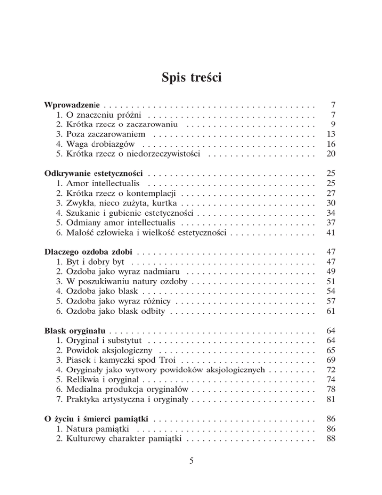 Spis treÊci Wprowadzenie . . . . . . . . . . . . . . . . . . . 1. O znaczeniu pró˝ni . . . . . . . . . . . 2. Krótka rzecz o zaczarowaniu . . . . 3. Poza zaczarowaniem . . . . . . . . . . 4. Waga drobiazgów . . . . . . . . . . . . 5. Krótka rzecz o niedorzeczywistoÊci . . . . . . . . . . . . . . . . . . . . . . . . . . . . . . . . . . . . . . . . . . . . . . . . . . . . . . . . . . . . . . . . . . . . . . . . . . . . . . . . . . . . . . . . . . . . . . . . . . . . . . 7 7 9 13 16 20 Odkrywanie estetycznoÊci . . . . . . . . . . . . . . . 1. Amor intellectualis . . . . . . . . . . . . . . . 2. Krótka rzecz o kontemplacji . . . . . . . . . 3. Zwyk∏a, nieco zu˝yta, kurtka . . . . . . . . . 4. Szukanie i gubienie estetycznoÊci . . . . . . 5. Odmiany amor intellectualis . . . . . . . . . 6. Ma∏oÊç cz∏owieka i wielkoÊç estetycznoÊci . . . . . . . . . . . . . . . . . . . . . . . . . . . . . . . . . . . . . . . . . . . . . . . . . . . . . . . . . . . . . . . . . . . . . . . . . . . . . . . . . . . . . . . . . . . . . . . . . . . . . . . . . . . . . . . . 25 25 27 30 34 37 41 Dlaczego ozdoba zdobi . . . . . . . . . . 1. Byt i dobry byt . . . . . . . . . . . 2. Ozdoba jako wyraz nadmiaru . 3. W poszukiwaniu natury ozdoby 4. Ozdoba jako blask . . . . . . . . . 5. Ozdoba jako wyraz ró˝nicy . . . 6. Ozdoba jako blask odbity . . . . . . . . . . . . . . . . . . . . . . . . . . . . . . . . . . . . . . . . . . . . . . . . . . . . . . . . . . . . . . . . . . . . . . . . . . . . . . . . . . . . . . . . . . . . . . . . . . . . . . . . . . . . . . . . . . . . 47 47 49 51 54 57 61 Blask orygina∏u . . . . . . . . . . . . . . . . . . . . . . . . . . . . . 1. Orygina∏ i substytut . . . . . . . . . . . . . . . . . . . . . . 2. Powidok aksjologiczny . . . . . . . . . . . . . . . . . . . . 3. Piasek i kamyczki spod Troi . . . . . . . . . . . . . . . . 4. Orygina∏y jako wytwory powidoków aksjologicznych 5. Relikwia i orygina∏ . . . . . . . . . . . . . . . . . . . . . . . 6. Medialna produkcja orygina∏ów . . . . . . . . . . . . . . 7. Praktyka artystyczna i orygina∏y . . . . . . . . . . . . . . . . . . . . . . . . . . . . . . . . . . . . . . . . . . . . . . . . . . . . . . . . . . . . . . . . . . . . . . . . . . . . . . . . . . . . . . 64 64 65 69 72 74 78 81 O ˝yciu i Êmierci pamiàtki . . . . . . . . . . . . . . . . . . . . . . . . . . . . . . 1. Natura pamiàtki . . . . . . . . . . . . . . . . . . . . . . . . . . . . . . . . . 2. Kulturowy charakter pamiàtki . . . . . . . . . . . . . . . . . . . . . . . . 86 86 88 . . . . . . . 5 . . . . . . . . . . . . . . . . . . . . . . . . . . . . . . . . . . . . . . . . . . . . . . . . . . . . . . . . . . . . 3. Pamiàtka wspólnotowa . . . . . . . . . . . . . . . . . . . . . . . . . . . . . 4. Wspó∏czesnoÊç jako krematorium pamiàtek . . . . . . . . . . . . . . 5. W stron´ Prousta . . . . . . . . . . . . . . . . . . . . . . . . . . . . . . . . Zabytek jako byt pró˝niaczy . . . . . . . . . . . . . . . . . 1. Waga zabytków . . . . . . . . . . . . . . . . . . . . . . 2. Zabytek jako mieszczaƒskie „echo przesz∏oÊci” 3. Metafizyka tessera hospitalis . . . . . . . . . . . . . 4. Zabytek jako wytwór przemys∏u kulturowego . 5. Zabytek jako sierota po sacrum . . . . . . . . . . 6. Zabytek jako byt pró˝niaczy . . . . . . . . . . . . . 90 94 97 . . . . . . . . . . . . . . . . . . . . . . . . . . . . . . . . . . . . . . . . . . . . . . . . . . . . . . . . . . . . . . . . . . . . . . . . . . . . . . . . . . . . 99 99 100 104 106 110 114 Ârodowisko naturalne jako uk∏ad figur wyobraêni 1. Dwie naturalnoÊci Êrodowiska . . . . . . . . . . 2. WiecznoÊç pi´kna przyrody . . . . . . . . . . . . 3. Wolny cz∏owiek i „dobra przyroda” . . . . . . 4. Przyroda i Êrodowisko naturalne . . . . . . . . 5. Ludzka naturalnoÊç jako Êrodowisko . . . . . 6. W smugach dystansu . . . . . . . . . . . . . . . . . . . . . . . . . . . . . . . . . . . . . . . . . . . . . . . . . . . . . . . . . . . . . . . . . . . . . . . . . . . . . . . . . . . . . . . . . . . . . . . . . . . . . . . . . . . . . . . . . . 118 118 120 124 129 131 135 Orfeusz, Edyp i Pi∏at w Êwiecie kalkulacji . . 1. O wpisywaniu mitów we wspó∏czesnoÊç 2. Paradoks Orfeusza . . . . . . . . . . . . . . . 3. Sfinks, który nie zadaje pytaƒ . . . . . . . 4. Poncjusz Pi∏at – mój wspólnik w winie . 5. Aureola racjonalnoÊci . . . . . . . . . . . . . . . . . . . . . . . . . . . . . . . . . . . . . . . . . . . . . . . . . . . . . . . . . . . . . . . . . . . . . . . . . . . . . . . . . . . . . . . . . . . . . . . . . . . . . . . . . . . . . . . . . . . 140 140 145 153 160 166 Pos∏owie . . . . . . . . . . . . . . . . . . . 1. W kwestii rury . . . . . . . . . . 2. WÊród produkcji kulturowych 3. Âmierç sztuki . . . . . . . . . . . 4. We wspólnocie losu . . . . . . . . . . . . . . . . . . . . . . . . . . . . . . . . . . . . . . . . . . . . . . . . . . . . . . . . . . . . . . . . . . . . . . . . . . . . . . . . . . . . . . . . . . . . 169 169 171 175 177 . . . . . . . . . . . . . . . . . . . . . . . . . . . . . . . . . . . Literatura wykorzystana . . . . . . . . . . . . . . . . . . . . . . . . . . . . . . . . 185 6