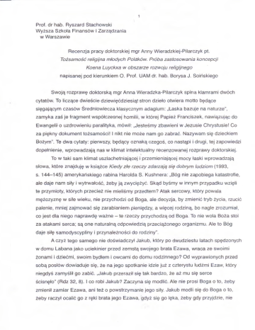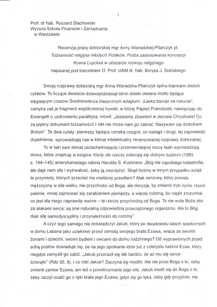 Prof. dr hab. Ryszard Stachowski Wyższa Szkoła Finansów i Zarządzania w Warszawie Recenzja pracy doktorskiej mgr Anny Wieradzkiej-Pilarczyk pt. Tożsamość młodych religijna Polaków. Próba zastosowania koncepcji Koena Luyckxa w obszarze rozwoju religijnego napisanej pod kierunkiem O. Prof. UAM dr. hab. Borysa J. Soińskiego Swoją rozprawę doktorską cytatów. To mgr Anna Wieradzka-Pilarczyk spina klamrami dwóch liczące dwieście dziewięćdziesiąt stron dzieło otwiera motto będące sięgającym czasów Średniowiecza klasycznym adagium: „Łaska bazuje na naturze'', zaś zamyka je fragment współczesnej Ewangelii o uzdrowieniu paralityka, za piękny Bożym". tożsamości! dokument znajduję które ale daje nam siły książce nawiązując do nam go zabrać . co Nazywam nastąpi się dzieckiem i drugi, tej zapowiedzi przecież i przemieniającej mocy łaski Kiedy złe rzeczy zdarzają się wprowadzają dobrym ludziom (1993, rabina Harolda S. Kushnera: „Bóg nie zapobiega katastrofie , i wytrwałość, te przymioty, których Franciszek , zbawieni w Jezusie Chrystusie! Co będący oznaką czegoś , uszlachetniającej amerykańskiego s. 144-145) mężczyznę w może Papież nas w klimat intelektualny recenzowanej rozprawy doktorskiej. To w taki sam klimat słowa, mówił : „Jesteśmy I nikt nie Te dwa cytaty: pierwszy, dopełnienie, wprowadzają homilii , w której żeby ją zwyciężyć. Skąd byśmy nie mieliśmy w innym przypadku wzięli przedtem? Atak sercowy, który powala w sile wieku, nie przychodzi od Boga, ale decyzja, by zmienić tryb ż ycia , rzucić palenie, mniej zajmować się co jest dla niego zarabianiem naprawdę ważne pieniędzy, a więcej przychodzą - te rzeczy rodziną, bo nagle zrozu mi ał, od Boga. To nie wola Boża stoi za atakami serca; są one naturalną odpowiedzią przeciążonego organizmu . Ale to Bóg daje siłę samodyscypliny i przynależności A czyż tego samego nie doświadczył w domu Labana jako uciekinier przed żonami Jakub, który po dwudziestu latach zemstą spędzonych swojego brata Ezawa, wraca ze swoimi i dziećmi, swoim bydłem i owcami do domu rodzinnego? Od wyprawionych przed sobą posłów dowiaduje niegdyś zamyślił ścisnęło " zmienił do rodziny". go się, że zabić . na jego spotkanie idzie „Jakub przeraził się już ludźmi z czterystu tak bardzo, że aż mu się Ezaw, który serce (Rdz 32, 8). I co robi Jakub? Zaczyna się modlić . Ale nie prosi Boga o to, żeby zamiar Ezawa, ani żeby raczył ocalić go z ręki też o powstrzymanie jego brata jego Ezawa, gdyż siły. się Jakub modli go lęka , żeby się do Boga o to, gdy przyjdzie , nie 2 zabił go i matek z dziećmi (por. Rdz 32, 10-13). Modli się więc o to, żeby Bóg pomógł mu opanować „aż strach, od którego zaświadczyć swoją obecność sprawia, że objąwszy Ezaw, mu się ścisnęło " serce przy jego boku w chwili zechciał niebezpieczeństwa. szyję , ucałował Jakuba za i w ten sposób go; i rozpłakali się I ta modlitwa obaj (por. Rdz 33, 4). Po co przywołuję te dwa spośród możliwych zapewne wielu innych oddalone od siebie pod względem czasowym i kulturowym przykłady? Chcę przez to z jednej strony pokazać, co mam na myśli, kiedy rozprawy doktorskiej, z drugiej mówię interesującej o klimacie intelektualnym zaś potwierdzić nas moje przekonanie o wielkiej wadze podjętej i uszczegółowionej przez jej autorkę problematyki badawczej, którą - przypomnę - jest ujęta w procesie rozwoju tożsamość religijna psychologii pastoralnej. Z dwóch zatem młodych Polaków z punktu widzenia źródeł wypływa ta praca. Pierwszym jest Prawda Objawiona jako fundament wiary, na której i wokół której dokonują się wszelkie duszpasterskie działania . Drugim natomiast psychologiczne koncepcje oraz mają stanowić wskazówkę empiryczne, które dla działań przesłanki pastoralnych badanego obszaru (por. s. 7) . „W świecie coraz większych (s. 256) - „zarówno w wymiarze znaczenie pytania o strony wiedza o religijnej jest tożsamość, „tożsamości wciąż globalnych zmian" - pisze Anna Wieradzka-Pilarczyk społecznym , w tym także tożsamość religijną", religijnej i zdolności od strony pastoralnej troski o czasów Starożytności nauki. Nie dziwi pracy też poświęca badań człowieka tożsamość człowieka sięga , Pytanie o młodych i było, więc , że nad ludzi do autoidentyfikacji się nam wąski krąg tożsamością religijną , zwłaszcza (por. s. 6) . przynajmniej w naszej kulturze, odległych i nadal jest przedmiotem zainteresowania doktorantka jeden z rośnie gdy tymczasem z jednej bardzo ograniczona" (s. 6) , a z drugiej - oferuje zarówno teoretycznych, jak i empirycznych ujętą kulturowym , jak i religijnym , podrozdz i ałów rozdziału różnych dziedzin pierwszego swojej na omówienie ontologicznego, w tym filozoficznego i teologicznego, jak psychologicznego rozumienia tożsamości. To bardzo ważna z poznawczego punktu widzenia część tej pracy doktorskiej. Uwagę czytelnika musi w tym miejscu przyciągnąć erudycja autorki, co zapewne zawdzięcza ona swojemu formalnemu w zakresie psychologii i teologii. Szkoda tylko , że w swojej dysertacji rozumienie które wszakże jestem skłonny położyć czytamy: „W dysertacji autoidentyfikację z tożsamości tożsamość prezentując już religijnej, nie na karb na wykształceniu wstępie przyjęte uniknęła potknięcia językowego , nieuważnej korekty. Oto bowiem na s. 7 religijna rozumiana jest jako : rzeczywistością nadprzyrodzoną, tworzoną wewnętrzna przez osobę ... " itd. 3 (wyróżnienie Wzięte dosłownie autorki). że rzeczywistość nadprzyrodzoną już poprawne to zdanie prowadzi do absurdalnego wniosku , tworzy osoba! Na sformułowanie przyjętego szczęście na s. 97 czytelnik znajdzie w rozprawie doktorskiej rozumienia tożsamości religijnej. Punktem że tożsamość tożsamości wyjścia rozważań religijna formuje autor