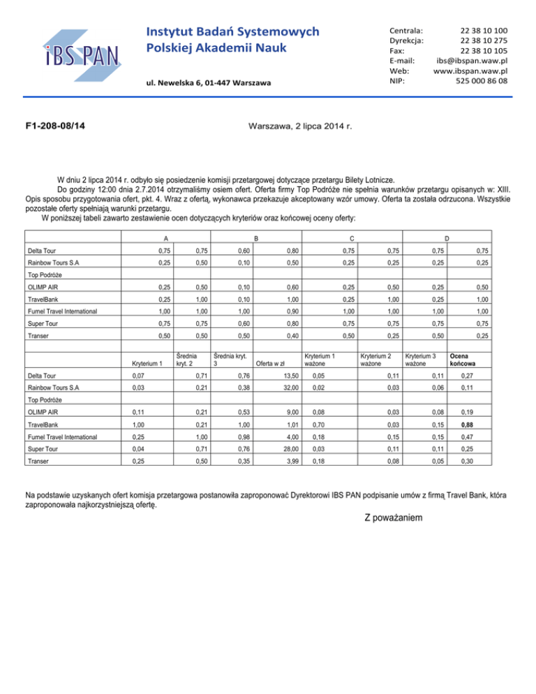 Instytut Badań Systemowych Polskiej Akademii Nauk Centrala: Dyrekcja: Fax: E-mail: Web: NIP: ul. Newelska 6, 01-447 Warszawa F1-208-08/14 22 38 10 100 22 38 10 275 22 38 10 105 [email protected] www.ibspan.waw.pl 525 000 86 08 Warszawa, 2 lipca 2014 r. W dniu 2 lipca 2014 r. odbyło się posiedzenie komisji przetargowej dotyczące przetargu Bilety Lotnicze. Do godziny 12:00 dnia 2.7.2014 otrzymaliśmy osiem ofert. Oferta firmy Top Podróże nie spełnia warunków przetargu opisanych w: XIII. Opis sposobu przygotowania ofert, pkt. 4. Wraz z ofertą, wykonawca przekazuje akceptowany wzór umowy. Oferta ta została odrzucona. Wszystkie pozostałe oferty spełniają warunki przetargu. W poniższej tabeli zawarto zestawienie ocen dotyczących kryteriów oraz końcowej oceny oferty: A B C D Delta Tour 0,75 0,75 0,60 0,80 0,75 0,75 0,75 0,75 Rainbow Tours S.A 0,25 0,50 0,10 0,50 0,25 0,25 0,25 0,25 OLIMP AIR 0,25 0,50 0,10 0,60 0,25 0,50 0,25 0,50 TravelBank 0,25 1,00 0,10 1,00 0,25 1,00 0,25 1,00 Furnel Travel International 1,00 1,00 1,00 0,90 1,00 1,00 1,00 1,00 Super Tour 0,75 0,75 0,60 0,80 0,75 0,75 0,75 0,75 Transer 0,50 0,50 0,50 0,40 0,50 0,25 0,50 0,25 Top Podróże Kryterium 1 Średnia kryt. 2 Średnia kryt. 3 Kryterium 1 ważone Oferta w zł Kryterium 2 ważone Kryterium 3 ważone Ocena końcowa Delta Tour 0,07 0,71 0,76 13,50 0,05 0,11 0,11 0,27 Rainbow Tours S.A 0,03 0,21 0,38 32,00 0,02 0,03 0,06 0,11 OLIMP AIR 0,11 0,21 0,53 9,00 0,08 0,03 0,08 0,19 TravelBank 1,00 0,21 1,00 1,01 0,70 0,03 0,15 0,88 Furnel Travel International 0,25 1,00 0,98 4,00 0,18 0,15 0,15 0,47 Super Tour 0,04 0,71 0,76 28,00 0,03 0,11 0,11 0,25 Transer 0,25 0,50 0,35 3,99 0,18 0,08 0,05 0,30 Top Podróże Na podstawie uzyskanych ofert komisja przetargowa postanowiła zaproponować Dyrektorowi IBS PAN podpisanie umów z firmą Travel Bank, która zaproponowała najkorzystniejszą ofertę. Z poważaniem
