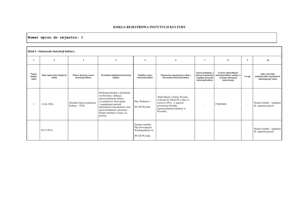 KSIĘGA REJESTROWA INSTYTUCJI KULTURY Numer wpisu do rejestru: 1 Dział I - Oznaczenie instytucji kultury: 1 2 3 4 5 6 Numer kolejny wpisu Data wpisu, daty kolejnych zmian Pełna i skrócona nazwa instytucji kultury Przedmiot działalności instytucji kultury Siedziba i adres instytucji kultury Oznaczenie organizatora i aktu o utworzeniu instytucji kultury 1 13.06.1991r. 30.12.2011r. Ośrodek Upowszechniania Kultury – OUK Realizacja działań w dziedzinie wychowania, edukacji, upowszechniania kultury i czytelnictwa. Rozwijanie i zaspakajanie potrzeb kulturalnych mieszkańców oraz upowszechnianiu i promocji kultury lokalnej w kraju i za granicą. Plac Wolności 1 89-320 Wysoka Zmiana siedziby: Plac Powstańców Wielkopolskich 16 89-320 Wysoka Rada Miasta i Gminy Wysoka Uchwała Nr XII/63/91 z dnia 13 czerwca 1991r. w sprawie utworzenia Ośrodka Upowszechniania Kultury w Wysokiej 7 8 Nazwa podmiotu, z Cyfrowy identyfikator którym organizator instytucji kultury nadany w wspólnie prowadzi systemie informacji instytucję kultury statystycznej - 570830496 9 10 Uwagi Imię i nazwisko pełnomocnika organizatora dokonującego wpisu - Donata Grabek – inspektor ds. organizacyjnych Donata Grabek – inspektor ds. organizacyjnych Dział II - Organizacja instytucji kultury: 1 2 Numer kolejny wpisu Data wpisu, daty kolejnych zmian Informacja o złożeniu do rejestru statutu 13.06.1991r. Uchwała Nr XII/63/91 Rady Miasta i Gminy Wysoka z dnia 13.06.1991r. w sprawie utworzenia OUK w Wysokiej. Ryszard Pinas Donata Grabek – inspektor ds. organizacyjnych Uchwała Nr XXIX/161/93 Rady Miasta i Gminy Wysoka z dnia 29.04.1993r. w sprawie zmiany Uchwały Nr XII/63/91 Rady MiG Wysoka z dnia 13 czerwca 1991r. p.o. Teresa Ciężka-Szpera Donata Grabek – inspektor ds. organizacyjnych 14.03.1995r. Henryk Stańczyk Donata Grabek – inspektor ds. organizacyjnych 7.12.1998r. p.o. Teresa Ciężka-Szpera 31.12.2009r. Teresa Ciężka-Szpera 1 29.04.1993r. 27.06.2012r. 3 Uchwała Nr XX/134/2012 Rady Miasta i Gminy Wysoka z dnia 27 czerwca 2012r. w sprawie statutu 4 5 6 Imię i nazwisko dyrektora Imiona i nazwiska pełnomocników Nazwa oraz siedziba wyodrębnionych instytucji kultury i jego instytucji kultury uprawnionych do jednostek organizacyjnych instytucji zastępców lub oznaczenie osoby dokonywania czynności prawnych w kultury i ich cyfrowe identyfikatory fizycznej lub prawnej, której imieniu instytucji oraz zakres ich nadane w systemie informacji powierzono zarządzanie upoważnień statystycznej instytucją kultury Teresa Ciężka-Szpera pełnomocnictwo do zawierania umów cywilnoprawnych 7 8 Uwagi Imię i nazwisko pełnomocnika organizatora dokonującego wpisu Donata Grabek – inspektor ds. organizacyjnych Donata Grabek – inspektor ds. organizacyjnych Donata Grabek – inspektor ds. organizacyjnych Dział III - Mienie instytucji kultury: 1 2 3 4 5 6 Numer kolejny wpisu Data wpisu, daty kolejnych zmian Informacja o złożeniu do rejestru rocznego sprawozdania finansowego Informacja o obciążeniu środków trwałych instytucji kultury ograniczonymi prawami rzeczowymi Uwagi Imię i nazwisko pełnomocnika organizatora dokonującego wpisu 1 01.01.1999r. Wartość przedmiotów nietrwałych w użytkowaniu 759.721,30. Wartość księgozbioru 44.235.454 26.02.2010r. Bilans sporządzony na 31.12.2009r. Donata Grabek – inspektor ds. organizacyjnych Donata Grabek – inspektor ds. organizacyjnych Środki finansowe na 2010r. 273.205,16 zł z tego: . 26.02.2010r. 22.02.2011r. Dotacja z budżetu miasta i gminy 263.000 zł Dotacja z Biblioteki Narodowej 3.529 zł Dotacja z funduszu ORANGE 978,56 zł Donata Grabek – inspektor ds. organizacyjnych Bilans sporządzony na 31.12.2010r. Donata Grabek – inspektor ds. organizacyjnych Środki finansowe na 2011r. 282.135,10 zł z tego: 22.02.2011r. Dotacja z budżetu miasta i gminy 275.000 zł Dotacja z Biblioteki Narodowej 5.000 zł Dotacja z funduszu ORANGE 863,86 zł Donata Grabek – inspektor ds. organizacyjnych Dotacja na kulturę masową 29.02.2012r. Bilans sporządzony na 31.12.2011r. Donata Grabek – inspektor ds. organizacyjnych Środki finansowe na 2012r. 400.217,58 zł z tego: 29.02.2012r. Dotacja z budżetu miasta i gminy 391.100 zł Dotacja z Biblioteki Narodowej 8.203 zł Donata Grabek – inspektor ds. organizacyjnych Dochody własne 914,58 zł Dotacja na kulturę masową 92.000 zł 14.03.2013r. Bilans sporządzony na 31.12.2012r. Donata Grabek – inspektor ds. organizacyjnych Decyzja Nr 1/2011 Burmistrza Miasta i Gminy Wysoka w sprawie oddania nieruchomości w trwały zarząd (30.12.2011r.) Donata Grabek – inspektor ds. organizacyjnych Dział IV - Połączenie, podział i likwidacja instytucji kultury: 1 2 3 4 5 6 Numer kolejny wpisu Data wpisu, daty kolejnych zmian Informacja o połączeniu, podziale lub likwidacji instytucji kultury Imię i nazwisko likwidatora Uwagi Imię i nazwisko pełnomocnika organizatora dokonującego wpisu 1