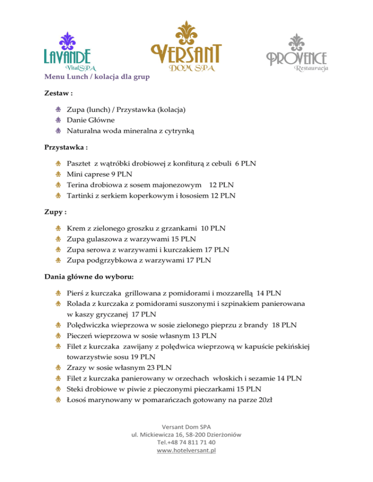 Menu Lunch / kolacja dla grup Zestaw : Zupa (lunch) / Przystawka (kolacja) Danie Główne Naturalna woda mineralna z cytrynką Przystawka : Pasztet z wątróbki drobiowej z konfiturą z cebuli 6 PLN Mini caprese 9 PLN Terina drobiowa z sosem majonezowym 12 PLN Tartinki z serkiem koperkowym i łososiem 12 PLN Zupy : Krem z zielonego groszku z grzankami 10 PLN Zupa gulaszowa z warzywami 15 PLN Zupa serowa z warzywami i kurczakiem 17 PLN Zupa podgrzybkowa z warzywami 17 PLN Dania główne do wyboru: Pierś z kurczaka grillowana z pomidorami i mozzarellą 14 PLN Rolada z kurczaka z pomidorami suszonymi i szpinakiem panierowana w kaszy gryczanej 17 PLN Polędwiczka wieprzowa w sosie zielonego pieprzu z brandy 18 PLN Pieczeń wieprzowa w sosie własnym 13 PLN Filet z kurczaka zawijany z polędwica wieprzową w kapuście pekińskiej towarzystwie sosu 19 PLN Zrazy w sosie własnym 23 PLN Filet z kurczaka panierowany w orzechach włoskich i sezamie 14 PLN Steki drobiowe w piwie z pieczonymi pieczarkami 15 PLN Łosoś marynowany w pomarańczach gotowany na parze 20zł Versant Dom SPA ul. Mickiewicza 16, 58-200 Dzierżoniów Tel.+48 74 811 71 40 www.hotelversant.pl Karmazyn w czarnym sezamie na szpinaku z gorgonzolą i likierem malibu 18 PLN Dodatki: Ziemniaki opiekane 200g 9 PLN Ziemniaki z koperkiem 200g 7 PLN Frytki 200g 8 PLN Czarny ryż 200g 9 PLN Dziki ryż 200g 14 PLN Kasza gryczana 200g 9 PLN Bukiet warzyw gotowanych 200g 10 PLN Mizeria 150g 9 PLN Buraczki zasmażane 150g 9 PLN Szpinak z gorgonzolą i likierem malibu 200g 12 PLN Zestaw surówek sezonowych 200g 10 PLN Desery do wyboru: Szarlotka z gałką lodów waniliowych 14 PLN Sernik 15 PLN Lody z musem bazyliowo – anansowym 15 PLN Ciasto czekoladowo – pomarańczowe 14 PLN Versant Dom SPA ul. Mickiewicza 16, 58-200 Dzierżoniów Tel.+48 74 811 71 40 www.hotelversant.pl