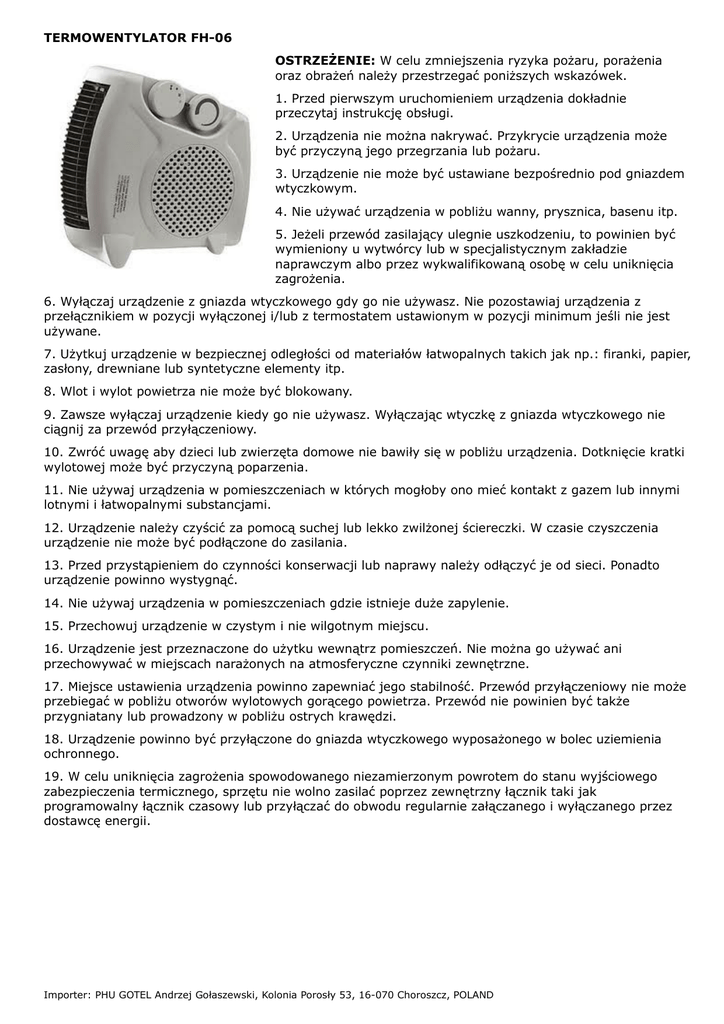 TERMOWENTYLATOR FH-06 OSTRZEŻENIE: W celu zmniejszenia ryzyka pożaru, porażenia oraz obrażeń należy przestrzegać poniższych wskazówek. 1. Przed pierwszym uruchomieniem urządzenia dokładnie przeczytaj instrukcję obsługi. 2. Urządzenia nie można nakrywać. Przykrycie urządzenia może być przyczyną jego przegrzania lub pożaru. 3. Urządzenie nie może być ustawiane bezpośrednio pod gniazdem wtyczkowym. 4. Nie używać urządzenia w pobliżu wanny, prysznica, basenu itp. 5. Jeżeli przewód zasilający ulegnie uszkodzeniu, to powinien być wymieniony u wytwórcy lub w specjalistycznym zakładzie naprawczym albo przez wykwalifikowaną osobę w celu uniknięcia zagrożenia. 6. Wyłączaj urządzenie z gniazda wtyczkowego gdy go nie używasz. Nie pozostawiaj urządzenia z przełącznikiem w pozycji wyłączonej i/lub z termostatem ustawionym w pozycji minimum jeśli nie jest używane. 7. Użytkuj urządzenie w bezpiecznej odległości od materiałów łatwopalnych takich jak np.: firanki, papier, zasłony, drewniane lub syntetyczne elementy itp. 8. Wlot i wylot powietrza nie może być blokowany. 9. Zawsze wyłączaj urządzenie kiedy go nie używasz. Wyłączając wtyczkę z gniazda wtyczkowego nie ciągnij za przewód przyłączeniowy. 10. Zwróć uwagę aby dzieci lub zwierzęta domowe nie bawiły się w pobliżu urządzenia. Dotknięcie kratki wylotowej może być przyczyną poparzenia. 11. Nie używaj urządzenia w pomieszczeniach w których mogłoby ono mieć kontakt z gazem lub innymi lotnymi i łatwopalnymi substancjami. 12. Urządzenie należy czyścić za pomocą suchej lub lekko zwilżonej ściereczki. W czasie czyszczenia urządzenie nie może być podłączone do zasilania. 13. Przed przystąpieniem do czynności konserwacji lub naprawy należy odłączyć je od sieci. Ponadto urządzenie powinno wystygnąć. 14. Nie używaj urządzenia w pomieszczeniach gdzie istnieje duże zapylenie. 15. Przechowuj urządzenie w czystym i nie wilgotnym miejscu. 16. Urządzenie jest przeznaczone do użytku wewnątrz pomieszczeń. Nie można go używać ani przechowywać w miejscach narażonych na atmosferyczne czynniki zewnętrzne. 17. Miejsce ustawienia urządzenia powinno zapewniać jego stabilność. Przewód przyłączeniowy nie może przebiegać w pobliżu otworów wylotowych gorącego powietrza. Przewód nie powinien być także przygniatany lub prowadzony w pobliżu ostrych krawędzi. 18. Urządzenie powinno być przyłączone do gniazda wtyczkowego wyposażonego w bolec uziemienia ochronnego. 19. W celu uniknięcia zagrożenia spowodowanego niezamierzonym powrotem do stanu wyjściowego zabezpieczenia termicznego, sprzętu nie wolno zasilać poprzez zewnętrzny łącznik taki jak programowalny łącznik czasowy lub przyłączać do obwodu regularnie załączanego i wyłączanego przez dostawcę energii. Importer: PHU GOTEL Andrzej Gołaszewski, Kolonia Porosły 53, 16-070 Choroszcz, POLAND WŁĄCZANIE TERMOWENTYLATORA Po ustawieniu termowentylatora w odpowiednim miejscu należy: • Rozwinąć kabel • Podłączyć urządzenie do sieci • Urządzenie włącza się za pomocą pokrętła Po ustawieniu termowentylatora w odpowiednim miejscu należy: • Ustaw termowentylator na żądaną funkcję ustawiając pokrętło do odpowiednie pozycji ZABEZPIECZANIE PRZED PRZEGRZANIEM Urządzenie zostało wyposażone w zabezpieczenie przed przegrzaniem, które wyłącza termowentylator samoczynnie w przypadku kiedy wystąpi techniczna wada lub urządzenie jest niewłaściwie używane. W tej sytuacji musisz ustawić pokrętło na pozycję OFF lub wyciągnąć wtyczkę z kontaktu. Po usunięciu przyczyny przegrzania urządzenia, po krótkim czasie, w którym urządzenie wychładza się, zabezpieczenie przed przegrzaniem włącza się automatycznie i termowentylator może być używany ponownie. UWAGA Należy zawsze uważać, żeby urządzenie znajdowało się w bezpiecznej odległości (minimum 100cm) od ściany i innych obiektów. Przepływ powietrza nie może być zablokowany. KONSERWACJA Wyjąć wtyczkę z gniazda sieciowego przed rozpoczęciem wszelkich czynności konserwacyjnych. Odczekać aż grzejnik całkiem ostygnie. Do czyszczenia używać suchej lub lekko zwilżonej szmatki. Nie lać na urządzenie wody, ani nie zanurzać żadnej jego części w wodzie lub innym płynie. Specyfikacja techniczna: * * * * * * * * * Regulacja temperatury Lampka kontrolna Zabezpieczenia przed przegrzaniem Poziomy mocy: o 1000W o 2000W Termostat Uchwyt do przenoszenia Zimny nawiew Zasilanie sieciowe 220V moc: 2000 W To urządzenie jest oznaczone zgodnie z Dyrektywą Europejską 2002/96/WE oraz polską Ustawą o zużytym sprzęcie elektrycznym i elektronicznym symbolem przekreślonego kontenera na odpady. Takie oznakowanie informuje, że sprzęt ten, po okresie jego użytkowania nie może być umieszczany łącznie z innymi odpadami pochodzącymi z gospodarstwa domowego. Użytkownik jest zobowiązany do oddania go prowadzącym zbieranie zużytego sprzętu elektrycznego i elektronicznego. Prowadzący zbieranie, w tym lokalne punkty zbiórki, sklepy oraz gminne jednostki, tworzą odpowiedni system umożliwiający oddanie tego sprzętu. Właściwe postępowanie ze zużytym sprzętem elektrycznym i elektronicznym przyczynia się do uniknięcia szkodliwych dla zdrowia ludzi i środowiska naturalnego konsekwencji, wynikających z obecności składników niebezpiecznych oraz niewłaściwego składowania i przetwarzania takiego sprzętu. W urządzeniu ograniczono niektóre substancje mogące negatywnie oddziaływać na środowisko w okresie użytkowania tego produktu oraz po ich zużyciu. Importer: PHU GOTEL Andrzej Gołaszewski, Kolonia Porosły 53, 16-070 Choroszcz, POLAND