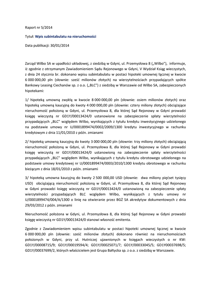 Raport nr 5/2014 Tytuł: Wpis subintabulatu na nieruchomości Data publikacji: 30/01/2014 Zarząd Wilbo SA w upadłości układowej, z siedzibą w Gdyni, ul. Przemysłowa 8 („Wilbo”), informuje, iż zgodnie z otrzymanym Zawiadomieniem Sądu Rejonowego w Gdyni, V Wydział Ksiąg wieczystych, z dnia 24 stycznia br. dokonano wpisu subintabulatu w postaci hipoteki umownej łącznej w kwocie 6 000 000,00 pln (słownie: sześć milionów złotych) na wierzytelnościach przypadających spółce Bankowy Leasing Ciechanów sp. z o.o. („BLC”) z siedzibą w Warszawie od Wilbo SA, zabezpieczonych hipotekami: 1/ hipoteką umowną zwykłą w kwocie 8 000 000,00 pln (słownie: osiem milionów złotych) oraz hipoteką umowną kaucyjną do kwoty 4 000 000,00 pln (słownie: cztery miliony złotych) obciążające nieruchomość położoną w Gdyni, ul. Przemysłowa 8, dla której Sąd Rejonowy w Gdyni prowadzi księgę wieczystą nr GD1Y/00013424/0 ustanowione na zabezpieczenie spłaty wierzytelności przypadających „BLC” względem Wilbo, wynikających z tytułu kredytu inwestycyjnego udzielonego na podstawie umowy nr U/0001899474/0002/2009/1300 kredytu inwestycyjnego w rachunku kredytowym z dnia 11/01/2010 z późn. zmianami 2/ hipoteką umowną kaucyjną do kwoty 3 000 000,00 pln (słownie: trzy miliony złotych) obciążającą nieruchomość położoną w Gdyni, ul. Przemysłowa 8, dla której Sąd Rejonowy w Gdyni prowadzi księgę wieczystą nr GD1Y/00013424/0 ustanowioną na zabezpieczenie spłaty wierzytelności przypadających „BLC” względem Wilbo, wynikających z tytułu kredytu obrotowego udzielonego na podstawie umowy kredytowej nr U/0001899474/0003/2010/1300 kredytu obrotowego w rachunku bieżącym z dnia 18/01/2010 z późn. zmianami 3/ hipoteką umowna kaucyjną do kwoty 2 500 000,00 USD (słownie: dwa miliony pięćset tysięcy USD) obciążającą nieruchomość położoną w Gdyni, ul. Przemysłowa 8, dla której Sąd Rejonowy w Gdyni prowadzi księgę wieczystą nr GD1Y/00013424/0 ustanowioną na zabezpieczenie spłaty wierzytelności przypadających BLC względem Wilbo, wynikających z tytułu umowy nr U/0001899474/004/A/1300 o linię na otwieranie przez BGŻ SA akredytyw dokumentowych z dnia 29/03/2012 z późn. zmianami Nieruchomość położona w Gdyni, ul. Przemysłowa 8, dla której Sąd Rejonowy w Gdyni prowadzi księgę wieczystą nr GD1Y/00013424/0 stanowi własność emitenta. Zgodnie z Zawiadomieniem wpisu subintabulatu w postaci hipoteki umownej łącznej w kwocie 6 000 000,00 pln (słownie: sześć milionów złotych) dokonano również na nieruchomościach położonych w Gdyni, przy ul. Hutniczej ujawnionych w księgach wieczystych o nr KW: GD1Y/00008715/9; GD1Y/00019594/4; GD1Y/00025071/7; GD1Y/00033045/5; GD1Y00037698/5; GD1Y/00037699/2, których właścicielem jest Grupa Bałtycka sp. z o.o. z siedzibą w Warszawie. Wartość ewidencyjna aktywów, na których został wpisany subintabulat tj. wartość nieruchomości położonej w Gdyni, ul. Przemysłowa 8, ujawnionej w księdze wieczystej KW o nr GD1Y/00013424/0 na dzień 31/12/2013 wynosiła 8 245 656,29 pln. Pomiędzy emitentem i osobami zarządzającymi oraz nadzorującymi emitenta, a podmiotem na rzecz którego dokonano wpisu subintabulatu nie zachodzą żadne powiązania. Wpisu dokonano w oparciu o Oświadczenie wierzyciela hipotecznego, spółki „BLC” o ustanowieniu subintabulatu w postaci hipoteki umownej łącznej w kwocie 6 000 000,00 pln (słownie: sześć milionów złotych) ustanowionej na rzecz Polskiego Banku Spółdzielczego w Ciechanowie w celu zabezpieczenia wierzytelności tego Banku wynikających z tytułu kredytu obrotowego w wysokości 4 000 000,00 pln (słownie: cztery miliony złotych) udzielonego na mocy umowy o kredyt obrotowy z dna 28/01/2013 spółce „BLC”. Spółka „BLC” stała się wierzycielem Wilbo w związku z umową z dnia 29/01/2013 roku zbycia przez Bank BGŻ SA wszystkich wierzytelności przysługujących bankowi względem Wilbo na rzecz „BLC”. W związku z umową zbycia wierzytelności na „BLC” przeszły wszystkie zabezpieczenia ustanowione na rzecz Banku BGŻ SA. O umowie zbycia wierzytelności przez Bank BGŻ SA emitent informował w raporcie bieżącym nr 7/2013 z dnia 08 lutego 2013 roku. Wpis subintabulatu w postaci hipoteki łącznej ma wartość większą niż wyrażona w złotych równowartość kwoty 1 000 000,00 Euro przeliczonej wg kursu średniego ogłaszanego przez NBP w dniu powstania obowiązku informacyjnego. Podstawa prawna: par. 5 ust. 1 pkt 1 Rozporządzenia Ministra Finansów z dnia 19 lutego 2009 roku.