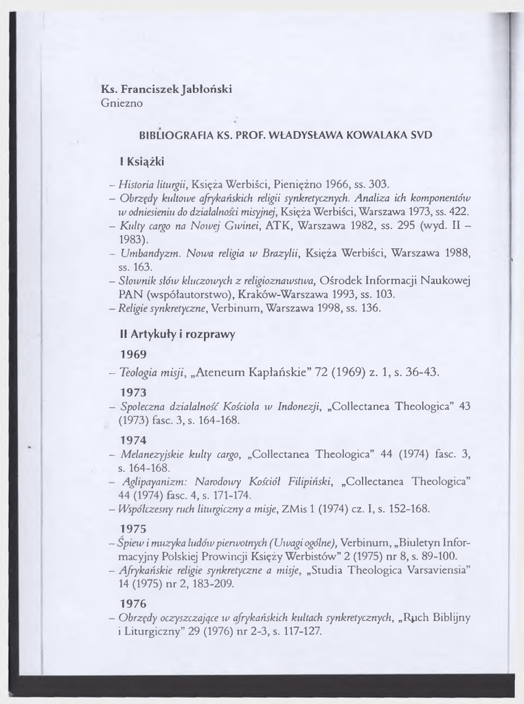 Ks. F ran c isz ek Ja b ło ń sk i Gniezno BIBLIOGRAFIA KS. PROF. WŁADYSŁAWA KOWALAKA SVD I Książki - Historia liturgii, Księża Werbiści, Pieniężno 1966, ss. 303. - Obrzędy kultowe afrykańskich religii synkretycznych. Analiza ich komponentów w odniesieniu do działalności misyjnej, Księża Werbiści, Warszawa 1973, ss. 422. - Kulty cargo na Nowej Gwinei, ATK, Warszawa 1982, ss. 295 (wyd. II 1983). - Umbandyzm. Nowa religia w Brazylii, Księża Werbiści, Warszawa 1988, ss. 163. - Słownik słów kluczowych z religioznawstwa, O środek Informacji Naukowej PAN (współautorstwo), Kraków-Warszawa 1993, ss. 103. - Religie synkretyczne, Verbinum, Warszawa 1998, ss. 136. II Artykuły i rozprawy 1969 - Teologia misji, „A teneum K apłańskie” 72 (1969) z. 1, s. 36-43. 1973 - Społeczna działalność Kościoła w Indonezji, „Collectanea Theologica” 43 (1973) fasc. 3, s. 164-168. 1974 - Melanezyjskie kulty cargo, „Collectanea Theologica” 44 (1974) fasc. 3, s. 164-168. - Aglipayanizm: Narodowy Kościół Filipiński, „Collectanea Theologica” 44 (1974) fasc. 4, s. 171-174. - Współczesny ruch liturgiczny a misje, ZMis 1 (1974) cz. I, s. 152-168. 1975 - Śpiew i muzyka ludów pierwotnych ( Uwagi ogólne), Verbinum, „Biuletyn Infor macyjny Polskiej Prowincji Księży Werbistów” 2 (1975) n r 8, s. 89-100. - Afrykańskie religie synkretyczne a misje, „Studia Theologica Varsaviensia” 14 (1975) nr 2, 183-209. 1976 - Obrzędy oczyszczające w afrykańskich kultach synkretycznych, „Rjich Biblijny i Liturgiczny” 29 (1976) nr 2-3, s. 117-127. - Obraz religijności dzisiejszej Afryki, w: B. Bejze, J. Gucia, A. Koszorz (red.), Maria Teresa Ledóchowska i misje, Warszawa 1977, 163-181. - Ruchy charyzmatyczne a kultury afrykańskie, „Zeszyty Naukowe Katolickie go U n iw ersy tetu Lubelskiego” 19 (1976) nr 3, s. 3-21. 1978 - Obrzędy kultowe afrykańskich religii synkretyczynych, w: R. M ałek, W. W esoły (red.), W służbie Słowa Bożego, Płock 1978, s. 185-219. - „Autentyzm” prezydenta Mobutu a Kos'ciół w Zairze, ZMis 3 (1978), s. 272-297. 1979 Problem religii synkretycznych w Afryce, ZMis 2 (1979) cz. 2, s. 189-214. - Metamorfozy w pojmoimniu misyjnego wymiaru Kościoła, „M ateriały Proble m ow e” 10 (1979), s. 75-108. - Charakter wierzeń religijnych ludów Nowej Gwinei, „Studia Theologica Varsaviensia” 17 (1979) n r 2, s. 159-188. 1980 - Przemiany w pojmowaniu misyjnego wymiaru Kościoła, „Elementy Teologii M isyjnej”, W arszawa 1980, s. 1-15. - Matias Yałiwan. Lider kultu cargo w prowincji Sepik Wschodni (Papua Nowa Gwinea), w: H . Z im oń (red.) Działalność Instytutu Anthropos w dziedzinie lingwistyki, etnologii i religioznawstwa, Pieniężno 1980, s. 117-126. - Kult cargo w prowincji Sepik Wschodni, „Collectanea Theologica” 50(1980) fasc. 4, s. 149-154. - Yali Singina (1912-1975). Lider kultów cargo w prowincji Madang na Nowej Gwinei, „Zeszyty N aukowe KU L” 23 (1980) nr 2, s. 33-50. 1981 - Niezależny Kościół Filipiński, „Collectanea Theologica” 51 (1981) fasc. 1, s. 131-133. - Kaodaizm - nowa religia w Wietnamie, „Collectanea Theologica” 51 (1981) fasc 1, s. 133-135. 1982 - Świat duchowy wyspiarzy Melanezji, ZMis 4 (1982), s. 134-128. - Soka Gakkai - nowa religia w Japonii, „Collectanea Theologica” 52 (1982) fasc. 4, 139-144. 1983 - Charakter pracy katechetów w krajach misyjnych, ZMis 5 (1983), s. 58-76. 1986 - Nowe religie wśród Indian Ameryki Północnej, „Collectanea Theologica” 56 (1986) fasc. l,s . 119-126. - Inkufturacja misyjna w przeddzień Soboru Watykańskiego II, ZMis 7 (1986), s. 5-13. - Nowe religie w Afryce, ZMis 7 (1986), s. 243-264. - Kargizm, ZMis 7 (1986), s. 265-282. - Umbandyzm. Nowa religia w Brazylii, w: H. Zim oń (red.), Z zagadnień etnologii i religioznawstwa, Warszawa 1986, s. 9-47. 1987 Chrześcijańskie źródła religii synkretycznych, „Ateneum Kapłańskie” 108 (1987) z. 3, s. 421-432. - Tradycyjne struktury społeczno-religijne w Melanezji, w: E. Śliwka (red.), Zbiory pozaeuropejskie w państwourych i kościelnych muzeach etnograficznych w Polsce, Pieniężno 1987, 57-91. - 1988 - Epistemologiczne podstawy kargizmu na Nowej Gwinei, w: E. Pietruszek, B. Kopydłowska-Kaczorowska (red.), Ludy i kultury Oceanii, Wrocław 1988 s. 211-220 (Acta Universitatis Wratislaviensis N o 889). 1990 - Teologia misji, w: M . Bałka (red.), Chrześcijaństwo wśród religii, Warszawa 1990,110-115. 1991 - Cargoism in the Light of Ethnology and Religiology, „Ethnologia Polona” 14 (1991), s. 165-189. 1992 - Nowe religie świata a duszpasterstwo, w: E. Śliwka (red.), Metody duszpasterzowania w różnych krajach świata, Pieniężno 1992, s. 48-59. 1994 - Przyczyny poiustawania nourych ruchów religijnych, w: B. W ujek (red.), Nowe religie i sekty uryzwaniem dla Kościoła?, Pieniężno 1994, s. 152-167. - Teologiczne podstawy zaangażowania misyjnego, w: H . Frączek (red.), II Krajowy Kongres Misyjny. Częstochowa, 16-18 października 1992, Warszawa 1994, 14-41. 1995 ’ - Nowe ruchy religijne i parareligijne, „N urt SVD. Kwartalnik MisjologicznoReligioznawczy” 2 (1995), s. 21-42. - Rola przywódców w nowych ruchach religijnych w Afryce, w: H . Z im o ń (red.), Kultury i religie Afryki a ewangelizacja, L ublin 1995, s. 103-118. 1996 - Kulty cargo a ruchy wyzwoleńcze w Irianie Zachodnim, w: E. Pietruszek, B. Kopydłowska-Kaczorowska (red.), Ludy i kultury Australii i Oceanii, Wrocław 1996, 73-81 (Acta Universitatis Wratislaviensis N o 1838). 1997 - Misja-poslannictwo, misje, „N urt SVD. Kwartalnik M isjologiczno-Religioznawczy” 3 (1997), s. 35-43. - Satanizm, „N u rt SVD. Kwartalnik Misjologiczno-Religioznawczy” 4 (1997), s. 107-119. - Satanizm-co to takiego?, „Los” 11 (1997), s. 7-8. 1998 - Satanizm, w: V I Siedleckie Forum Nauczycieli Rodziców i Wychowawców, Siedlce 6 września 1977, Siedlce 1998, s. 4-1. - Satanizm, w: A. Ćwierz (red.), Sekty - eks