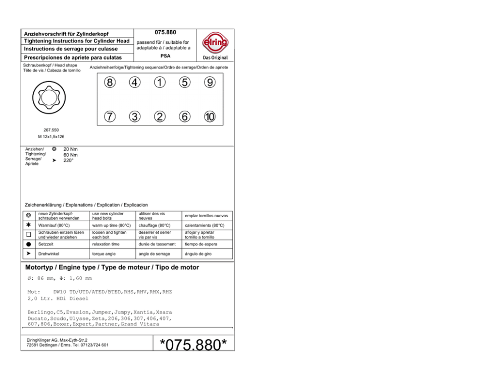 Anziehvorschrift für Zylinderkopf Tightening Instructions for Cylinder Head Instructions de serrage pour culasse 075.880 passend für / suitable for adaptable à / adaptable a PSA Prescripciones de apriete para culatas Schraubenkopf / Head shape Tête de vis / Cabeza de tornillo Anziehreihenfolge/Tightening sequence/Ordre de serrage/Orden de apriete 267.550 M 12x1,5x126 Anziehen/ Tightening/ Serrage/ Apriete ❂ ➤ 20 Nm 60 Nm 220° Zeichenerklärung / Explanations / Explication / Explicacion ❂ neue Zylinderkopfschrauben verwenden use new cylinder head bolts utiliser des vis neuves emplar tornillos nuevos ✱ Warmlauf (80°C) warm up time (80°C) chauffage (80°C) calentamiento (80°C) ❏ Schrauben einzeln lösen und wieder anziehen loosen and tighten each bolt deserrer et serrer vis par vis aflojar y apretar tornillo a tornillo ● Setzzeit relaxation time durée de tassement tiempo de espera ➤ Drehwinkel torque angle angle de serrage ángulo de giro Motortyp / Engine type / Type de moteur / Tipo de motor Ø: 86 mm, ¿: 1,60 mm Mot: DW10 TD/UTD/ATED/BTED,RHS,RHV,RHX,RHZ 2,0 Ltr. HDi Diesel Berlingo,C5,Evasion,Jumper,Jumpy,Xantia,Xsara Ducato,Scudo,Ulysse,Zeta,206,306,307,406,407, 607,806,Boxer,Expert,Partner,Grand Vitara ElringKlinger AG, Max-Eyth-Str.2 72581 Dettingen / Erms. Tel. 07123/724 601 *075.880*