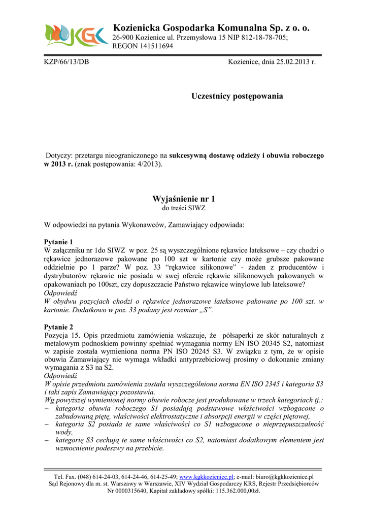 Kozienicka Gospodarka Komunalna Sp. z o. o. 26-900 Kozienice ul. Przemysłowa 15 NIP 812-18-78-705; REGON 141511694 KZP/66/13/DB Kozienice, dnia 25.02.2013 r. Uczestnicy postępowania Dotyczy: przetargu nieograniczonego na sukcesywną dostawę odzieży i obuwia roboczego w 2013 r. (znak postępowania: 4/2013). Wyjaśnienie nr 1 do treści SIWZ W odpowiedzi na pytania Wykonawców, Zamawiający odpowiada: Pytanie 1 W załączniku nr 1do SIWZ w poz. 25 są wyszczególnione rękawice lateksowe – czy chodzi o rękawice jednorazowe pakowane po 100 szt w kartonie czy może grubsze pakowane oddzielnie po 1 parze? W poz. 33 “rękawice silikonowe” - żaden z producentów i dystrybutorów rękawic nie posiada w swej ofercie rękawic silikonowych pakowanych w opakowaniach po 100szt, czy dopuszczacie Państwo rękawice winylowe lub lateksowe? Odpowiedź W obydwu pozycjach chodzi o rękawice jednorazowe lateksowe pakowane po 100 szt. w kartonie. Dodatkowo w poz. 33 podany jest rozmiar „S”. Pytanie 2 Pozycja 15. Opis przedmiotu zamówienia wskazuje, że półsaperki ze skór naturalnych z metalowym podnoskiem powinny spełniać wymagania normy EN ISO 20345 S2, natomiast w zapisie została wymieniona norma PN ISO 20245 S3. W związku z tym, że w opisie obuwia Zamawiający nie wymaga wkładki antyprzebiciowej prosimy o dokonanie zmiany wymagania z S3 na S2. Odpowiedź W opisie przedmiotu zamówienia została wyszczególniona norma EN ISO 2345 i kategoria S3 i taki zapis Zamawiający pozostawia. Wg powyższej wymienionej normy obuwie robocze jest produkowane w trzech kategoriach tj.: kategoria obuwia roboczego S1 posiadają podstawowe właściwości wzbogacone o zabudowaną piętę, właściwości elektrostatyczne i absorpcji energii w części piętowej, kategoria S2 posiada te same właściwości co S1 wzbogacone o nieprzepuszczalność wody, kategorię S3 cechują te same właściwości co S2, natomiast dodatkowym elementem jest wzmocnienie podeszwy na przebicie. Tel. Fax. (048) 614-24-03, 614-24-46, 614-25-49; www.kgkkozienice.pl; e-mail: [email protected] Sąd Rejonowy dla m. st. Warszawy w Warszawie, XIV Wydział Gospodarczy KRS, Rejestr Przedsiębiorców Nr 0000315640, Kapitał zakładowy spółki: 115.362.000,00zł. Kozienicka Gospodarka Komunalna Sp. z o. o. 26-900 Kozienice ul. Przemysłowa 15 NIP 812-18-78-705; REGON 141511694 Pytanie 3 Pozycja 16. Ponieważ z opisu pól saperek ze skór naturalnych ocieplanych nie wynika, że ma to być obuwie ochronne zgodnie z wymaganiami normy EN ISO 20345 (posiadać podnosek, wkładkę antyprzebiciową) prosimy o dokonanie modyfikacji zapisów SIWZ i przywołanie właściwej normy EN ISO 2347. Odpowiedz Odpowiedz została udzielona w pytaniu 2. Pytanie 4 Pozycja 21. Czy Zamawiający dopuści kurtkę wykonana z poliestru powleczonego poliuretanem, który ma wyższe parametry użytkowe w postaci przepuszczalności powietrza, co zwiększy komfort pracy użytkownika. Odpowiedź Zamawiający dopuszcza. Pytanie 5 Pozycja 22. Zamawiający wymaga by kurtka ocieplana damska posiadała podszewkę polarową. Czy w celu zwiększenia funkcjonalności kurtki dopuszczalne jest zaoferowanie kurtki z odpinanym polarem, który może być użytkowany samodzielnie, a kurtka będzie spełniać rolę odzieży wielosezonowej? Odpowiedź Zamawiający dopuszcza. Pytanie 6 Pozycja 24. Prosimy o precyzyjne określenie z jakiego tworzywa mają być wykonane „rękawice gumowe, gospodarcze flokowane (nie lateksowe)”, ponieważ składnikiem każdego tworzywa gumowego jest lateks naturalny? Odpowiedź Chodzi o rękawice gospodarcze do polnych prac. Pytanie 7 Pozycja 33. Prosimy o sprecyzowanie o jakiego typu rękawice chodzi, do jakiego typu prac mają być stosowane rękawice? Czy rękawice maja być wykonane z materiału pokrytego silikonem, czy z samego silikonu, ponieważ według naszej wiedzy silikon jako samodzielne tworzywo nie jest stosowany do produkcji rękawic, które mogą być wykorzystywane do pracy w laboratorium. Odpowiedź Odpowiedz została udzielona w pytaniu 1. Ponadto informujemy, ze termin składania ofert nie ulega zmianie. Prezes Zarządu – Robert Wojcieszek Tel. Fax. (048) 614-24-03, 614-24-46, 614-25-49; www.kgkkozienice.pl; e-mail: [email protected] Sąd Rejonowy dla m. st. Warszawy w Warszawie, XIV Wydział Gospodarczy KRS, Rejestr Przedsiębiorców Nr 0000315640, Kapitał zakładowy spółki: 115.362.000,00zł.