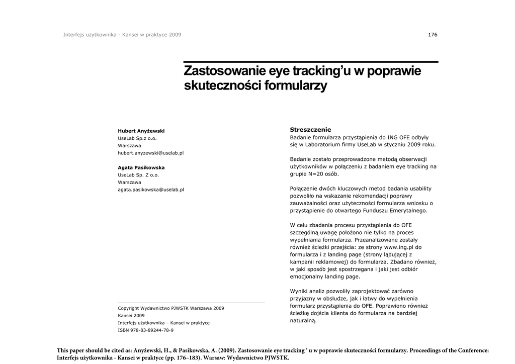 Interfejs użytkownika - Kansei w praktyce 2009 176 Zastosowanie eye tracking’u w poprawie skuteczności formularzy Hubert Anyżewski Streszczenie UseLab Sp.z o.o. Badanie formularza przystąpienia do ING OFE odbyły się w Laboratorium firmy UseLab w styczniu 2009 roku. Warszawa [email protected] Agata Pasikowska UseLab Sp. Z o.o. Badanie zostało przeprowadzone metodą obserwacji użytkowników w połączeniu z badaniem eye tracking na grupie N=20 osób. Warszawa [email protected] Połączenie dwóch kluczowych metod badania usability pozwoliło na wskazanie rekomendacji poprawy zauważalności oraz użyteczności formularza wniosku o przystąpienie do otwartego Funduszu Emerytalnego. W celu zbadania procesu przystąpienia do OFE szczególną uwagę położono nie tylko na proces wypełniania formularza. Przeanalizowane zostały również ścieżki przejścia: ze strony www.ing.pl do formularza i z landing page (strony lądującej z kampanii reklamowej) do formularza. Zbadano również, w jaki sposób jest spostrzegana i jaki jest odbiór emocjonalny landing page. Copyright Wydawnictwo PJWSTK Warszawa 2009 Kansei 2009 Interfejs użytkownika – Kansei w praktyce Wyniki analiz pozwoliły zaprojektować zarówno przyjazny w obsłudze, jak i łatwy do wypełnienia formularz przystąpienia do OFE. Poprawiono również ścieżkę dojścia klienta do formularza na bardziej naturalną. ISBN 978-83-89244-78-9 This paper should be cited as: Anyżewski, H., & Pasikowska, A. (2009). Zastosowanie eye tracking ’ u w poprawie skuteczności formularzy. Proceedings of the Conference: Interfejs użytkownika - Kansei w praktyce (pp. 176–183). Warsaw: Wydawnictwo PJWSTK. Interfejs użytkownika - Kansei w praktyce 2009 Badanie miało na celu wskazanie rekomendacji poprawy zauważalności oraz użyteczności formularza wniosku o przystąpienie do Otwartego Funduszu Emerytalnego ING. 177 PESEL, zrozumienie określenia uposażony, oraz korzystanie z tzw. captchy Do kluczowych rekomendacji zmian należą: Badanie zostało przeprowadzone metodą obserwacji użytkowników (technologia Morae) w połączeniu z badaniem eye tracking na grupie N=20 osób. Przebadano szczegółowo: ścieżki przejścia klienta ze strony www.ing.pl do formularza, ścieżkę przejścia klienta z landing page do formularza przejście formularza OFE, spostrzeganie i odbiór emocjonalny landing page Wyniki analiz wskazują, że: na landing page elementem najbardziej przyciągającym wzrok osób badanych był button „Po raz pierwszy przystępuje do ING OFE”, ten element wśród 90% osób badanych był ścieżką wejścia do formularza boks opisujący proces przystąpienia do ING OFE był zauważalny przez 86% osób badanych, jednak 50% osób nie ukończyło zadania, którego celem było wskazanie tego elementu najtrudniejszym krokiem formularza przystąpienia do OFE był krok 1, gdzie osoby badane popełniały najwięcej błędów błędne wprowadzanie daty urodzenia w kroku 1 formularza było przyczyną nieukończenia zadania 2 Do kluczowych problemów w ramach wypełnia formularza zaliczono: wpisywanie numeru przeniesienie boks’u z informacją o procesie przystąpienia do OFE w centralną część strony, w celu zwiększenia jego zauważalności (landing page) usunięcie konieczności wyboru dla użytkownika: zniesienie podziału na dwa wnioski przystąpienia do OFE na rzecz jednego przycisku otwierającego formularz (landing page) czytelniejsze oznaczenie pół wymaganych (formularz) zmianę pola daty urodzenia na bardziej intuicyjną (formularz) przearanżowanie formularza tak, aby wszystkie pola typu input znajdowały się w linii skanowania wzrokiem poprawienie systemu CAPTCHy oraz pola PESEL wyjaśnienie terminu „uposażony”, niezrozumiałego dla użytkowników OPIS I CEL BADAŃ Metoda: Badanie wykonane zostało metodą Eyetracking śledzenie gałki ocznej za pomocą stacjonarnego narzędzia TOBII120 HZ na grupie badanych (N=20). Podczas procedury osoby badane miały wykonywać krótkie zadania w obrębie strony lub formularza wniosku online. Cel badania: Badania miały na celu poznanie zauważalności linków prowadzących do formularza online. Interfejs użytkownika - Kansei w praktyce 2009 Analizę samego formularza wraz z wskazaniem kluczowych problemów na jakie natrafiają badani. Wskazanie rekomendacji poprawy zauważalności oraz użyteczności formularza. W projekcie położono nacisk na szczegółową analizę: ścieżki przejścia klienta ze strony www.ing.pl do formularza, wypełnienie formularza OFE, ścieżkę przejścia klienta z landing page do formularza. Obiekt badania: Obiektem badania był głównie formularz ING OFE, jak również sposób dotarcia do formularza (strona główna oraz landing page). 178 Płeć: Kobiety i mężczyźni (zachowanie równych proporcji) Wykształcenie: Średnie + Miejsce zamieszkania: Warszawa Wewnętrzny podział grupy: 3 osób po raz pierwszy przystępujących do OFE, 1 osób zmieniających OFE. Dodatkowe kryteria: Osoby badane deklarowały korzystanie z Internetu przynajmniej 2 razy w tygodniu. Stosowane analizy: W ramach analiz przeprowadzonych po badaniu zastosowano analizę punktów fiksacji wzroku (m.in. w odniesieniu do kluczowych obszarów i kolejności czasowej występowania) oraz analizę jakościową dla typowych testów obserwacyjnych usability. Każde z zadań zostało opisane czasem realizacji, klasyfikacją wagi błędów oraz komentarzami badanych. Zadania wykonywane podczas testów liczyły pięć sytuacji, które bazowały na odnalezieniu formularza oraz wypełnieniu wniosku realnymi danymi. Dwa zadania z pięciu miały budowę buforową co związane było z konstrukcją badania. Analiza wyników: rysunek 1. Sposób dotarcia do formularza ING OFE Struktura grupy badanych: Grupa badanych odzwierciedlała grupę osób przystępujących do OFE lub zmieniających OFE. Wielkość: N=20 Wiek: 18-26 lat Podczas analizy eye trackingowej w czasie ekspozycji s