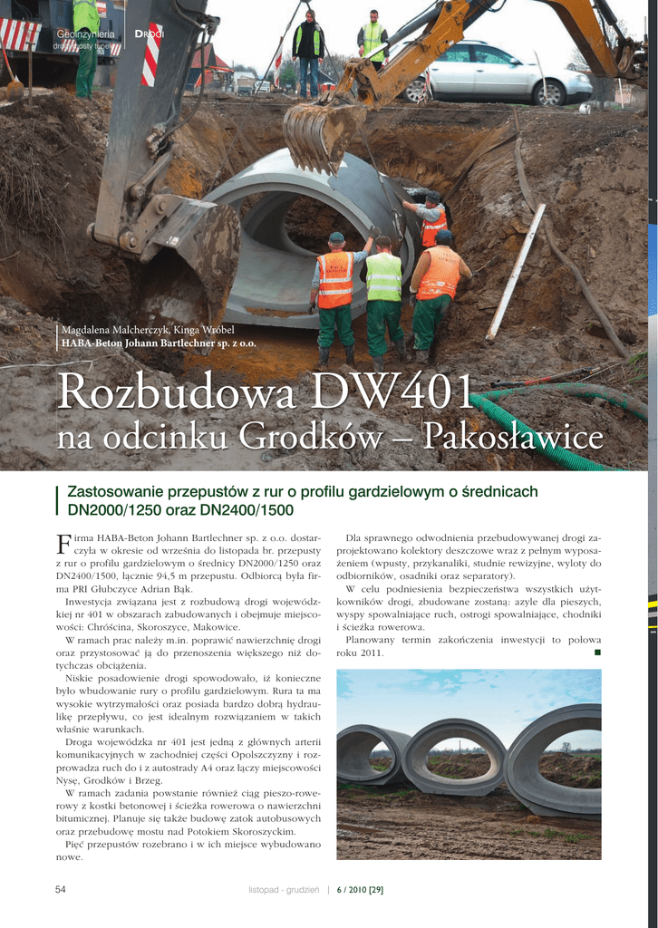 Geoinżynieria DROGI drogi mosty tunele Magdalena Malcherczyk, Kinga Wróbel HABA-Beton Johann Bartlechner sp. z o.o. Rozbudowa DW401 na odcinku Grodków – Pakosławice Zastosowanie przepustów z rur o profilu gardzielowym o średnicach DN2000/1250 oraz DN2400/1500 F irma HABA-Beton Johann Bartlechner sp. z o.o. dostarczyła w okresie od września do listopada br. przepusty z rur o profilu gardzielowym o średnicy DN2000/1250 oraz DN2400/1500, łącznie 94,5 m przepustu. Odbiorcą była firma PRI Głubczyce Adrian Bąk. Inwestycja związana jest z rozbudową drogi wojewódzkiej nr 401 w obszarach zabudowanych i obejmuje miejscowości: Chróścina, Skoroszyce, Makowice. W ramach prac należy m.in. poprawić nawierzchnię drogi oraz przystosować ją do przenoszenia większego niż dotychczas obciążenia. Niskie posadowienie drogi spowodowało, iż konieczne było wbudowanie rury o profilu gardzielowym. Rura ta ma wysokie wytrzymałości oraz posiada bardzo dobrą hydraulikę przepływu, co jest idealnym rozwiązaniem w takich właśnie warunkach. Droga wojewódzka nr 401 jest jedną z głównych arterii komunikacyjnych w zachodniej części Opolszczyzny i rozprowadza ruch do i z autostrady A4 oraz łączy miejscowości Nysę, Grodków i Brzeg. W ramach zadania powstanie również ciąg pieszo-rowerowy z kostki betonowej i ścieżka rowerowa o nawierzchni bitumicznej. Planuje się także budowę zatok autobusowych oraz przebudowę mostu nad Potokiem Skoroszyckim. Pięć przepustów rozebrano i w ich miejsce wybudowano nowe. Dla sprawnego odwodnienia przebudowywanej drogi zaprojektowano kolektory deszczowe wraz z pełnym wyposażeniem (wpusty, przykanaliki, studnie rewizyjne, wyloty do odbiorników, osadniki oraz separatory). W celu podniesienia bezpieczeństwa wszystkich użytkowników drogi, zbudowane zostaną: azyle dla pieszych, wyspy spowalniające ruch, ostrogi spowalniające, chodniki i ścieżka rowerowa. Planowany termin zakończenia inwestycji to połowa roku 2011. 54 6 / 2010 [29] listopad - grudzień ????? Geoinżynieria drogi mosty tunele PROGRAM DOSTAWCZY > rury żelbetowe / betonowe o przekroju okrągłym K-GM i K-FM > rury do mikrotunelowania > rury PEHD z otuliną żelbetową > profil jajowy / przekroje gardzielowe / profile specjalne / profil ramowy > systemy studni > studnie styczne > elementy denne studni system HABA-PERFECT > studnie opuszczane startowe i odbiorcze do mikrotunelowania > odwodnienia liniowe > rury bazaltowe HABA-BETON | Johann Bartlechner Sp. z o.o. | ul. Niemiecka 1 Olszowa PL 47-143 Ujazd | telefon +48/77/405 69 00 | www.haba-beton.pl listopad - grudzień 6 / 2010 [29] 55