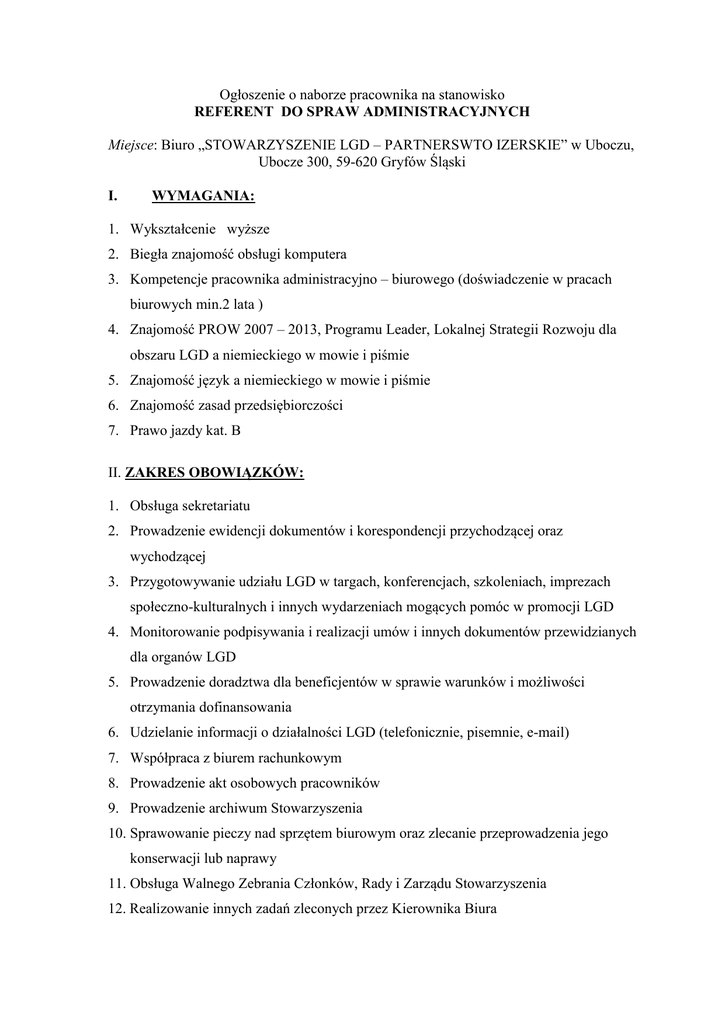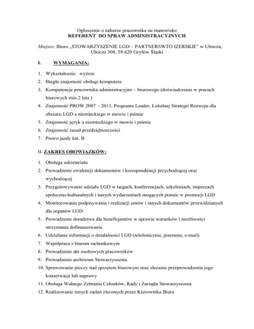 Ogłoszenie o naborze pracownika na stanowisko REFERENT DO SPRAW ADMINISTRACYJNYCH Miejsce: Biuro „STOWARZYSZENIE LGD – PARTNERSWTO IZERSKIE” w Uboczu, Ubocze 300, 59-620 Gryfów Śląski I. WYMAGANIA: 1. Wykształcenie wyższe 2. Biegła znajomość obsługi komputera 3. Kompetencje pracownika administracyjno – biurowego (doświadczenie w pracach biurowych min.2 lata ) 4. Znajomość PROW 2007 – 2013, Programu Leader, Lokalnej Strategii Rozwoju dla obszaru LGD a niemieckiego w mowie i piśmie 5. Znajomość język a niemieckiego w mowie i piśmie 6. Znajomość zasad przedsiębiorczości 7. Prawo jazdy kat. B II. ZAKRES OBOWIĄZKÓW: 1. Obsługa sekretariatu 2. Prowadzenie ewidencji dokumentów i korespondencji przychodzącej oraz wychodzącej 3. Przygotowywanie udziału LGD w targach, konferencjach, szkoleniach, imprezach społeczno-kulturalnych i innych wydarzeniach mogących pomóc w promocji LGD 4. Monitorowanie podpisywania i realizacji umów i innych dokumentów przewidzianych dla organów LGD 5. Prowadzenie doradztwa dla beneficjentów w sprawie warunków i możliwości otrzymania dofinansowania 6. Udzielanie informacji o działalności LGD (telefonicznie, pisemnie, e-mail) 7. Współpraca z biurem rachunkowym 8. Prowadzenie akt osobowych pracowników 9. Prowadzenie archiwum Stowarzyszenia 10. Sprawowanie pieczy nad sprzętem biurowym oraz zlecanie przeprowadzenia jego konserwacji lub naprawy 11. Obsługa Walnego Zebrania Członków, Rady i Zarządu Stowarzyszenia 12. Realizowanie innych zadań zleconych przez Kierownika Biura III .WARUNKI ZATRUDNIENIA : Umowa o pracę IV. KANDYDAT ZOBOWIĄZANY JEST ZŁOŻYĆ: 1. 2. 3. 4. 5. list motywacyjny CV kserokopie dokumentów potwierdzających wykształcenie kserokopie zaświadczeń o ukończonych kursach dokumenty potwierdzające staż pracy Oferty należy składać w zamkniętych kopertach z dopiskiem „Dotyczy na stanowisko Pracownika Biura LGD – „Partnerstwo Izerskie” w terminie do 17.05.2011 r. do godz. 13:00 osobiście w biurze Stowarzyszenia LGD „PARTNESTWO IZERSKIE” w Uboczu, Ubocze 300, 59-620 Gryfów Śląski lub za pośrednictwem poczty. Oferty, które wpłyną po upływie określonego terminu nie będą rozpatrywane. Procedura rekrutacyjna składa się z dwóch etapów: 1. selekcja wstępna – analiza dokumentów pod względem formalnym i zakwalifikowanie kandydatów do rozmowy kwalifikacyjnej 2. selekcja merytoryczna – rozmowa kwalifikacyjna Informacja o wynikach naboru zostanie opublikowana na stronie internetowej LGD