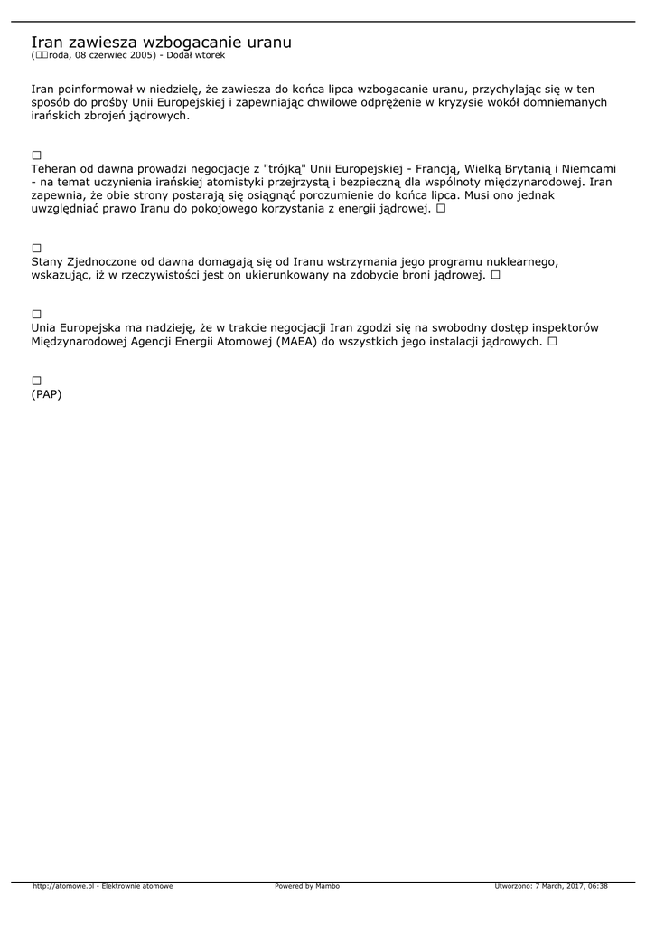 Iran zawiesza wzbogacanie uranu (Å›roda, 08 czerwiec 2005) - Dodał wtorek Iran poinformował w niedzielę, że zawiesza do końca lipca wzbogacanie uranu, przychylając się w ten sposób do prośby Unii Europejskiej i zapewniając chwilowe odprężenie w kryzysie wokół domniemanych irańskich zbrojeń jądrowych. Teheran od dawna prowadzi negocjacje z "trójką" Unii Europejskiej - Francją, Wielką Brytanią i Niemcami - na temat uczynienia irańskiej atomistyki przejrzystą i bezpieczną dla wspólnoty międzynarodowej. Iran zapewnia, że obie strony postarają się osiągnąć porozumienie do końca lipca. Musi ono jednak uwzględniać prawo Iranu do pokojowego korzystania z energii jądrowej. Stany Zjednoczone od dawna domagają się od Iranu wstrzymania jego programu nuklearnego, wskazując, iż w rzeczywistości jest on ukierunkowany na zdobycie broni jądrowej. Unia Europejska ma nadzieję, że w trakcie negocjacji Iran zgodzi się na swobodny dostęp inspektorów Międzynarodowej Agencji Energii Atomowej (MAEA) do wszystkich jego instalacji jądrowych. (PAP) http://atomowe.pl - Elektrownie atomowe Powered by Mambo Utworzono: 7 March, 2017, 06:38