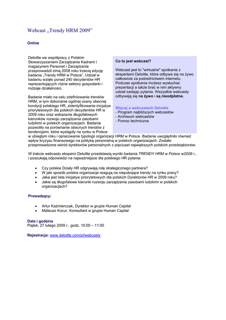 Webcast „Trendy HRM 2009” Online Deloitte we współpracy z Polskim Stowarzyszeniem Zarządzania Kadrami i magazynem Personel i Zarządzanie przeprowadził zimą 2008 roku trzecią edycję badania „Trendy HRM w Polsce”. Udział w badaniu wzięło ponad 240 decydentów HR reprezentujących różne sektory gospodarki i rodzaje działalności. Co to jest webcast? Webcast jest to "wirtualne" spotkanie z ekspertami Deloitte, które odbywa się na żywo całkowicie za pośrednictwem internetu. Podczas spotkania możesz wysłuchać prezentacji a także brać w nim aktywny udział zadając pytania. Wszystkie webcasty odbywają się na żywo i są nieodpłatne. Badanie miało na celu zdefiniowanie trendów HRM, w tym dokonanie ogólnej oceny obecnej kondycji polskiego HR, zidentyfikowanie inicjatyw Więcej o webcastach Deloitte priorytetowych dla polskich decydentów HR w - Program najbliższych webcastów 2009 roku oraz wskazanie długofalowych - Archiwum webcastów kierunków rozwoju zarządzania zasobami - Pomoc techniczna ludzkimi w polskich organizacjach. Badanie pozwoliło na porównanie obecnych trendów z tendencjami, które wystąpiły na rynku w Polsce w ubiegłym roku i opracowanie typologii organizacji HRM w Polsce. Badanie uwzględniło również wpływ kryzysu finansowego na politykę personalną w polskich organizacjach. Zostało przeprowadzone wśród dyrektorów personalnych z pięciuset największych polskich przedsiębiorstw. W trakcie webcastu eksperci Deloitte przedstawią wyniki badania TRENDY HRM w Polsce w2009 r., i poszukają odpowiedzi na najważniejsze dla polskiego HR pytania: • • • • Czy polskie Działy HR odgrywają rolę strategicznego partnera? W jaki sposób polskie organizacje reagują na niepokojące trendy na rynku pracy? Jaka jest lista inicjatyw priorytetowych dla polskich Dyrektorów HR w 2009 roku? Jakie są długofalowe kierunki rozwoju zarządzania zasobami ludzkimi w polskich organizacjach? Prowadzący: • • Artur Kaźmierczak, Dyrektor w grupie Human Capital Mateusz Kocur, Konsultant w grupie Human Capital Data i godzina Piątek, 27 lutego 2009 r., godz. 10:00 – 11:00 Rejestracja: www.deloitte.com/pl/webcasty