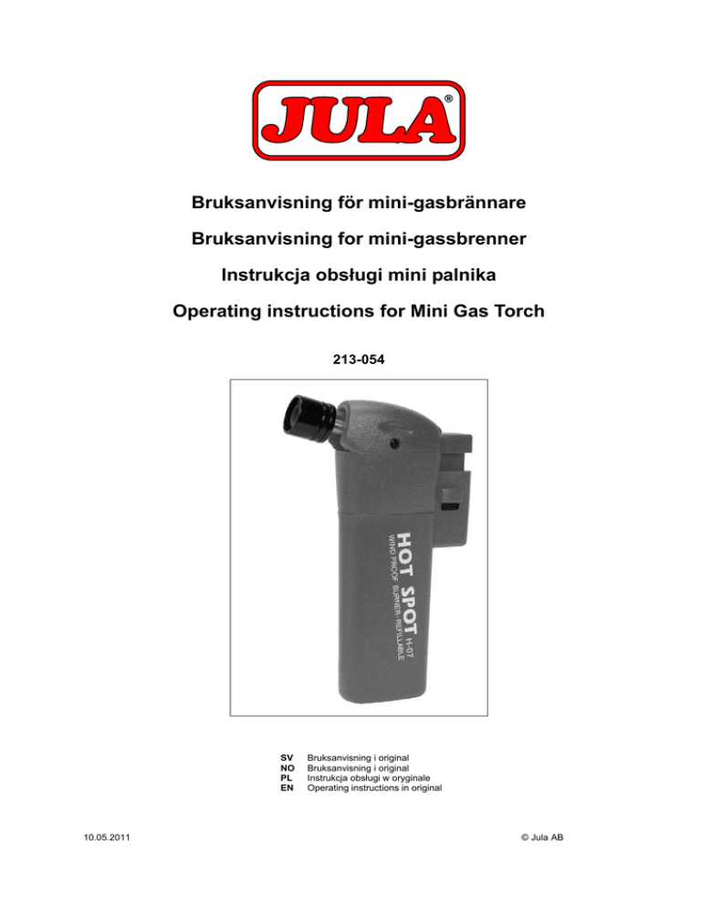 Bruksanvisning för mini-gasbrännare Bruksanvisning for mini-gassbrenner Instrukcja obsługi mini palnika Operating instructions for Mini Gas Torch 213-054 SV NO PL EN 10.05.2011 Bruksanvisning i original Bruksanvisning i original Instrukcja obsługi w oryginale Operating instructions in original © Jula AB SVENSKA SVENSKA SÄKERHETSANVISNINGAR Läs bruksanvisningen noggrant innan användning! Brandfara! Gasbrännaren ska användas på plats med god ventilation, och med stort avstånd till brännbara material eller vätskor. Använd skyddsglasögon när du använder gasbrännaren. Gasbrännaren har mycket het låga som kan ge brännskador. Skydda händer och ansikte. Tänk på att lågan kan vara svår att se. Gasbrännaren ska alltid användas på ett säkert avstånd från brännbara föremål. Överhetta inte gasbrännaren. Använd den inte mer än en minut i taget och låt den svalna innan du använder den på nytt. Håll gasbrännaren upprätt. Lågan kan slockna om du använder den i andra lägen. Låt brännaren kallna helt före påfyllning av gas. Använd endast butangas. Kontrollera att gasbrännaren är helt släckt och har svalnat innan du ställer undan den. Skydda gasbrännaren från direkt solljus och heta föremål. Förvara gasbrännaren utom räckhåll för barn. Gasbrännaren fungerar inte vid mycket kall temperatur. Gasbrännaren får inte modifieras eller demonteras. BESKRIVNING 1. 2. 3. Munstycke Avtryckare Påfyllningsventil HANDHAVANDE Påfyllning av gas 1. 2. 3. 4. 5. 6. Håll i gasbrännaren och dra överdelen uppåt (se fig. 1). Lossa försiktigt tändaren från gasbrännarens överdel (se figur 2). Vänd påfyllningsbehållaren upp och ner och tryck in munstycket i tändarens påfyllningsventil. Tryck försiktigt och fyll tills vätskenivån i tändaren har stigit till ca 80 % (se fig. 3). Det är inte lämpligt att fylla på gas i tändaren om den sitter kvar i gasbrännarens överdel, det kan skada påfyllningsventilen (se fig. 4). Hålet i botten på underdelen är avsett för att släppa ut eventuell läckande gas. Tryck försiktigt upp tändaren i gasbrännarens överdel (se fig. 5). Tändarens reglage för inställning av lågan ska vara framåt. Tryck fast gasbrännarens underdel (se figur 6). Låt gasen stabiliseras i några minuter efter påfyllning innan du börjar använda gasbrännaren. VARNING! Fyll inte tändaren till mer än 80%. Annars kan överskottet spruta ut när du ansluter tändaren till gasbrännaren. Det kan leda till brännskada eller brandfara. Tändning av gasbrännaren Tryck ner avtryckaren (2) med tummen (se fig. 7). Du behöver kanske trycka en eller ett par gånger för att tända gasbrännaren. Håll ner avtryckaren (2) så länge som du tycker att lågan ska brinna. 2 SVENSKA Släck gasbrännaren Släpp avtryckaren (2) för att släcka gasbrännaren (se fig. 8). Lågan slocknar efter en liten stund. VARNING! Kontrollera att gasbrännaren är helt släckt innan du ställer bort den. Läckande gas kan brinna länge efter att du har släppt avtryckaren. Med reservation för tryckfel och konstruktionsändringar som vi ej kan råda över. Vid eventuella problem, kontakta vår serviceavdelning på telefon: 0200-88 55 88. Jula AB, Box 363, 532 24 SKARA www.jula.se NORSK 3 NORSK SIKKERHETSANVISNINGER Les bruksanvisningen nøye før bruk! Brannfare! Gassbrenneren skal brukes på steder med god ventilasjon og med stor avstand til brennbare materialer eller væsker. Bruk vernebriller og -hansker når du bruker gassbrenneren. Gassbrenneren har svært varm flamme som kan gi brannskader. Beskytt hender og ansikt. Husk at det kan være vanskelig å se flammen. Gassbrenneren skal alltid brukes på sikker avstand fra brennbare gjenstander. Gassbrenneren må ikke overopphetes. Den må ikke brukes mer enn 1 minutt om gangen, og du må alltid la den avkjøles før du bruker den på nytt. Hold gassbrenneren loddrett. Flammen kan slokne hvis du bruker den i andre posisjoner. La brenneren avkjøles helt før påfylling av gass. Bruk kun butangass ved påfylling. Kontroller at gassbrenneren er helt slukket og kald før du setter den bort. Beskytt gassbrenneren mot direkte sollys og varme gjenstander. Oppbevares utilgjengelig for barn. Gassbrenneren virker ikke ved svært lave temperaturer. Gassbrenneren må ikke modifiseres eller demonteres. BESKRIVELSE 1. 2. 3. Brenner Avtrykker Påfyllingsventi BRUK Påfylling av gass 1. 2. 3. 4. 5. 6. Hold i gassbrenneren og trekk overdelen oppover (se fig. 1). Løsne tenneren forsiktig fra gassbrennerens overdel (se fig. 2). Snu påfyllingsbeholderen opp ned og trykk inn munnstykket i tennerens påfyllingsventil. Trykk forsiktig og fyll til væskenivået i tenneren har steget til cirka 80 % (se fig. 3). Du må ikke fylle på gass i tenneren hvis den fortsatt sitter på gassbrennerens overdel, da dette kan skade påfyllingsventilen (se fig. 4) (hullet i bunnen på underdelen skal slippe ut ev. lekkende gass). Trykk tenneren forsiktig opp i gassbrennerens overdel (se fig. 5). (tennerens regulator for innstilling av flammen skal peke fremover) og trykk fast gassbrennerens underdel (se fig. 6). La gassen stabiliseres i noen minutter etter påfylling før du tar gassbrenneren i bruk. ADVARSEL! Ikke fyll tenneren til mer enn 80 %, det svært brannfarlige overskuddet kommer til å sprute ut når du kobler tenneren til gassbrenneren, noe som kan føre til brannskade eller brannfare. Tenne gassbrenneren Trykk ned avtrykkeren med tommelen (se fig. 7). Du må kanskje trykke et par ganger for å tenne gassbrenneren. Hold avtrykkeren nede (2) så lenge du ønsker at flammen skal brenne. 4 NORSK Slukke gassbrenneren Slipp avtrykkeren (2) for å slukke gassbrenneren (se fig. 8). Flammen slukner etter en liten stund. ADVARSEL! Kontroller at gassbrenneren er helt slukket før du setter den bort (lekkende gass kan brenne lenge etter at du har sluppet avtrykkeren). Med forbehold om trykkfeil og konstruksjonsendringer utenfor vår k