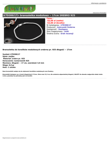 Informacje o produkcie Utworzono 07-03-2017 (ŁTD300/17)- bransoletka modułowa ~ 17cm SREBRO 925 Cena : 43,09 zł (netto) 53,00 zł (brutto) Nr katalogowy : ŁTD300/17 Producent : Łańcuszki Srebrne Dostępność : Dostępny Stan magazynowy : niski Średnia ocena : brak recenzji Bransoletka do koralików modułowych srebrna pr. 925 długość ~ 17cm Symbol: ŁTD300/17 Splot: żmijka Materiał: srebro pr. 925 Oznaczenie: numerownik 925 Wymiary: długość ~ 17 cm, szerokość 3,0 mm Waga: 6,0 gr Ilość: 1 sztuka Baza bransoletki nadaje się do większości koralików modułowych oraz Pandory. Bransoletki dostępne są w trzech długościach 17,5cm, 20cm oraz 21,5 cm, dla ustalenia odpowiedniej długości, NALEŻY do obwodu nadgarstka dodać około 2,5cm, powstały luz potrzebny jest na koraliki. Wygenerowano w programie www.oscGold.com