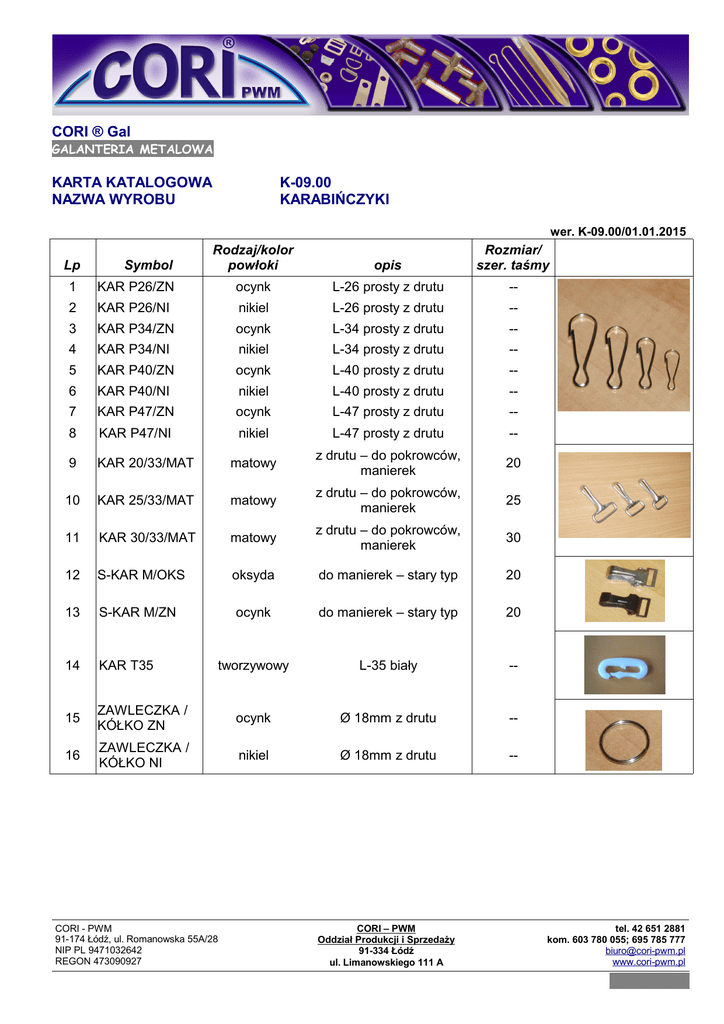 CORI ® Gal GALANTERIA METALOWA KARTA KATALOGOWA NAZWA WYROBU K-09.00 KARABIŃCZYKI wer. K-09.00/01.01.2015 Rodzaj/kolor powłoki opis Rozmiar/ szer. taśmy KAR P26/ZN ocynk L-26 prosty z drutu -- 2 KAR P26/NI nikiel L-26 prosty z drutu -- 3 KAR P34/ZN ocynk L-34 prosty z drutu -- 4 KAR P34/NI nikiel L-34 prosty z drutu -- 5 KAR P40/ZN ocynk L-40 prosty z drutu -- 6 KAR P40/NI nikiel L-40 prosty z drutu -- 7 KAR P47/ZN ocynk L-47 prosty z drutu -- 8 KAR P47/NI nikiel L-47 prosty z drutu -- 9 KAR 20/33/MAT matowy z drutu – do pokrowców, manierek 20 10 KAR 25/33/MAT matowy z drutu – do pokrowców, manierek 25 11 KAR 30/33/MAT matowy z drutu – do pokrowców, manierek 30 12 S-KAR M/OKS oksyda do manierek – stary typ 20 13 S-KAR M/ZN ocynk do manierek – stary typ 20 14 KAR T35 tworzywowy L-35 biały -- 15 ZAWLECZKA / KÓŁKO ZN ocynk Ø 18mm z drutu -- 16 ZAWLECZKA / KÓŁKO NI nikiel Ø 18mm z drutu -- Lp Symbol 1 CORI - PWM 91-174 Łódź, ul. Romanowska 55A/28 NIP PL 9471032642 REGON 473090927 CORI – PWM Oddział Produkcji i Sprzedaży 91-334 Łódź ul. Limanowskiego 111 A tel. 42 651 2881 kom. 603 780 055; 695 785 777 [email protected] www.cori-pwm.pl