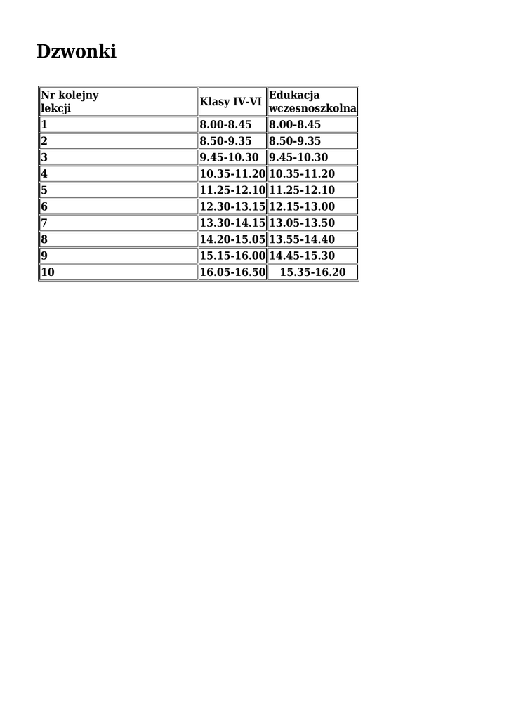 Dzwonki Nr kolejny lekcji 1 2 3 4 5 6 7 8 9 10 Edukacja wczesnoszkolna 8.00-8.45 8.00-8.45 8.50-9.35 8.50-9.35 9.45-10.30 9.45-10.30 10.35-11.20 10.35-11.20 11.25-12.10 11.25-12.10 12.30-13.15 12.15-13.00 13.30-14.15 13.05-13.50 14.20-15.05 13.55-14.40 15.15-16.00 14.45-15.30 16.05-16.50 15.35-16.20 Klasy IV-VI