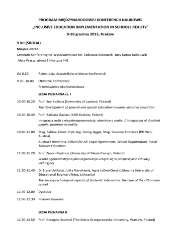 PROGRAM MIĘDZYNARODOWEJ KONFERENCJI NAUKOWEJ „INCLUSIVE EDUCATION IMPLEMENTATION IN SCHOOLS REALITY” 9-10 grudnia 2015, Kraków 9 XII (ŚRODA) Miejsce obrad: Centrum Konferencyjno-Wystawiennicze im. Tadeusza Kościuszki przy Kopcu Kościuszki Aleja Waszyngtona 1 (Kurtyna I-V) Od 8.30 Rejestracja Uczestników w biurze Konferencji 9.30 -10.00 Otwarcie Konferencji Przemówienia okolicznościowe SESJA PLENARNA cz. I 10.00-10.20 Prof. Suvi Lakkala (University of Lapland, Finland) The development of general and special education towards inclusive education 10.20-10.40 Prof. Barbara Gąciarz (AGH Kraków, Poland) Integracja osób z niepełnosprawnością: obietnice a realia. / Integration of disabled people: promises vs reality 10.40-11.00 Mag. Sabine Albert, Dipl.-Ing. Georg Jäggle, Mag. Susanne Tomecek (PH Vien, Austria) Austria's Road to a ‚School for All. Legal Agreements, School Organization, Initial Teacher Education 11.00-11.20 Prof. Zenon Gajdzica (University of Silesia Cieszyn, Poland) Szkoła ogólnodostępna jako organizacja ucząca się w perspektywie edukacji inkluzyjnej 11.20-11.40 Dr Stasė Ustilaitė, Julita Navaitienė, Agnė Juškevičienė (Lithuania University of Educational Science Vilnius, Lithuania) The socio-psychological aspects of students' interaction: the case of the Lithuanian school 11.40-12.00 Dyskusja 12.00-12.30 Przerwa kawowa SESJA PLENARNA II 12.30-12.50 Prof. Grzegorz Szumski (The Maria Grzegorzewska University, Warsaw, Poland) Osiągnięcia szkolne uczniów sprawnych w klasach włączających - metaanaliza badań 12.50-13.10 Prof. Rahel Huber (SSBL, Switzerland) Inclusion in der Lebenswelt schwerbehinderter Menschen in der Stiftung für Schwerbehinderte Luzern, SSBL 13.10-13.30 Prof. Jolanta Baran (Pedagogical University of Cracow, Poland) Edukacja inkluzyjna – to dziś. Co jutro? Czy i jaka(ś) postinkluzja? (O stanie edukacji inkluzyjnej i prognozach) 13.30-13.50 Prof. Olle Johansson, (The Experimental Dermatology Unit Department of Neuroscience Karolinska Institute Stockholm, Sweden) Nadwrażliwość na pole elektromagnetyczne 13.50-14.00 Dr Danuta Baraniewicz (Pedagogical University of Cracow, Poland) Porozmawiajmy o szkole. W poszukiwaniu lepszego modelu szkoły 14.00-14.30 Dyskusja 14.30-15.30 Przerwa obiadowa; dla chętnych Uczestników wejście na Kopiec SESJA PLENARNA III: PREZENTACJA PROJEKTU „INCLUSIVE EDUCATION: SOCIOPSYCHOLOGICAL, EDUCATIONAL, SOCIOLOGICAL ASPECTS” I WYNIKÓW I ETAPU BADAŃ 15.30-15.50 Prof Alvyra Galkiene (Lithuania University of Educational Science Vilnius, Lithuania) Connections among Inclusive Education Ideas: four European Countries 15.50-16.10 Mag. Sabine Albert, Dipl.-Ing. Georg Jäggle, Mag. Susanne Tomecek (PH Vien, Austria) Relacje pomiędzy rodzicami a nauczycielami w szkole inkluzyjnej w Austrii – raport z badań 16.10-16.30 Prof. Suvi Lakkala, dr Outi Kyro-Ammala (University of Lapland, Finland) Relacje pomiędzy dziećmi i nauczycielami w szkole inkluzyjnej w Finlandii – raport z badań 16.30-16.50 Prof Alvyra Galkiene ,Dr Stasė Ustilaitė, Julita Navaitienė, Agnė Juškevičienė (Lithuania University of Educational Science Vilnius, Lithuania) Relacje miedzy dziećmi w szkole inkluzyjnej na Litwie – raport z badań 16.50-17.10 Dr Remigiusz Kijak, dr Tamara Cierpiałowska, dr Joanna Kossewska (Pedagogical University of Cracow, Poland) Relacje pomiędzy nauczycielami w szkole inkluzyjnej w Polsce – raport z badań 17.10-17.30 Podsumowanie 1. dnia Konferencji 10 XII (CZWARTEK) Miejsce: Zespół Szkół Ogólnokształcących Integracyjnych nr 1, sala gimnastyczna Aleja Kijowska 3 12.30-12.55 Występ uczniów Zespołu Szkół Ogólnokształcących Integracyjnych 12.55-13.05 Prezentacja nauczycieli ZSS nr 4 w Sosnowcu Świat idealny. Zintegrowany system opieki nad osobami z niepełnosprawnością WARSZTATY DLA NAUCZYCIELI* 13.10-14.30 Warsztaty cz. I (do wyboru A, B, C, D) 14.30-15.00 Przerwa kawowa 15.00-16.20 Warsztaty cz. II (do wyboru A, B, C, D) 16.20-16.30 Rozdanie międzynarodowych certyfikatów uczestnictwa Pożegnanie Uczestników Konferencji ---------* Uczestnicy wybierają warsztaty, w których chcą uczestniczyć podczas rejestracji pierwszego dnia; każdy Uczestnik ma prawo wyboru dwóch warsztatów, spośród czterech następujących: A. Coaching nauczycielski i rodzinny – doskonalenie i rozwój kompetencji wychowawczych Prowadzenie: Michał Kuś – psycholog i coach i dr Anna Bombińska-Domżał – pedagog; B. Doradztwo zawodowe – wykorzystanie gier w doradztwie zawodowym Prowadzenie: Ewa Saniternik-Krewniak – pedagog i doradca zawodowy; C. Nadwrażliwość na pola elektromagnetyczne - dysfunkcja XXI w Prowadzenie: dr Barbara Gałdzińska-Calik D. Praktyczne aspekty inkluzji osób z autyzmem Prowadzenie: mgr Adam Lorenc pedagog specjalny, specjalizujący się w pracy z osobami ze spektrum autyzmu (nr sal w których odbędą się warsztaty zostaną podane w komunikatach ustnych)