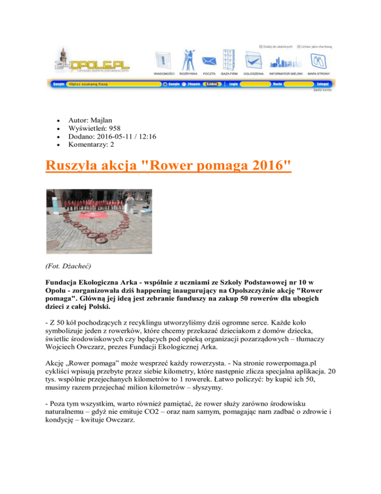 Autor: Majlan Wyświetleń: 958 Dodano: 2016-05-11 / 12:16 Komentarzy: 2 Ruszyła akcja "Rower pomaga 2016" (Fot. Dżacheć) Fundacja Ekologiczna Arka - wspólnie z uczniami ze Szkoły Podstawowej nr 10 w Opolu - zorganizowała dziś happening inaugurujący na Opolszczyźnie akcję "Rower pomaga". Główną jej ideą jest zebranie funduszy na zakup 50 rowerów dla ubogich dzieci z całej Polski. - Z 50 kół pochodzących z recyklingu utworzyliśmy dziś ogromne serce. Każde koło symbolizuje jeden z rowerków, które chcemy przekazać dzieciakom z domów dziecka, świetlic środowiskowych czy będących pod opieką organizacji pozarządowych – tłumaczy Wojciech Owczarz, prezes Fundacji Ekologicznej Arka. Akcję „Rower pomaga” może wesprzeć każdy rowerzysta. - Na stronie rowerpomaga.pl cykliści wpisują przebyte przez siebie kilometry, które następnie zlicza specjalna aplikacja. 20 tys. wspólnie przejechanych kilometrów to 1 rowerek. Łatwo policzyć: by kupić ich 50, musimy razem przejechać milion kilometrów – słyszymy. - Poza tym wszystkim, warto również pamiętać, że rower służy zarówno środowisku naturalnemu – gdyż nie emituje CO2 – oraz nam samym, pomagając nam zadbać o zdrowie i kondycję – kwituje Owczarz.