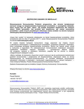 BEZPIECZNE ZABAWKI OD MIKOŁAJA? Stowarzyszenie Konsumentów Polskich przypomina, aby okresie świątecznym zwracać uwagę na bezpieczeństwo kupowanych produktów, a szczególnie zabawek, które muszą być nie tylko „fajne”, ale przede wszystkim bezpieczne dla naszych dzieci. Gdzie sprawdzić, czy produkt jest bezpieczny, jak czytać oznaczenia produktów i wiele innych przydatnych informacji można znaleźć na stronie kampanii edukacyjnej Stowarzyszenia na www.bezryzka.skp.pl „Kupuj bez ryzyka” to kampania edukacyjna na temat bezpieczeństwa produktów, która prowadzona jest do dnia 31 grudnia 2011 r. przez Stowarzyszenie Konsumentów Polskich na stronie www.bezryzyka.skp.pl. W czasie trwania kampanii konsumenci mogą zapoznać się między innymi z aktualnymi informacjami o niebezpiecznych produktach, przepisami prawnymi, artykułami, które przybliżają tematykę bezpieczeństwa produktów. Można też będzie wziąć udział w konkursie z nagrodami. Po niebezpiecznych konsumenckich meandrach oprowadzi czytelników bohaterka naszych opowieści – sympatyczna Babcia Stasia. Jej przygody, opisane w dziesięciu odcinkach, pojawią się na stronie w średnio cotygodniowych odstępach czasu. „Mamy nadzieję, że kampania „Kupuj bez ryzyka” przyczyni się do podniesienia świadomości polskich konsumentów i zwiększenia ich bezpieczeństwa. Zapraszam także na stronę Stowarzyszenia na facebook.com/konsumenci, co umożliwi łatwiejsze otrzymywanie aktualnych informacji o artykułach i konkursach organizowanych w ramach kampanii.” – mówi Grażyna Rokicka, Prezes Stowarzyszenia Konsumentów Polskich. Zadanie finansowane jest ze środków Urzędu Ochrony Konkurencji i Konsumentów. Więcej informacji na stronie www.bezryzyka.skp.pl Kontakt: Paweł Rokicki +48 501 707 677 [email protected] --------------------------------------------------------------------Stowarzyszenie Konsumentów Polskich (SKP) jest niezależną organizacją pożytku publicznego, która już od 1995 roku broni praw i interesów konsumentów. SKP udziela porad prawnych, konsultuje nowe przepisy konsumenckie, jest organizatorem licznych akcji edukacyjnych, w tym największej konsumenckiej imprezy edukacyjnej w kraju - Targów Wiedzy Konsumenckiej. ul. Gizów 6, 01-249 Warszawa, tel./fax (22) 634 06 68 e-mail: [email protected], www.konsumenci.org, www.facebook.com/konsumenci