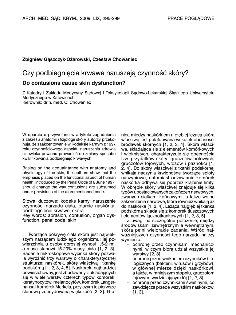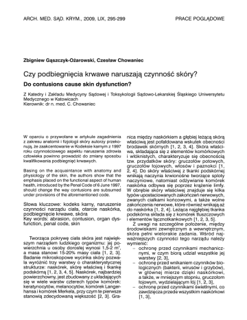 ARCH. MED. SĄD. KRYM., 2009, LIX, 295-299 PRACE POGLĄDOWE Zbigniew Gąszczyk-Ożarowski, Czesław Chowaniec Czy podbiegnięcia krwawe naruszają czynność skóry? Do contusions cause skin dysfunction? Z Katedry i Zakładu Medycyny Sądowej i Toksykologii Sądowo-Lekarskiej śląskiego Uniwersytetu Medycznego w Katowicach Kierownik: dr n. med. C. Chowaniec W oparciu o przywołane w artykule zagadnienia z zakresu anatomii i fizjologii skóry autorzy przekonują, że zaakcentowanie w Kodeksie karnym z 1997 roku czynnościowego aspektu naruszenia zdrowia człowieka powinno prowadzić do zmiany sposobu kwalifikowania podbiegnięć krwawych. basing on the acquaintance with anatomy and physiology of the skin, the authors show that the emphasis placed on the functional aspect of human health, introduced by the Penal Code of 6 June 1997, should change the way contusions are subsumed under provisions of the aforementioned code. Słowa kluczowe: kodeks karny, naruszenie czynności narządu ciała, otarcie naskórka, podbiegnięcie krwawe, skóra Key words: abrasion, contusion, organ dysfunction, penal code, skin Tworząca pokrywę ciała skóra jest największym narządem ludzkiego organizmu: jej po2 wierzchnia u osoby dorosłej wynosi 1,5-2 m , a masa stanowi 15-20% masy ciała [1, 2, 3]. badanie mikroskopowe wycinka skóry pozwala wyróżnić trzy warstwy o charakterystycznej strukturze: naskórek, skórę właściwą i tkankę podskórną [1, 2, 3, 4, 5]. Naskórek, najbardziej powierzchowny, jest zbudowany z układających się w wiele warstw czterech typów komórek: keratynocytów, melanocytów, komórek Langerhansa i komórek Merkela, przy czym te pierwsze stanowią zdecydowaną większość [2, 3]. Gra- nica między naskórkiem a głębiej leżącą skórą właściwą jest pofałdowana wskutek obecności brodawek skórnych [1, 2, 3, 4]. Skóra właściwa, składająca się z elementów komórkowych i włóknistych, charakteryzuje się obecnością tzw. przydatków skóry: gruczołów potowych, gruczołów łojowych, włosów i paznokci [1, 2, 4]. Do skóry właściwej z tkanki podskórnej wnikają naczynia krwionośne tworzące sploty naczyniowe, natomiast odżywianie komórek naskórka odbywa się poprzez krążenie limfy. W obrębie skóry właściwej znajduje się kilka typów upostaciowanych zakończeń nerwowych, zwanych ciałkami końcowymi, a także wolne zakończenia nerwowe, które również wnikają aż do naskórka [1, 2, 4]. Leżąca najgłębiej tkanka podskórna składa się z komórek tłuszczowych i elementów łącznotkankowych [1, 2, 3, 5]. Z uwagi na szczególne położenie, między środowiskami zewnętrznym a wewnętrznym, skóra pełni wielorakie zadania. Wśród najważniejszych czynności tego narządu należy wymienić: – ochronę przed czynnikami mechanicznymi, w czym biorą udział wszystkie jej warstwy [2, 3], – ochronę przed wnikaniem czynników biologicznych (bakterii, wirusów i grzybów), w głównej mierze dzięki naskórkowi, a także, w mniejszym stopniu, gruczołom łojowym, wydzielającym łój [1, 2, 3], – ochronę przed czynnikami świetlnymi, co zawdzięcza przede wszystkim naskórkowi [1, 3], 296 Zbigniew Gąszczyk-Ożarowski – ochronę przed działaniem czynników chemicznych, w głównej mierze dzięki naskórkowi [1, 2, 3], – funkcję homeostatyczną, polegającą na regulowaniu gospodarki cieplnej i wodnoelektrolitowej, w czym przede wszystkim biorą udział naskórek, naczynia krwionośne i gruczoły potowe, a także podskórna tkanka tłuszczowa [1, 2, 3], – funkcję recepcyjną, możliwą dzięki obecności wolnych i upostaciowanych zakończeń nerwowych [1, 2], – wewnątrzwydzielniczą, np. polegającą na wytwarzaniu przez naskórek cholekalcyferolu [2], – immunologiczną, związaną z obecnością prezentujących antygen komórek Langerhansa [1, 2]. Wydaje się, że można wyróżnić funkcje, których wykonywanie zostaje upośledzone już przy uszkodzeniu niewielkiej powierzchni skóry, oraz takie, które ulegają upośledzeniu dopiero wskutek uszkodzenia znacznej powierzchni 1 skóry . Z uwagi na wymierną trudność ustalenia ścisłego kryterium podziału wyodrębnienie tych dwóch grup ma, jak to nieraz bywa w naukach przyrodniczych, charakter typologii, a nie podziału logicznego. I tak, do pierwszej grupy można niewątpliwie zaliczyć funkcję ochrony przed czynnikami chorobotwórczymi i chemicznymi, albowiem już drobne naruszenie ciągłości powłok ciała umożliwia penetrację przez drobnoustroje czy związki chemiczne; do drugiej grupy można przede wszystkim zaliczyć czynność wewnątrzwydzielniczą czy homeostatyczną, gdyż np. dopiero uszkodzenie przez uraz termiczny dużej powierzchni naskórka prowadzi do zaburzeń gospodarki wodno-elektrolitowej. Istnieją też takie funkcje skóry, np. mechaniczna czy recepcyjna, których przynależność do którejś z powyższych grup należałoby ustalać w oparciu o konkretny przypadek kliniczny. Podbiegnięcie krwawe, zwane również siń2 cem , powstaje wskutek urazu mechanicznego, który powoduje przerwanie ciągłości ścian naczyń krwionośnych i wynaczynienie krwi do otaczających tkanek miękkich [7, 8, 9, 10, 11, 12, 13]. Choć podbiegnięcie krwawe może, co do zasady, powstać zarówno w skórze, jak 1 2 Nr 4 i leżących głębiej tkankach i narządach, z oczywistych powodów badanie fizykalne żyjącego pokrzywdzonego ogranicza się do badania powłok ciała. Rozległość podbiegnięcia krwawego w głównej mierze zależy od siły urazu i umiejscowienia anatomicznego [7, 8, 9]. Uraz, który godzi w powłoki brzuszne, z daleko mniejszym prawdopodobieństwem spowoduje wynaczynienie krwi w skórze, niż uraz godzący w okolicę ciała, gdzie skóra jest cienka i opięta na kości, np. w okolicy oczodołu czy kości piszczelowej [7, 8]. Ze znajomości patofizjologii powstawania podbiegnięcia krwawego wynika, że jest ono uszkodzeniem ciała sensu 