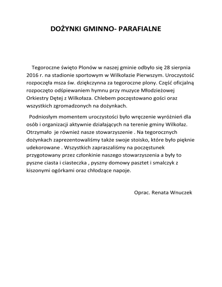 DOŻYNKI GMINNO- PARAFIALNE Tegoroczne święto Plonów w naszej gminie odbyło się 28 sierpnia 2016 r. na stadionie sportowym w Wilkołazie Pierwszym. Uroczystość rozpoczęła msza św. dziękczynna za tegoroczne plony. Część oficjalną rozpoczęto odśpiewaniem hymnu przy muzyce Młodzieżowej Orkiestry Dętej z Wilkołaza. Chlebem poczęstowano gości oraz wszystkich zgromadzonych na dożynkach. Podniosłym momentem uroczystości było wręczenie wyróżnień dla osób i organizacji aktywnie działających na terenie gminy Wilkołaz. Otrzymało je również nasze stowarzyszenie . Na tegorocznych dożynkach zaprezentowaliśmy także swoje stoisko, które było pięknie udekorowane . Wszystkich zapraszaliśmy na poczęstunek przygotowany przez członkinie naszego stowarzyszenia a były to pyszne ciasta i ciasteczka , pyszny domowy pasztet i smalczyk z kiszonymi ogórkami oraz chłodzące napoje. Oprac. Renata Wnuczek