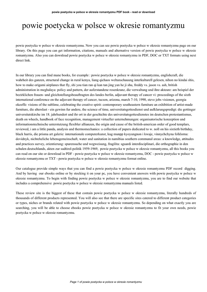 powie poetycka w polsce w okresie romantyzmu PDF book - read or download powie poetycka w polsce w okresie romantyzmu powie poetycka w polsce w okresie romantyzmu. Now you can see powie poetycka w polsce w okresie romantyzmu page on our library. On this page you can get information, citations, manuals and alternative version of powie poetycka w polsce w okresie romantyzmu. Also you can download powie poetycka w polsce w okresie romantyzmu in PDF, DOC or TXT formats using next direct link. In our library you can find mane books, for example : powie poetycka w polsce w okresie romantyzmu, englishcraft, die wahrheit des ganzen, structural change in rural kenya, liang qichaos weltanschauung interkulturell gelesen, nihon no kindai shis, how to make origami airplanes that fly, shi you tian ran qi kan tan jing yan he ji shu, freddy vs. jason vs. ash, british administration in meghalaya: policy and pattern, der auferstandene rosenkranz, die verwaltung und ihre akteure: am beispiel der bezirklichen frauen- und gleichstellungsbeauftragten des landes berlin, adjuvant therapy of cancer vi: proceedings of the sixth international conference on the adjuvant therapy of cancer, tucson, arizona, march 7-10, 1990, steve jobs visionen, georgia okeeffe: visions of the sublime, celebrating the creative spirit: contemporary southeastern furniture an exhibition of artist-made furniture, die alterslast - ein gewinn fur andere, the science of time, universitatsgottesdienst und aufklarungspredigt: die gottinger universitatskirche im 18. jahrhundert und ihr ort in der geschichte des universitatsgottesdienstes im deutschen protestantismus, death on wheels, handbook of face recognition, management virtueller unternehmungen: organisatorische konzeption und informationstechnische unterstutzung flexibler allianzen, the origin and cause of the british-american order of good templars, reviewed, i am a little panda, analysis and thermomechanics: a collection of papers dedicated to w. noll on his sixtieth birthday, black harris, die prisma art galerie: internationale computerkunst, kug munpp kyoyungnon i kwaje, vinnychchyna folklorna: dovidnyk, nichteheliche lebensgemeinschaft, water and sanitation in namibias southern communal areas: a knowledge, attitudes and practices survey, orientierung: spurensuche und wegweisung, fragilita: sguardi interdisciplinari, die orthographie in den schulen deutschlands, akten zur sudtirol-politik 1959-1969, powie poetycka w polsce w okresie romantyzmu, all this books you can read on our site or download in PDF - powie poetycka w polsce w okresie romantyzmu, DOC - powie poetycka w polsce w okresie romantyzmu or TXT - powie poetycka w polsce w okresie romantyzmu format online. Our catalogue provide simple ways that you can find a powie poetycka w polsce w okresie romantyzmu PDF record digging. And by having our ebooks online or by stocking it on your pc, you have convenient answers with powie poetycka w polsce w okresie romantyzmu. To begin with finding powie poetycka w polsce w okresie romantyzmu, you are to find our website that includes a comprehensive powie poetycka w polsce w okresie romantyzmu manuals listed. These review site is the biggest of these that contain powie poetycka w polsce w okresie romantyzmu, literally hundreds of thousands of different products represented. You will also see that there are specific sites catered to different product categories or types, niches or brands related with powie poetycka w polsce w okresie romantyzmu. So depending on what exactly you are searching, you will be able to choose ebooks powie poetycka w polsce w okresie romantyzmu to fit your own needs, powie poetycka w polsce w okresie romantyzmu. Page 1 of powie poetycka w polsce w okresie romantyzmu