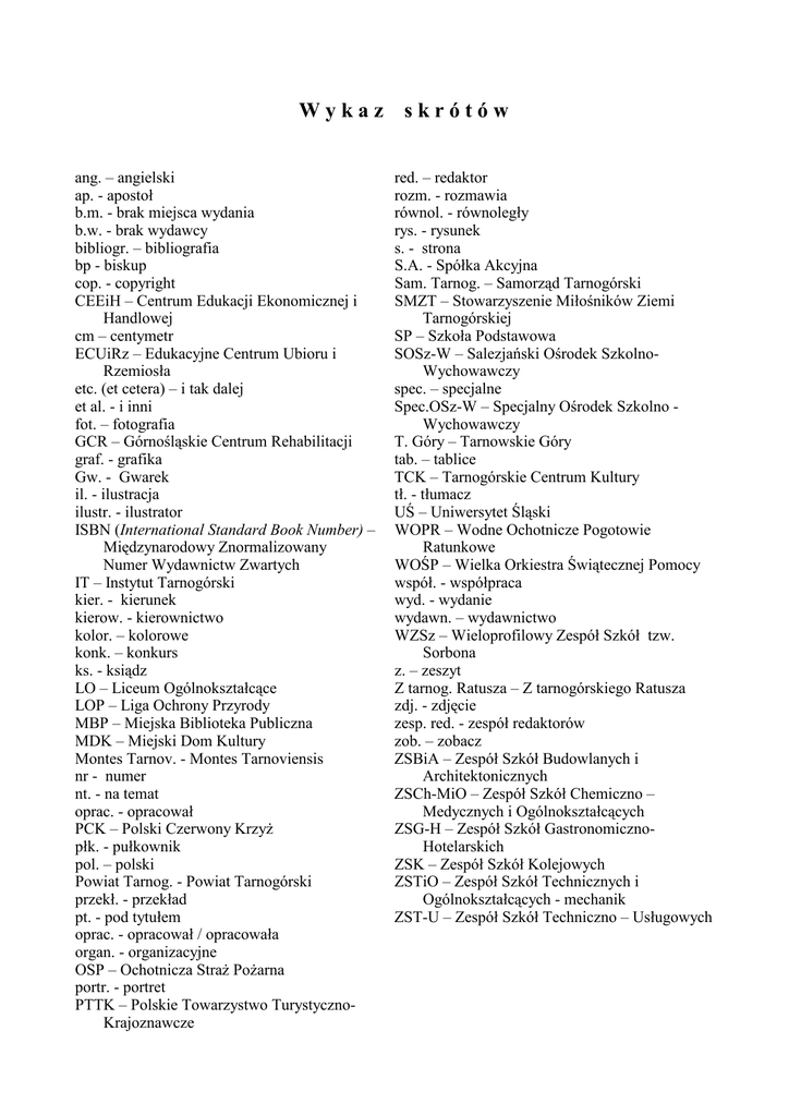 Wykaz skrótów ang. – angielski ap. - apostoł b.m. - brak miejsca wydania b.w. - brak wydawcy bibliogr. – bibliografia bp - biskup cop. - copyright CEEiH – Centrum Edukacji Ekonomicznej i Handlowej cm – centymetr ECUiRz – Edukacyjne Centrum Ubioru i Rzemiosła etc. (et cetera) – i tak dalej et al. - i inni fot. – fotografia GCR – Górnośląskie Centrum Rehabilitacji graf. - grafika Gw. - Gwarek il. - ilustracja ilustr. - ilustrator ISBN (International Standard Book Number) – Międzynarodowy Znormalizowany Numer Wydawnictw Zwartych IT – Instytut Tarnogórski kier. - kierunek kierow. - kierownictwo kolor. – kolorowe konk. – konkurs ks. - ksiądz LO – Liceum Ogólnokształcące LOP – Liga Ochrony Przyrody MBP – Miejska Biblioteka Publiczna MDK – Miejski Dom Kultury Montes Tarnov. - Montes Tarnoviensis nr - numer nt. - na temat oprac. - opracował PCK – Polski Czerwony KrzyŜ płk. - pułkownik pol. – polski Powiat Tarnog. - Powiat Tarnogórski przekł. - przekład pt. - pod tytułem oprac. - opracował / opracowała organ. - organizacyjne OSP – Ochotnicza StraŜ PoŜarna portr. - portret PTTK – Polskie Towarzystwo TurystycznoKrajoznawcze red. – redaktor rozm. - rozmawia równol. - równoległy rys. - rysunek s. - strona S.A. - Spółka Akcyjna Sam. Tarnog. – Samorząd Tarnogórski SMZT – Stowarzyszenie Miłośników Ziemi Tarnogórskiej SP – Szkoła Podstawowa SOSz-W – Salezjański Ośrodek SzkolnoWychowawczy spec. – specjalne Spec.OSz-W – Specjalny Ośrodek Szkolno Wychowawczy T. Góry – Tarnowskie Góry tab. – tablice TCK – Tarnogórskie Centrum Kultury tł. - tłumacz UŚ – Uniwersytet Śląski WOPR – Wodne Ochotnicze Pogotowie Ratunkowe WOŚP – Wielka Orkiestra Świątecznej Pomocy współ. - współpraca wyd. - wydanie wydawn. – wydawnictwo WZSz – Wieloprofilowy Zespół Szkół tzw. Sorbona z. – zeszyt Z tarnog. Ratusza – Z tarnogórskiego Ratusza zdj. - zdjęcie zesp. red. - zespół redaktorów zob. – zobacz ZSBiA – Zespół Szkół Budowlanych i Architektonicznych ZSCh-MiO – Zespół Szkół Chemiczno – Medycznych i Ogólnokształcących ZSG-H – Zespół Szkół GastronomicznoHotelarskich ZSK – Zespół Szkół Kolejowych ZSTiO – Zespół Szkół Technicznych i Ogólnokształcących - mechanik ZST-U – Zespół Szkół Techniczno – Usługowych