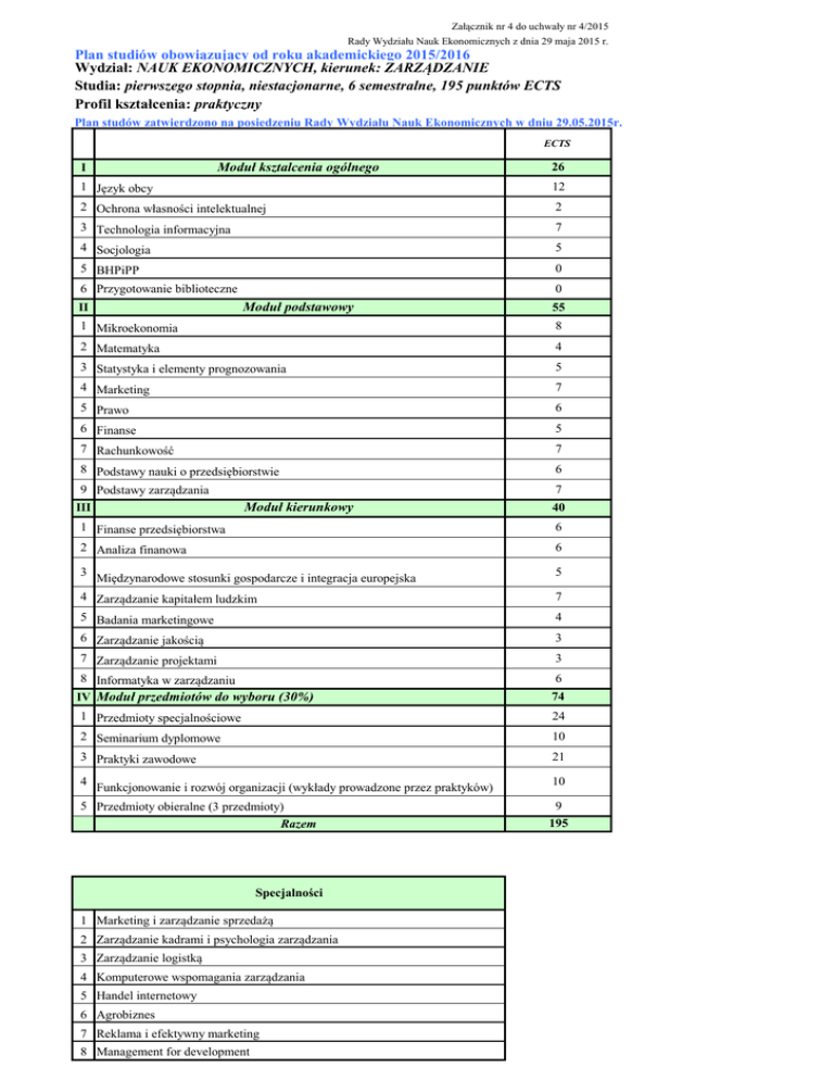 Załącznik nr 4 do uchwały nr 4/2015 Rady Wydziału Nauk Ekonomicznych z dnia 29 maja 2015 r. Plan studiów obowiązujący od roku akademickiego 2015/2016 Wydział: NAUK EKONOMICZNYCH, kierunek: ZARZĄDZANIE Studia: pierwszego stopnia, niestacjonarne, 6 semestralne, 195 punktów ECTS Profil kształcenia: praktyczny Plan studów zatwierdzono na posiedzeniu Rady Wydziału Nauk Ekonomicznych w dniu 29.05.2015r. ECTS Moduł ksztalcenia ogólnego I 26 1 Język obcy 12 2 Ochrona własności intelektualnej 2 3 Technologia informacyjna 7 4 Socjologia 5 5 BHPiPP 0 6 Przygotowanie biblioteczne 0 Moduł podstawowy II 55 1 Mikroekonomia 8 2 Matematyka 4 3 Statystyka i elementy prognozowania 5 4 Marketing 7 5 Prawo 6 6 Finanse 5 7 Rachunkowość 7 8 Podstawy nauki o przedsiębiorstwie 6 9 Podstawy zarządzania III Moduł kierunkowy 7 40 1 Finanse przedsiębiorstwa 6 2 Analiza finanowa 6 3 5 Międzynarodowe stosunki gospodarcze i integracja europejska 4 Zarządzanie kapitałem ludzkim 7 5 Badania marketingowe 4 6 Zarządzanie jakością 3 7 Zarządzanie projektami 3 8 Informatyka w zarządzaniu IV Moduł przedmiotów do wyboru (30%) 6 74 1 Przedmioty specjalnościowe 24 2 Seminarium dyplomowe 10 3 Praktyki zawodowe 21 4 10 Funkcjonowanie i rozwój organizacji (wykłady prowadzone przez praktyków) 5 Przedmioty obieralne (3 przedmioty) Razem Specjalności 1 Marketing i zarządzanie sprzedażą 2 Zarządzanie kadrami i psychologia zarządzania 3 Zarządzanie logistką 4 Komputerowe wspomagania zarządzania 5 Handel internetowy 6 Agrobiznes 7 Reklama i efektywny marketing 8 Management for development 9 195