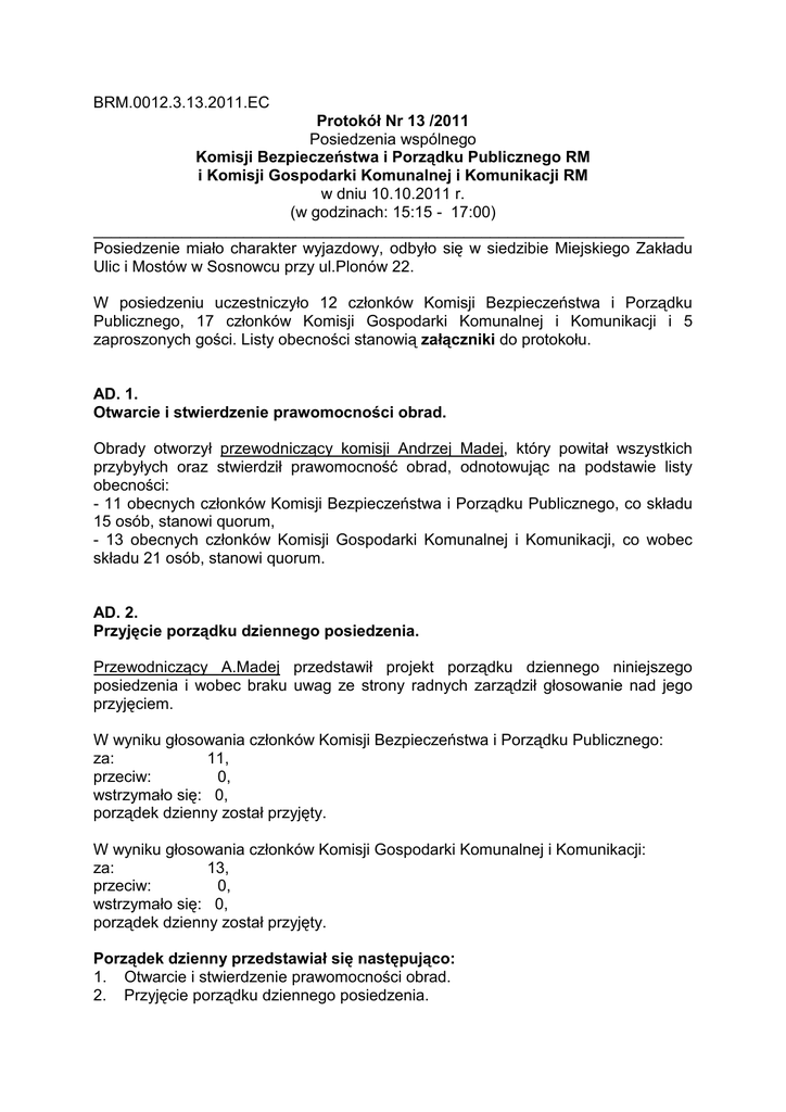 BRM.0012.3.13.2011.EC Protokół Nr 13 /2011 Posiedzenia wspólnego Komisji Bezpieczeństwa i Porządku Publicznego RM i Komisji Gospodarki Komunalnej i Komunikacji RM w dniu 10.10.2011 r. (w godzinach: 15:15 - 17:00) ___________________________________________________________________ Posiedzenie miało charakter wyjazdowy, odbyło się w siedzibie Miejskiego Zakładu Ulic i Mostów w Sosnowcu przy ul.Plonów 22. W posiedzeniu uczestniczyło 12 członków Komisji Bezpieczeństwa i Porządku Publicznego, 17 członków Komisji Gospodarki Komunalnej i Komunikacji i 5 zaproszonych gości. Listy obecności stanowią załączniki do protokołu. AD. 1. Otwarcie i stwierdzenie prawomocności obrad. Obrady otworzył przewodniczący komisji Andrzej Madej, który powitał wszystkich przybyłych oraz stwierdził prawomocność obrad, odnotowując na podstawie listy obecności: - 11 obecnych członków Komisji Bezpieczeństwa i Porządku Publicznego, co składu 15 osób, stanowi quorum, - 13 obecnych członków Komisji Gospodarki Komunalnej i Komunikacji, co wobec składu 21 osób, stanowi quorum. AD. 2. Przyjęcie porządku dziennego posiedzenia. Przewodniczący A.Madej przedstawił projekt porządku dziennego niniejszego posiedzenia i wobec braku uwag ze strony radnych zarządził głosowanie nad jego przyjęciem. W wyniku głosowania członków Komisji Bezpieczeństwa i Porządku Publicznego: za: 11, przeciw: 0, wstrzymało się: 0, porządek dzienny został przyjęty. W wyniku głosowania członków Komisji Gospodarki Komunalnej i Komunikacji: za: 13, przeciw: 0, wstrzymało się: 0, porządek dzienny został przyjęty. Porządek dzienny przedstawiał się następująco: 1. Otwarcie i stwierdzenie prawomocności obrad. 2. Przyjęcie porządku dziennego posiedzenia. 3. 4. Zatwierdzenie protokołu z poprzedniego posiedzenia. Informacja o przygotowaniach miasta do okresu zimowego w kontekście oceny stanu dróg i chodników dla pieszych. (Temat wspólny obu komisji). 5. Możliwość wystąpienia awaryjnego braku wody i energii elektrycznej lub cieplnej oraz sposoby postępowania dostawców i służb miejskich w sytuacjach takich zagrożeń. (Temat Komisji Bezpieczeństwa i Porządku Publicznego). 6. Zgłaszanie propozycji do planu pracy komisji na I półrocze 2012 rok. (Temat Komisji Bezpieczeństwa i Porządku Publicznego). 7. Sprawy bieżące: 7.1. Do wiadomości: sprawozdanie z działalności Straży Miejskiej w okresie: od 01.08.2011 r. do 31.08.2011 r. (Temat Komisji Bezpieczeństwa i Porządku Publicznego). AD. 3. Zatwierdzenie protokołu z poprzedniego posiedzenia. Przewodniczący A.Madej przedstawił Protokół Nr 11/2011 z posiedzenia Komisji Bezpieczeństwa i Porządku Publicznego w dniu 24.08.2011 r. i wobec braku uwag ze strony członków komisji zarządził głosowania nad jego przyjęciem. W wyniku głosowania: za: 12, przeciw: 0, wstrzymało się: 0, komisja przyjęła w/w protokół. AD.4. Informacja o przygotowaniach miasta do okresu zimowego w kontekście oceny stanu dróg i chodników dla pieszych. (Temat wspólny obu komisji). Przewodniczący A.Madej zaznaczył, że materiały tematyczne zostały przygotowane przez Miejski Zakład Ulic i Mostów oraz Wydział Organizacji Zarządzania Drogami i Ruchem Drogowym. Stanowią one załączniki do protokołu. Jednocześnie przypomniał, że Komisja Gospodarki Komunalnej i Komunikacji na posiedzeniu wrześniowym miała omawiać podobny temat dotyczący przygotowania do ”Akcji Zimna” w sezonie 2011/2012 i proponuje się wspólne omówienie tego tematu. Następnie poprosił dyrektora Miejskiego Zakładu Ulic i Mostów (MZUiM) o omówienie tego tematu. Dyrektor MZUiM Grzegorz Barczyk zreferował całość zagadnienia. Z kolei radni odbyli dyskusję w przedmiocie powyższego zagadnienia. Dodatkowo radni obu komisji, po zrealizowaniu porządku dziennego zapoznali się ze stanem obiektów oraz maszyn i sprzętów będących w dyspozycji Miejskiego Zakładu Ulic i Mostów. 2 AD.5. Możliwość wystąpienia awaryjnego braku wody i energii elektrycznej lub cieplnej oraz sposoby postępowania dostawców i służb miejskich w sytuacjach takich zagrożeń. (Temat Komisji Bezpieczeństwa i Porządku Publicznego). Przewodniczący A.Madej poinformował o przedłożonych komisji materiałach tematycznych przedłożonych przez Rejonowe Przedsiębiorstwo Wodociągów i Kanalizacji oraz Przedsiębiorstwo Wielobranżowe „ADM” oraz Wydział Gospodarki Komunalnej i Komunikacji. Stanowią one załączniki do protokołu Następnie przedstawiciele RPWiK oraz Wydziału Gospodarki Komunalnej i Mieszkaniowej omówili zagadnienie. Z kolei radni odbyli dyskusję w przedmiocie powyższego zagadnienia. AD.6. Zgłaszanie propozycji do planu pracy komisji na I półrocze 2012 rok. (Temat Komisji Bezpieczeństwa i Porządku Publicznego). Przewodniczący A.Madej poprosił radnych Komisji Bezpieczeństwa i Porządku Publicznego o składanie w terminie do 20.10.2011 r. propozycji tematów do planu pracy komisji i poinformował, że będzie on zatwierdzany na następnym posiedzeniu komisji. AD.7.1. Do wiadomości: sprawozdanie z działalności Straży Miejskiej w okresie: od 01.08.2011 r. do 31.08.2011 r. (Temat Komisji Bezpieczeństwa i Porządku Publicznego). Przewodniczący A.Madej poinformował o znajdującym się do wglądu radnych sprawozdaniu z działalności Straży Miejskiej za w/w okres. Stanowi ono załącznik do protokołu. Wobec wyczerpania zagadnień porządku dziennego przewodniczący A.Madej zamknął część stacjonarną posiedzenia i zaprosił radnych obu komisji do obejrzenia obiektów oraz maszyn i urządzeń będących w dyspozycji MZUiM. Protokół sporządziła Elżbieta Cichoń Przewodniczący Komisji Gospodarki Komunalnej i Komunikacji Przewodniczący Komisji Bezpieczeństwa i Porządku Publicznego Wojciech Kulawiak Andrzej Madej Sosnowiec, dnia 21.10.2011 r. 3 4